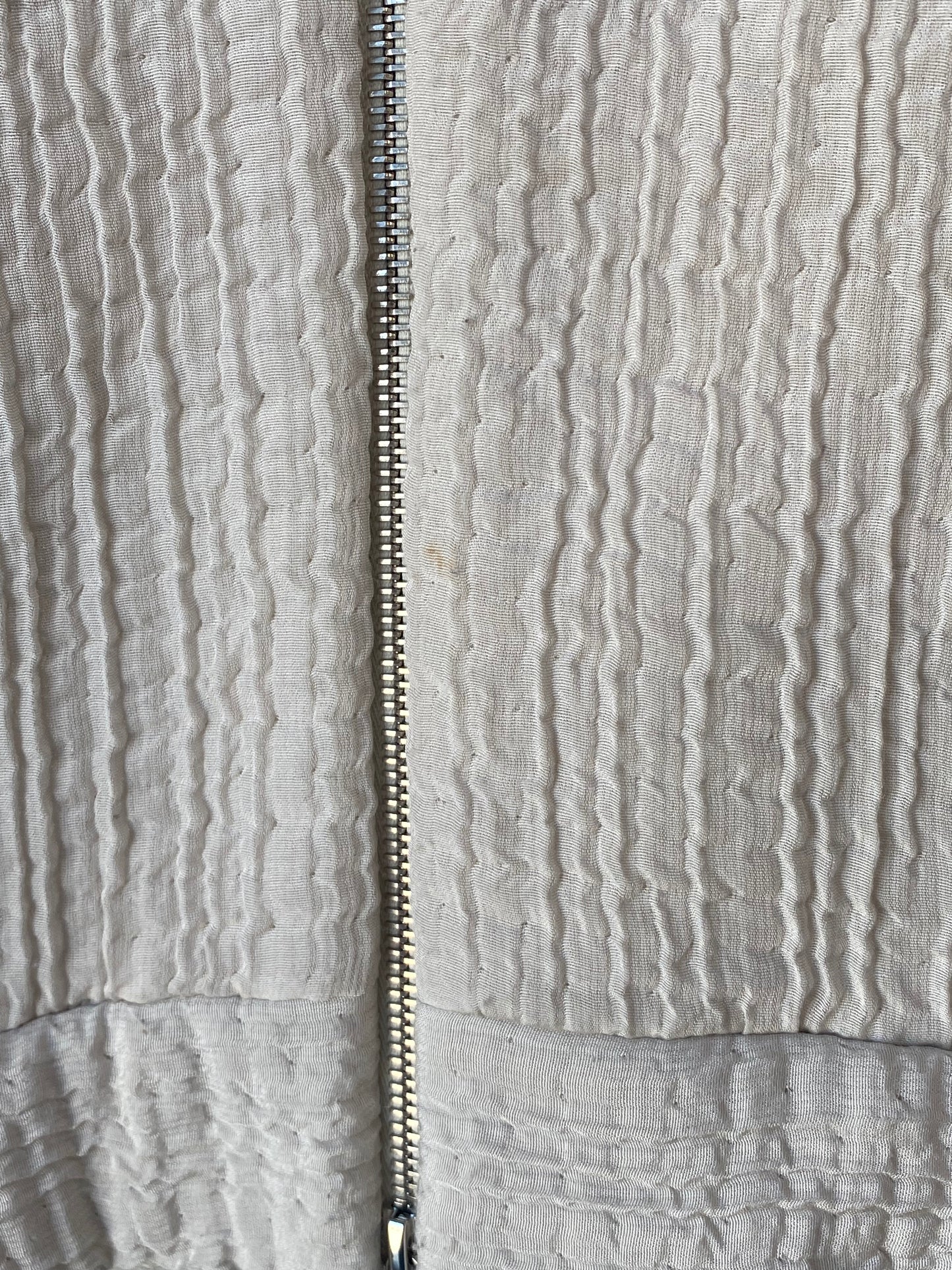 Zero Maria Cornejo Light Gray Quilted Jacket! Very sleek yet cozy. Features long sleeves, an elastic hemline, zipper up the front, and fun upside down pockets. Unlined. Polyester. Made in New York. Marked a size 10, please refer to measurements. In overall excellent condition with a very minor mark near the hem.