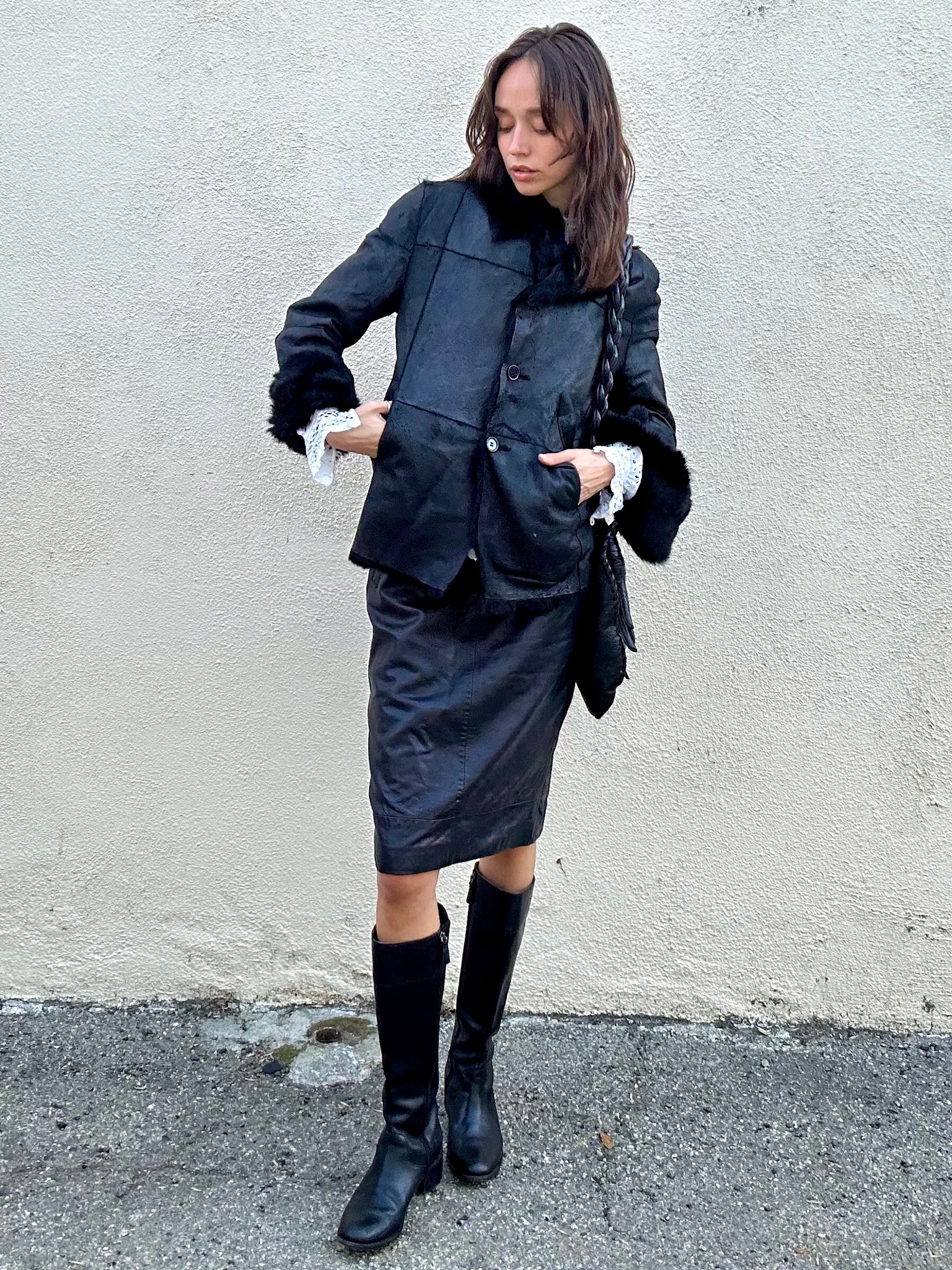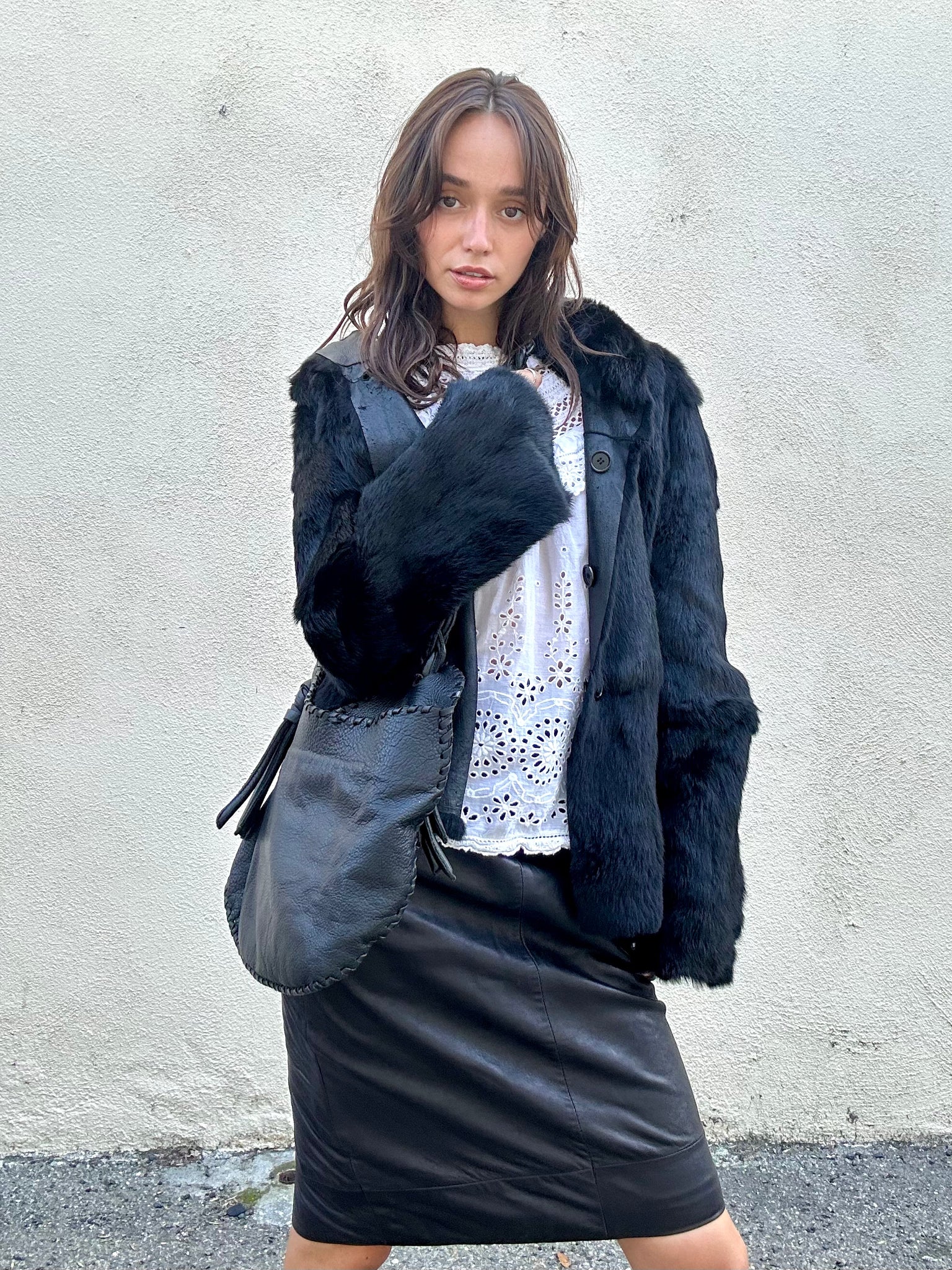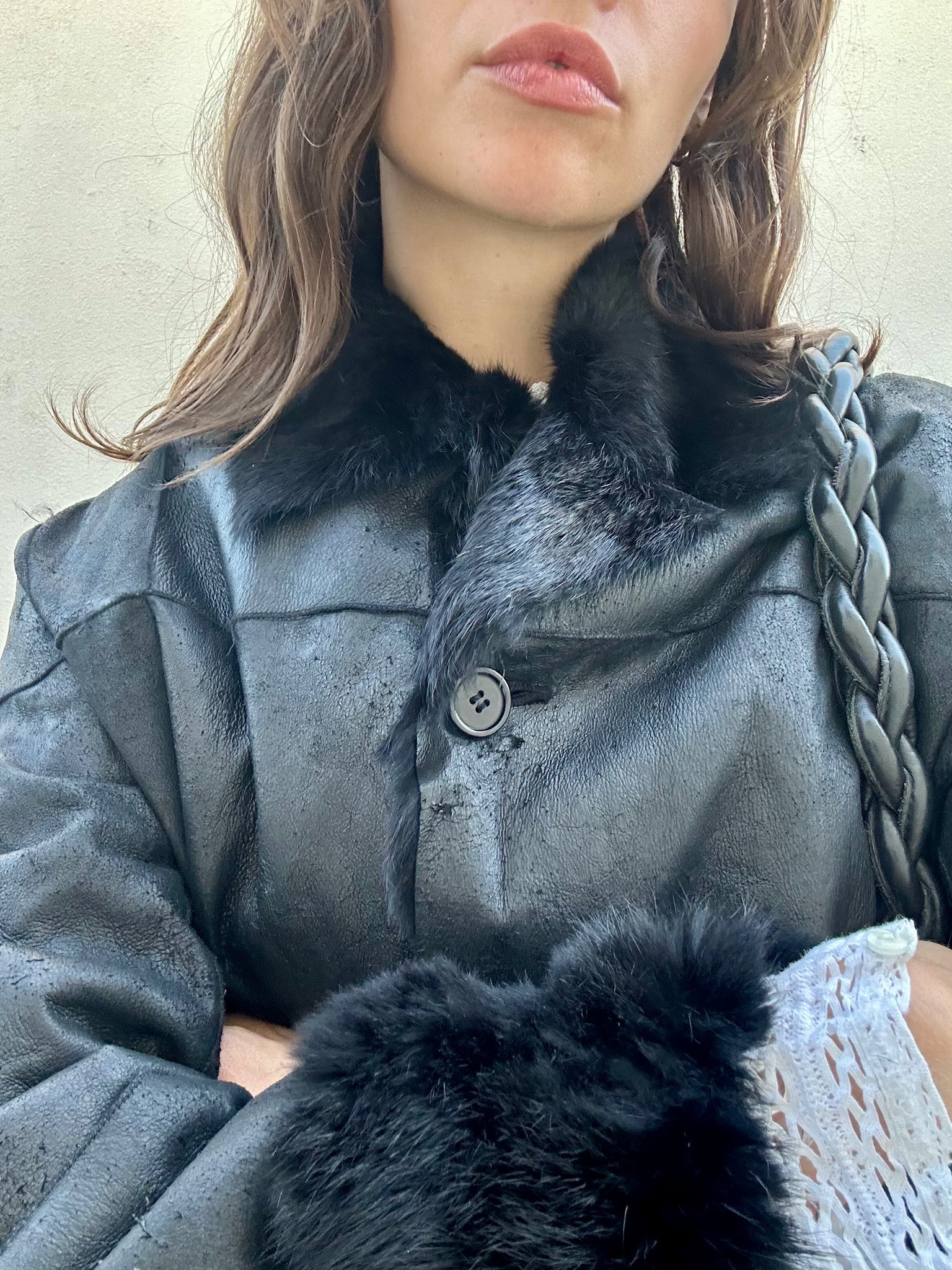 Vintage Ebene Black Fur Patchwork Jacket! Vintage condition with some distressing at outside and a few tiny chips out of the leather, here and there see photos. Patchwork fur sewn to be reversible. Has button front closure and pockets. 100% rabbit fur. Fits size S/M best.