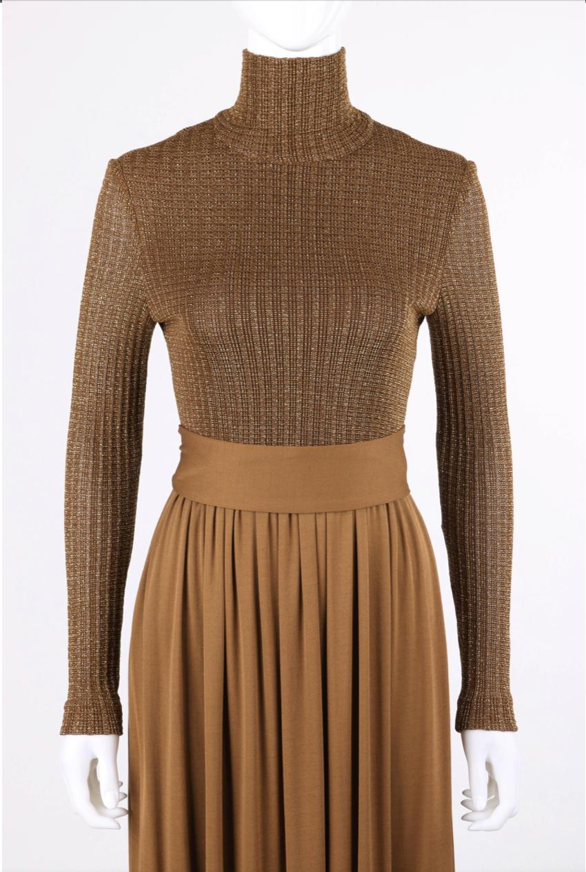RODRIGUES c.1970's Bronze Metallic Knit Long Sleeve Cocktail Evening Gown