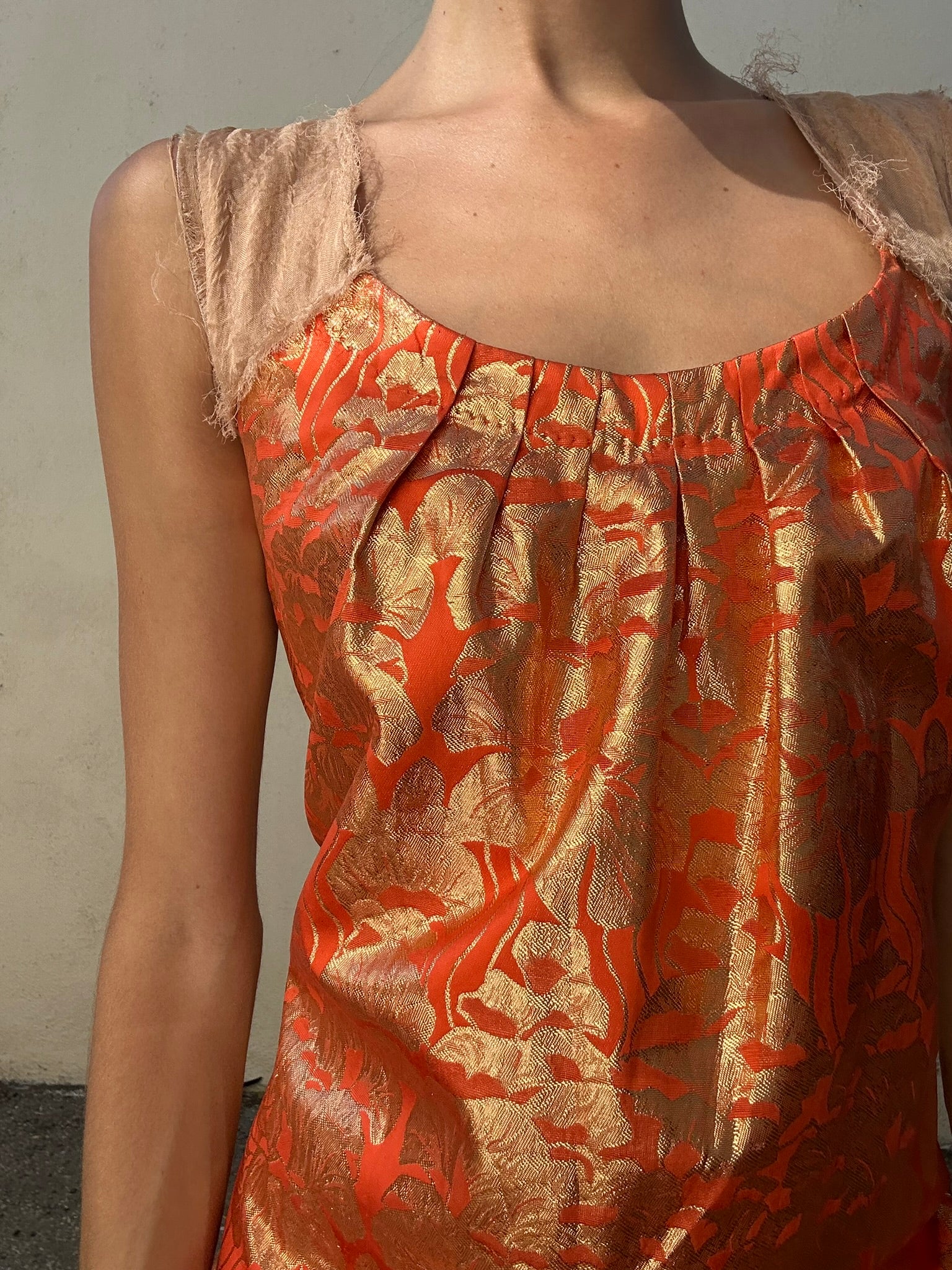 Step into the spotlight with the Alberta Ferretti Orange Gold Dress, adorned with a shimmering gold brocade floral pattern that dances with light. Playful nude raw silk straps, three inches wide, add a chic contrast and comfy support.