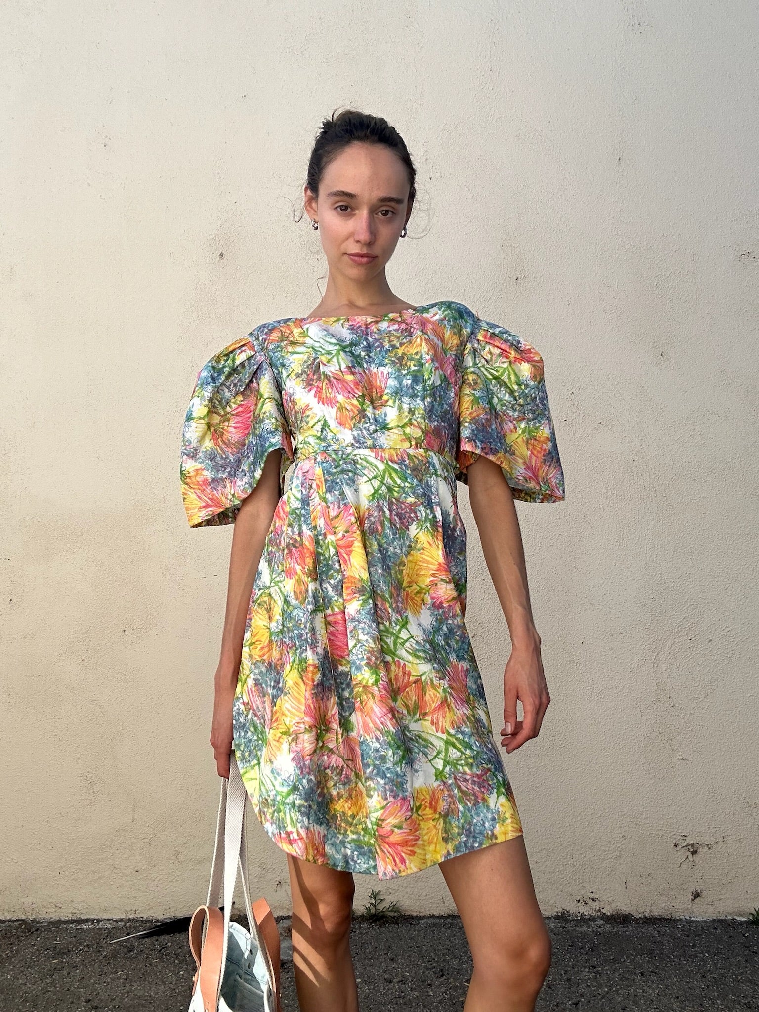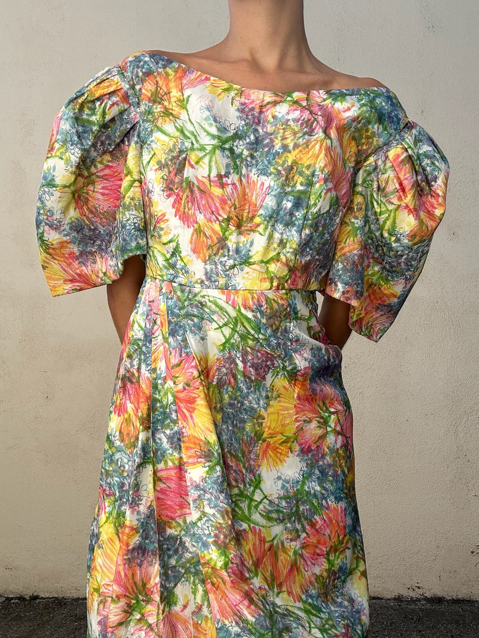 Multicolor Poly Dress. Hand sewn netted puff sleeves, unique pleated skirt and wide boat neck. Gorgeous vibrant floral. Fits size s/xs best. Sold as is.