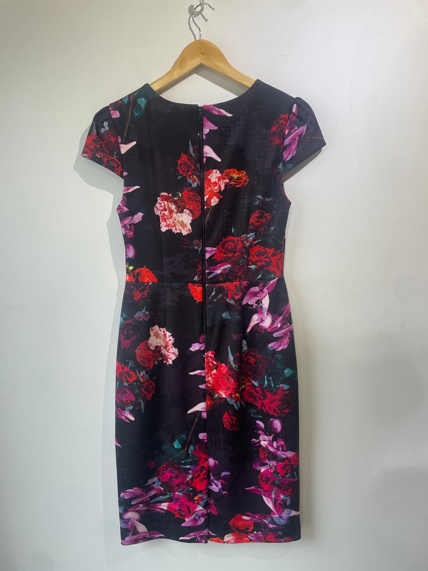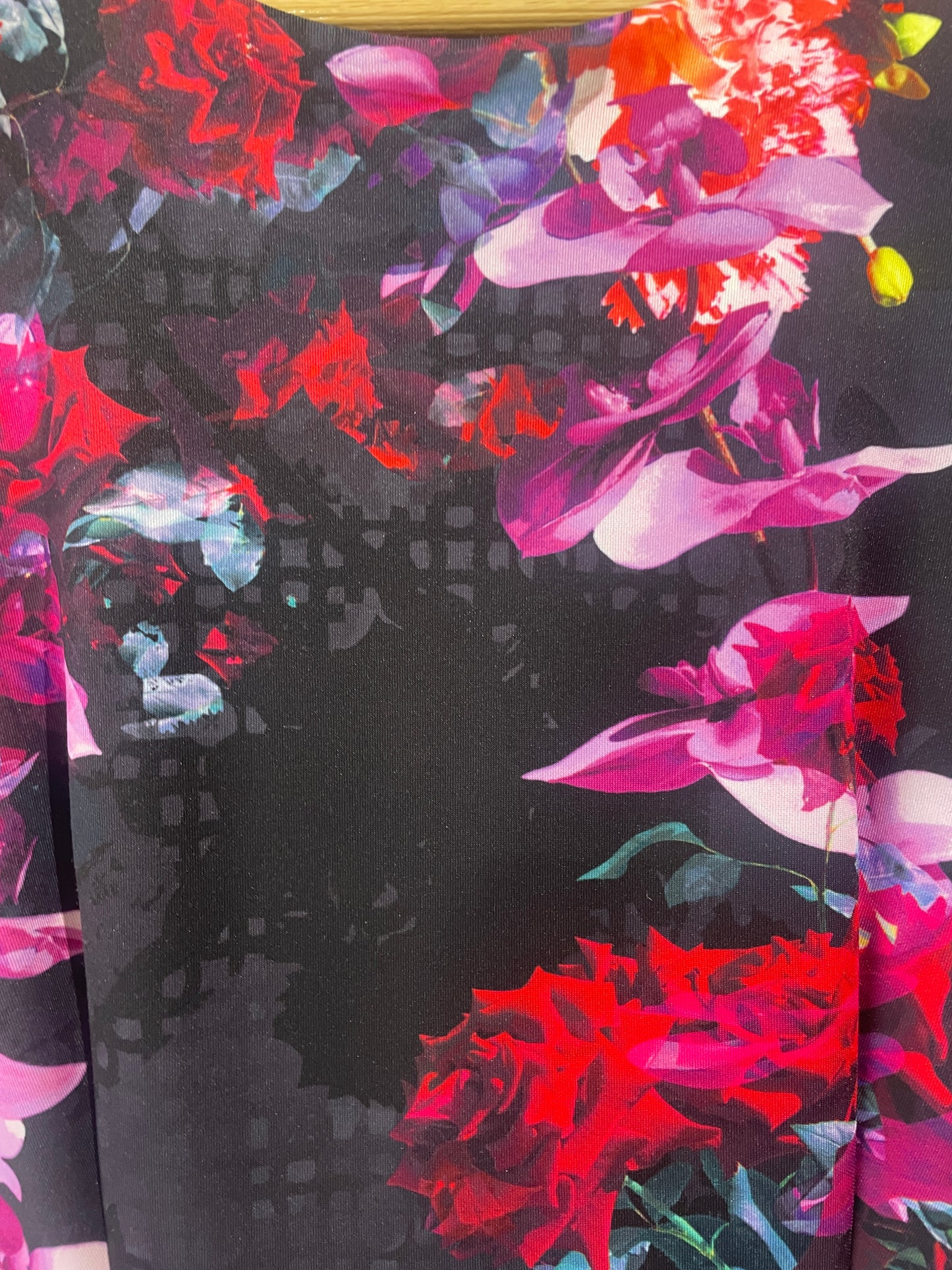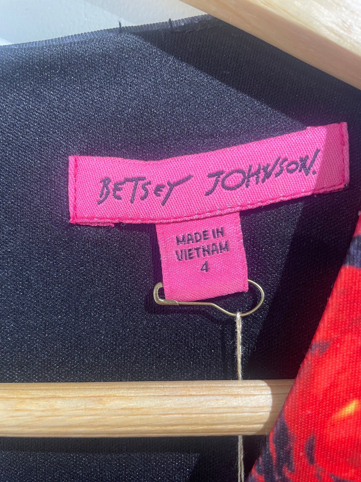 Betsey Johnson Floral Dress. Size 4. 94% polyester, 6% spandex, dry clean only. Nice and stretchy with zipper down the back, bright printed florals, and a liner inside.