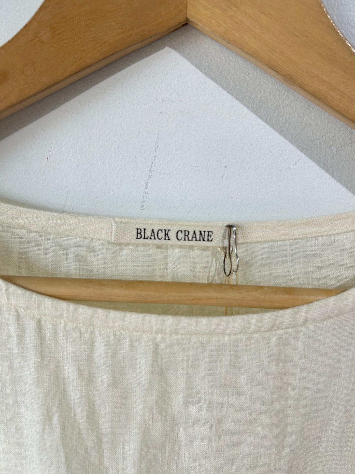 Black Crane Pale Yellow Linen Dress. Flowy, loose fit. Short sleeves, has pockets. Midi length. Drop waist. NWT. Marked size Small, best fits S/M/L due to flowy fit.