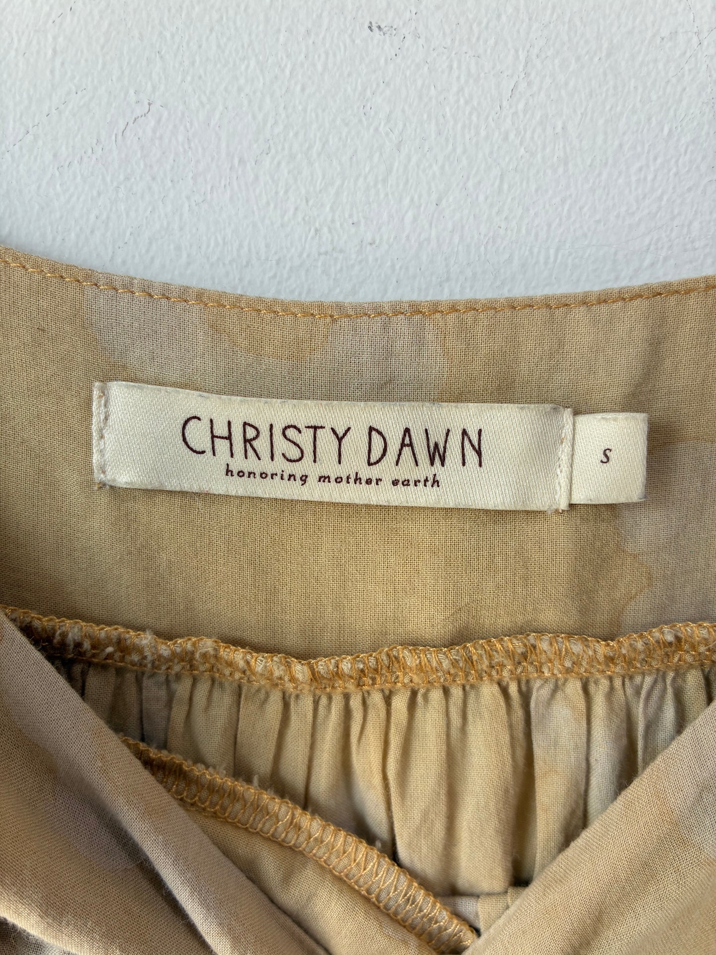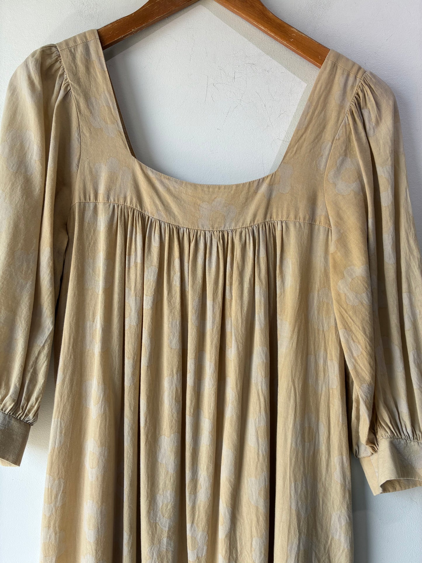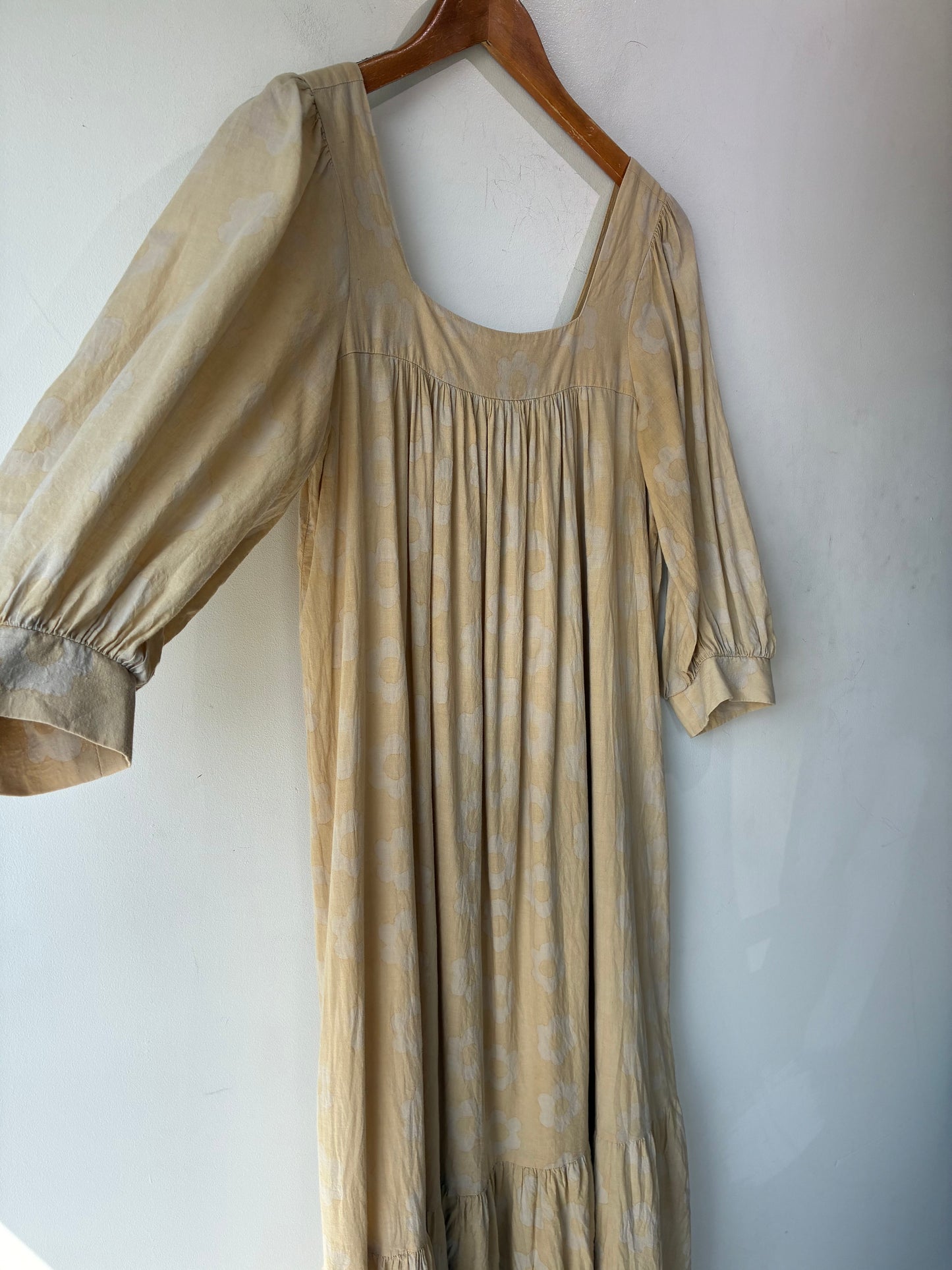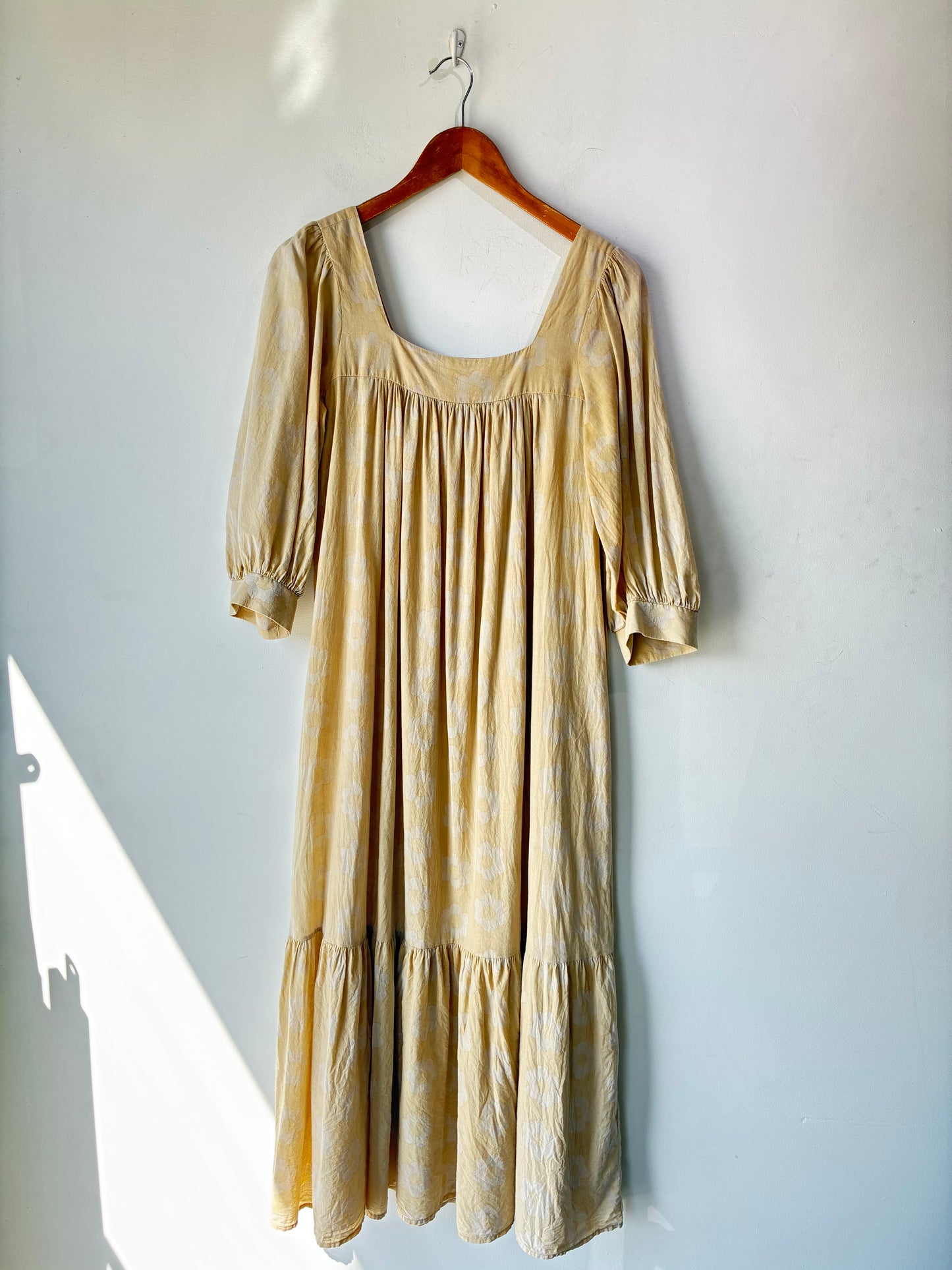 Christy Dawn Yellow Floral Bianca Dress. beautiful in it's simplicity, this organic cotton maxi dress features a muted, batik style floral block print, optional waist sash belt, a flattering squared gathered yoke neckline, 3/4 sleeve and a tiered bottom panel. With or without the belt, this ultra soft dress will undoubtedly become a closet staple. Dress is in excellent condition and is free of stains, tears and defects.
