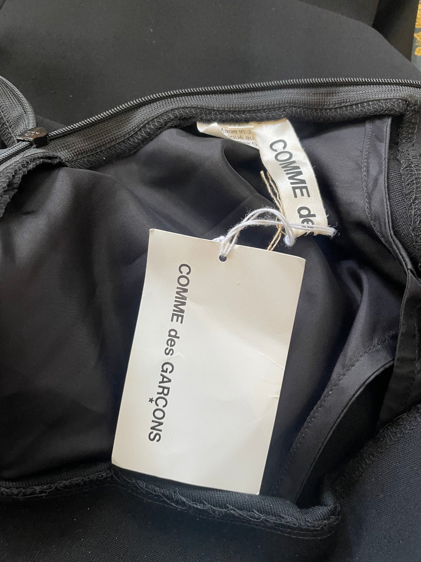 Comme des Garçons Asymmetrical Black Cape Dress. A wonderfully weird and funky shaped dress from your favorite CDG. Straight dress silhouette with attached bubbly cape piece. So playful and avant garde in design. Zippered back closure. In excellent condition with original tags. Made in Japan. Marked size XS, please refer to measurements.