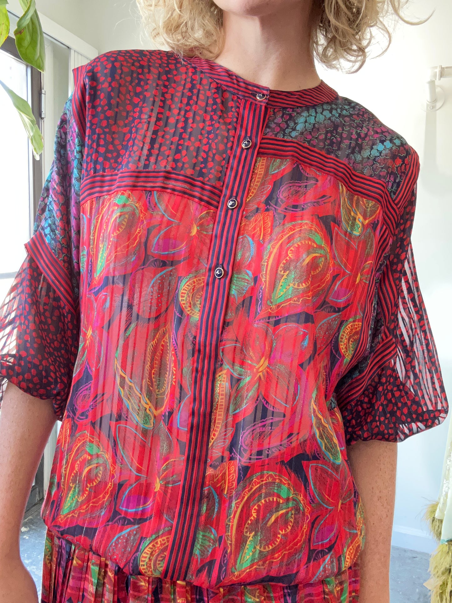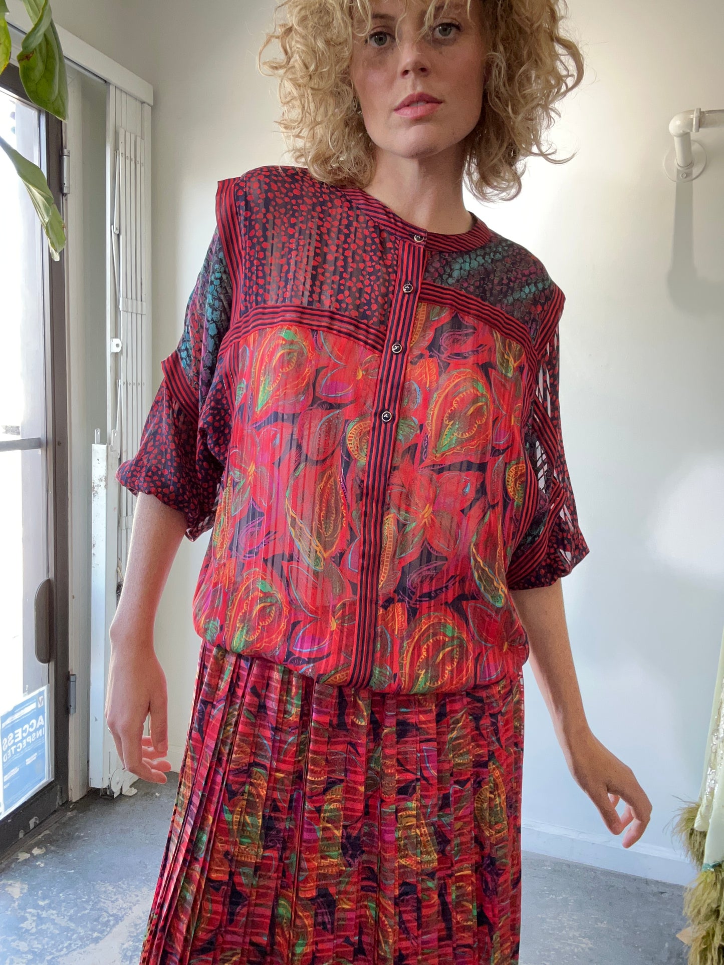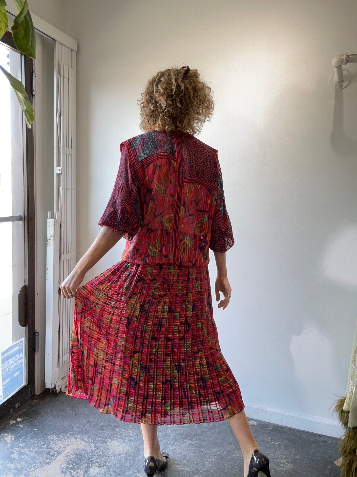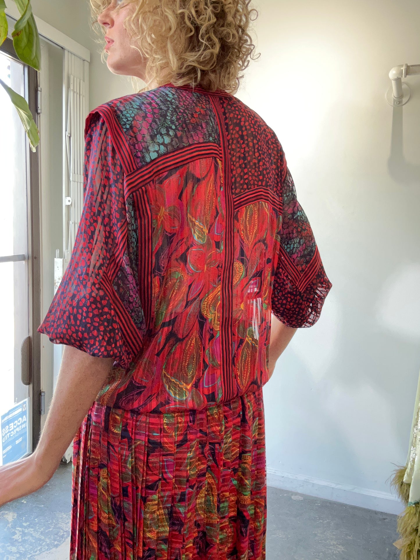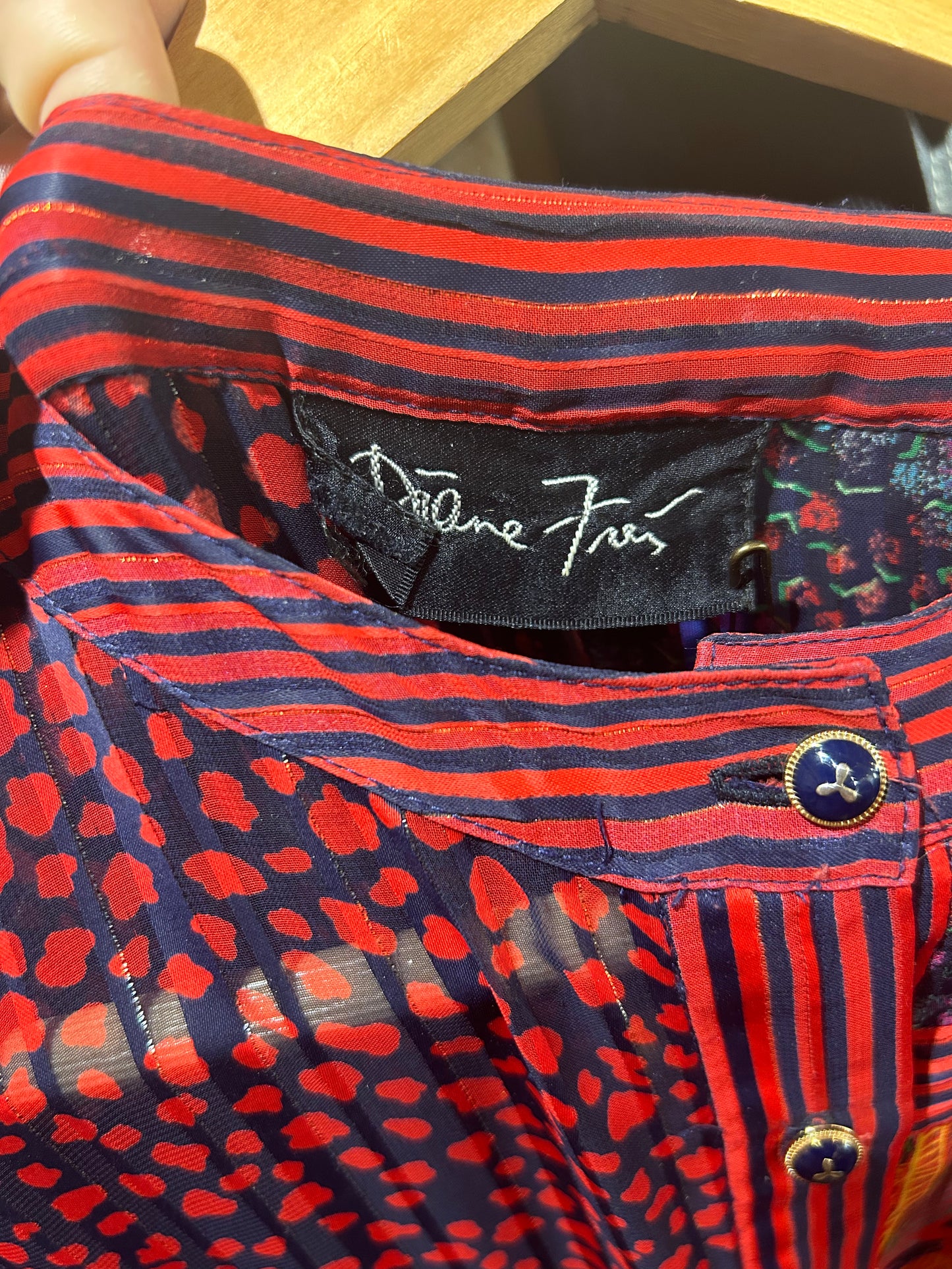 Diane Freis Multicolored Dress with Gold Thread. Fun and flouncy party dress with accordion pleated skirt, billowy sleeves that hit at the elbow, and loose bodice with small buttons going up the front. Midi length, colorful material is semi-sheer and light weight. Lined with a black interior slip. Drop waist is elastic for adjustable fit. Small panels sewn on the shoulders for a crisp shape. Such a great dress! In excellent, like-new condition. Unmarked material, feels like silk. Unmarked size, best fits a L.