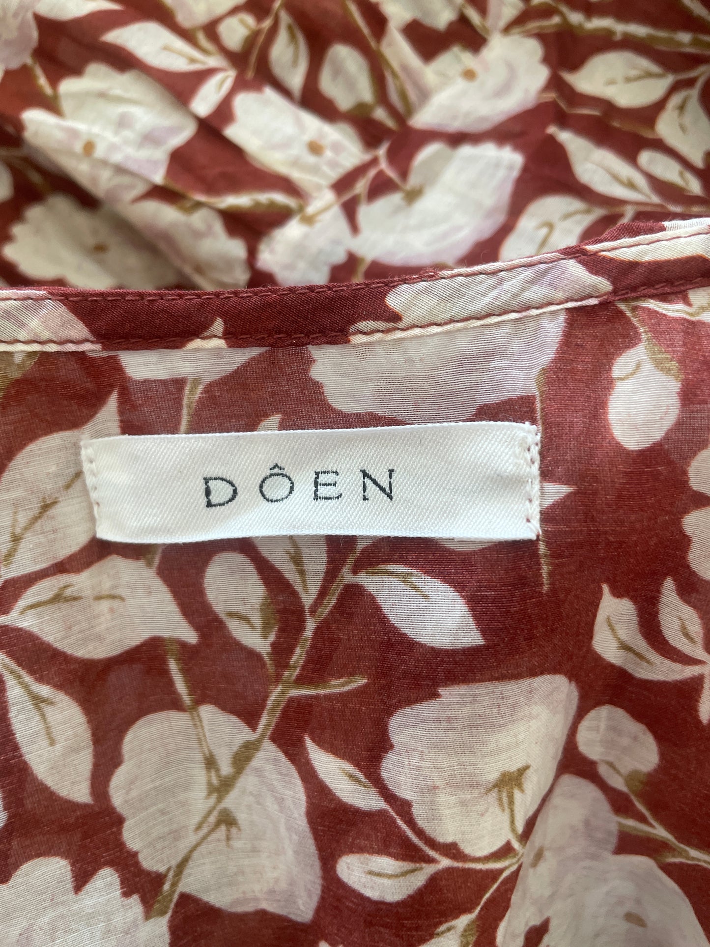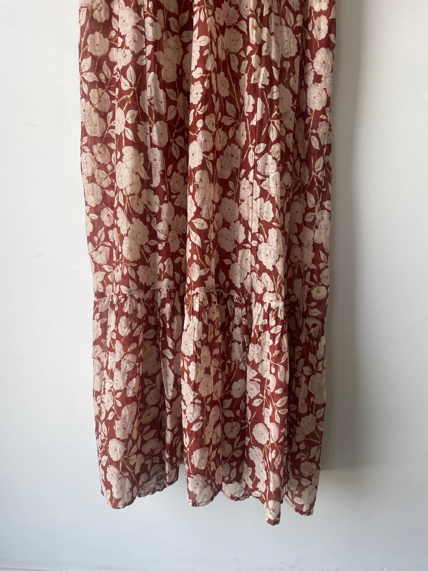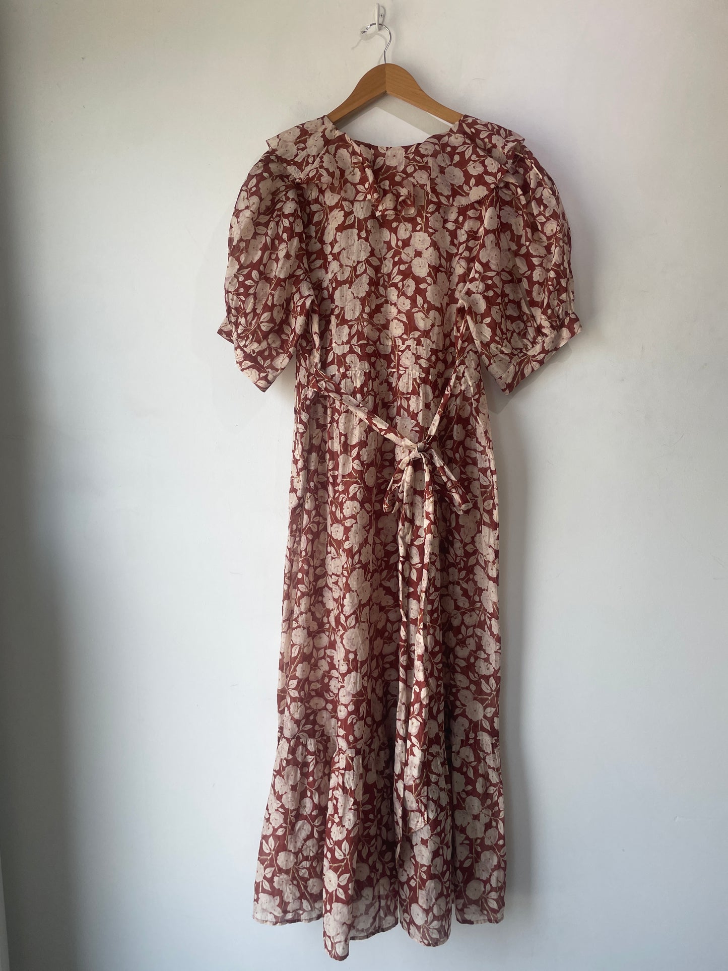 Doen Brown Floral Silk Rimbaud Dress. A beautiful long maxi dress in an all over floral pattern. Features ruffles on front neck and a ruffly puffed short sleeve. So so pretty with its intricate florals. 100% silk. In very good condition. Size XL, please refer to measurements.