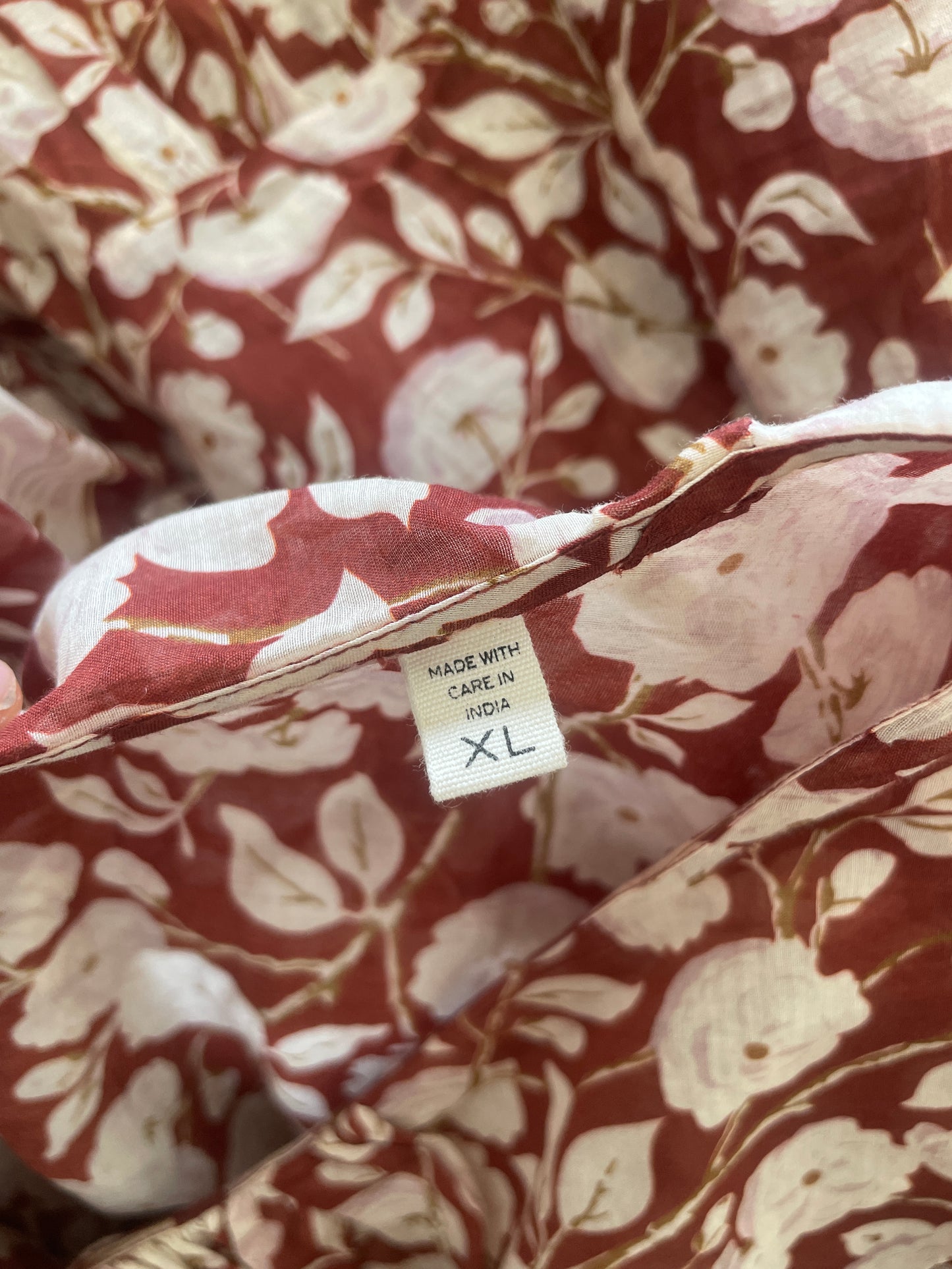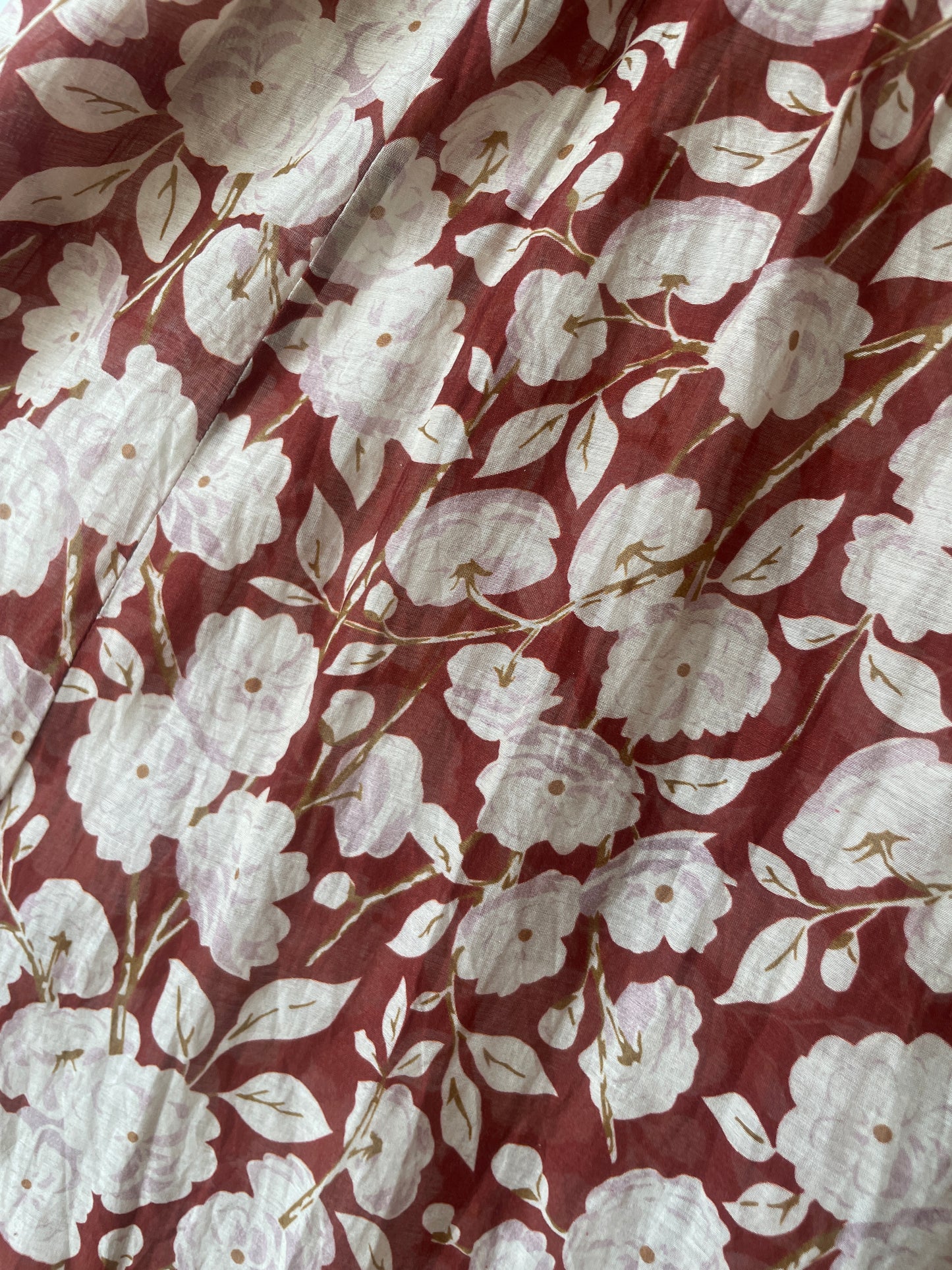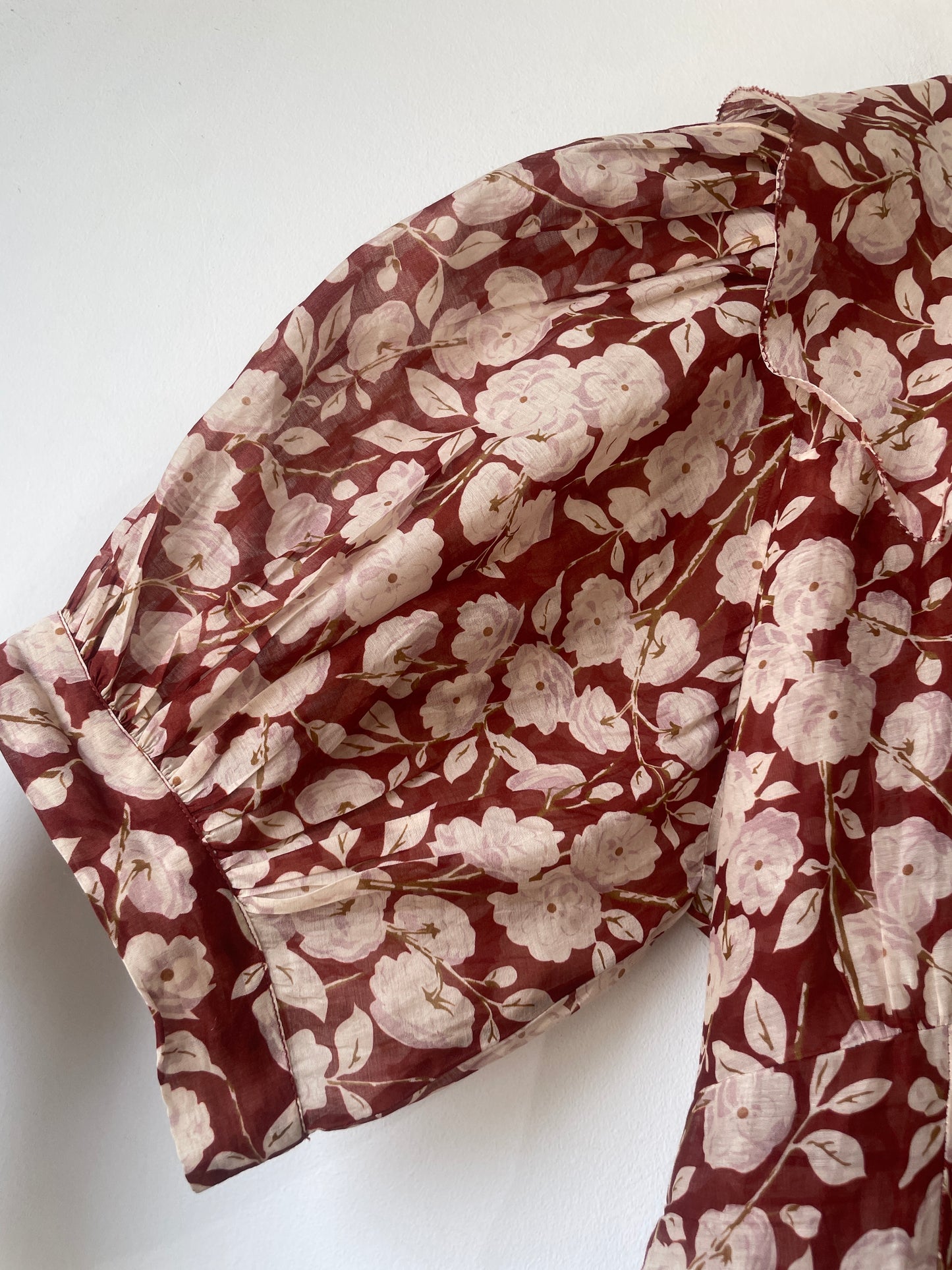 Doen Brown Floral Silk Rimbaud Dress. A beautiful long maxi dress in an all over floral pattern. Features ruffles on front neck and a ruffly puffed short sleeve. So so pretty with its intricate florals. 100% silk. In very good condition. Size XL, please refer to measurements.