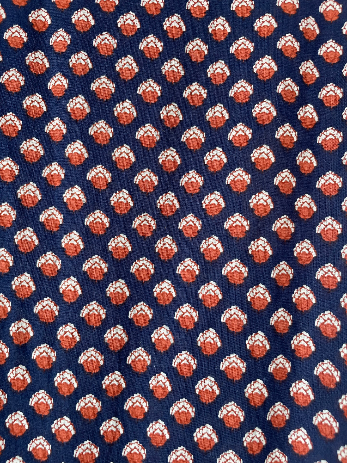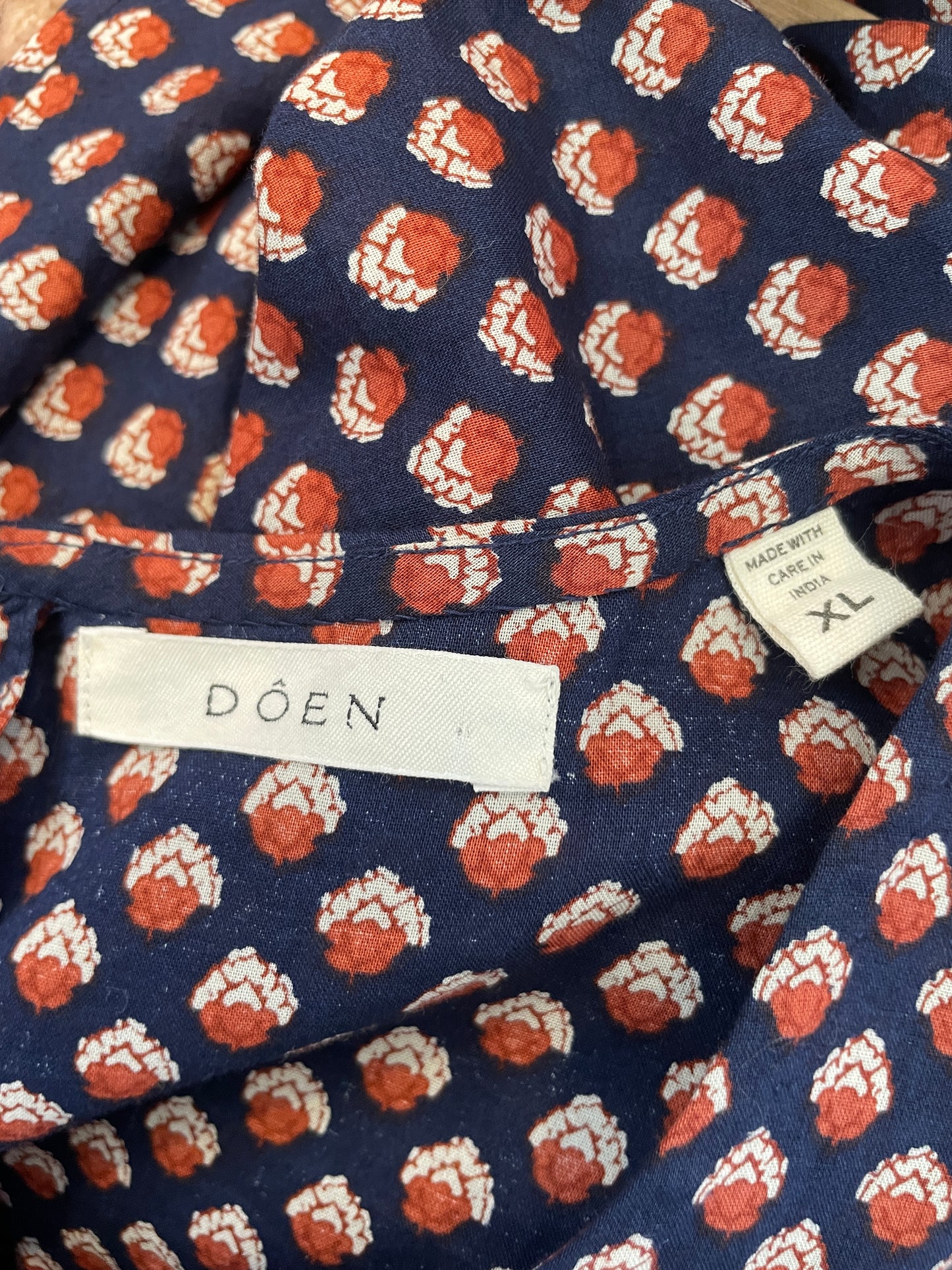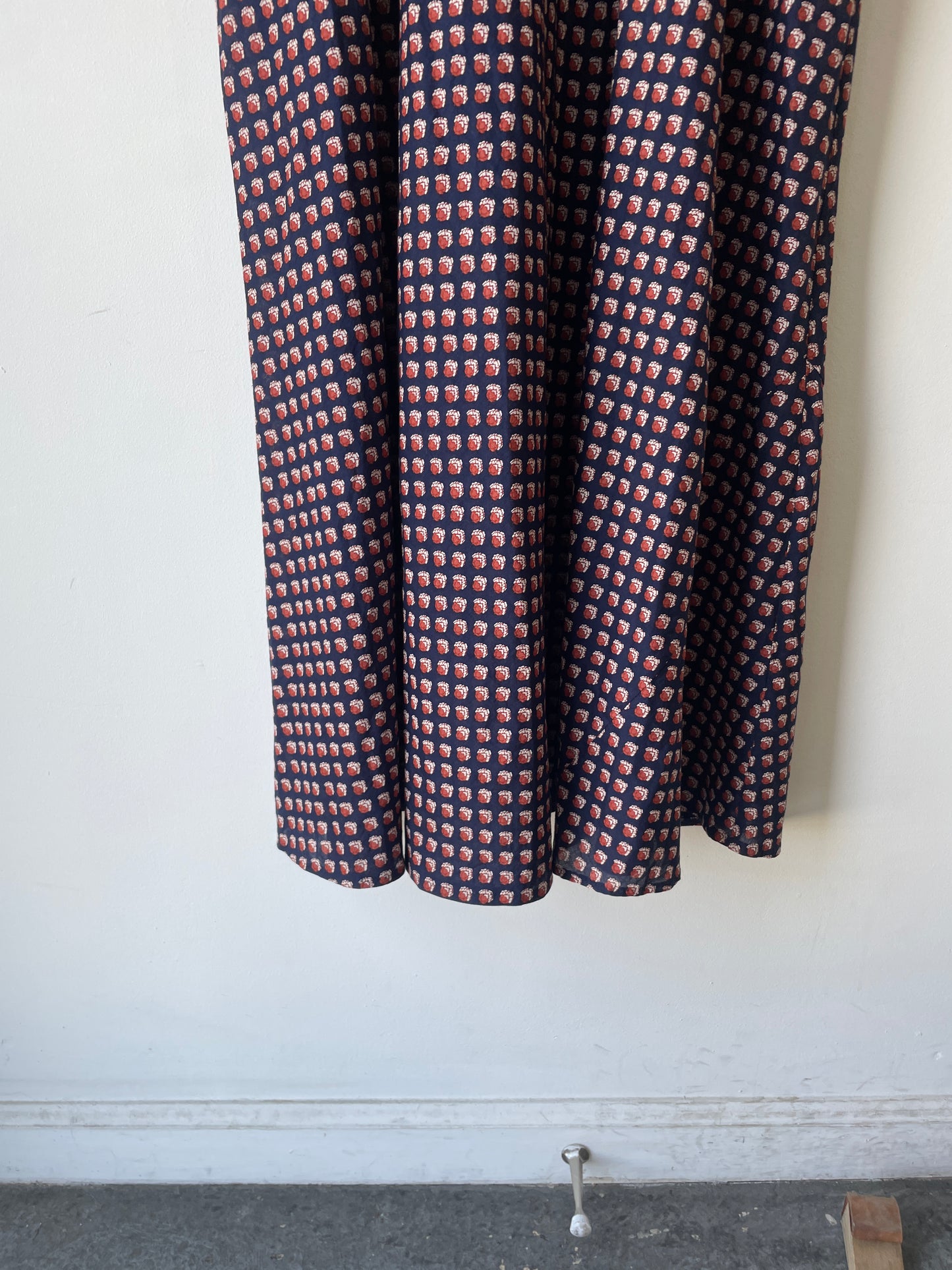 Doen Navy Rust Print Puffed Sleeve Vittoria Dress. A lovely puff-sleeve maxi skirt in a cool navy and rust print. V-shape in waist cut and side zip detailing. Simple and elegant. 100% organic cotton. Made in India. In excellent condition. Size XL, please refer to measurements.