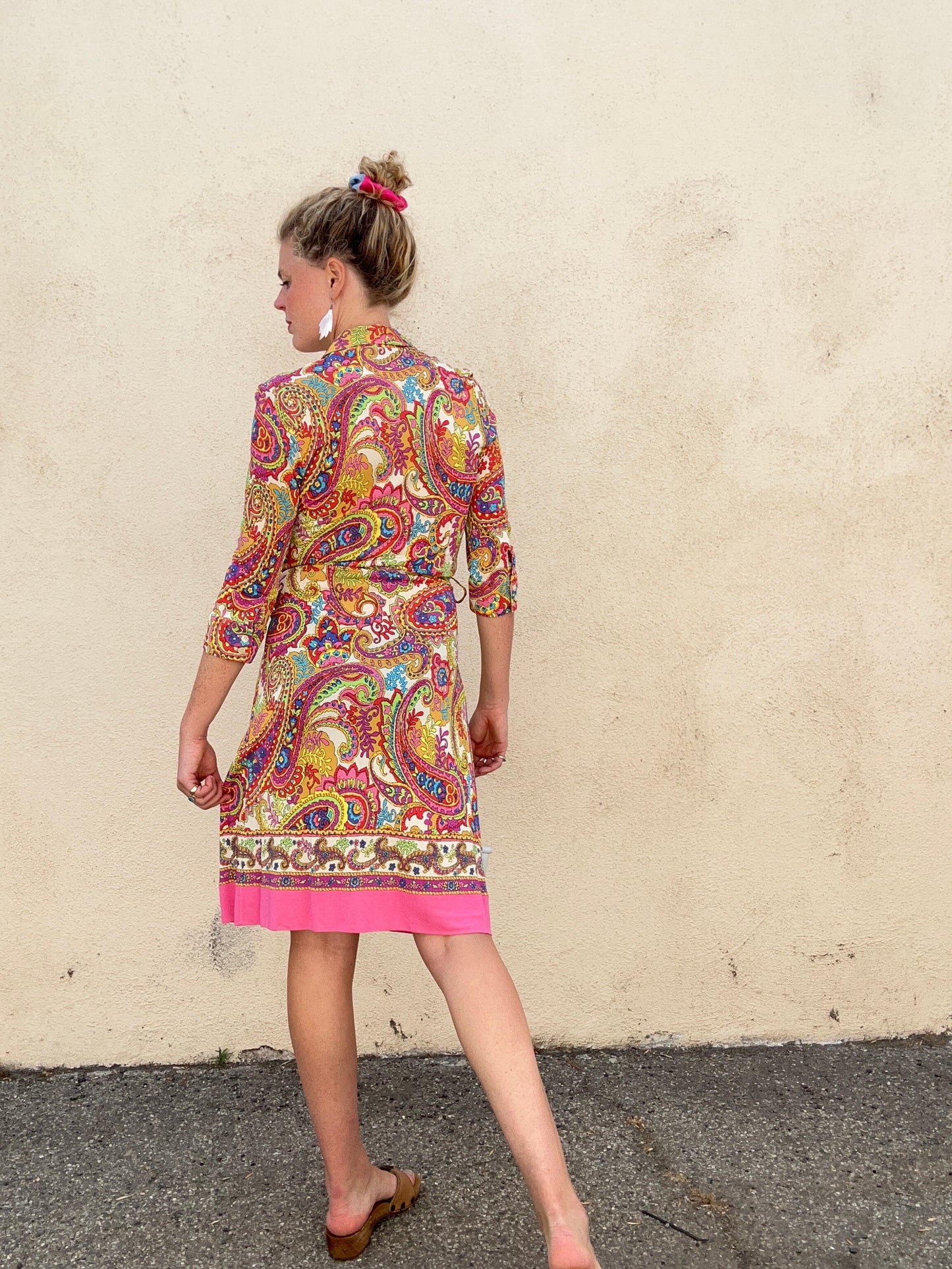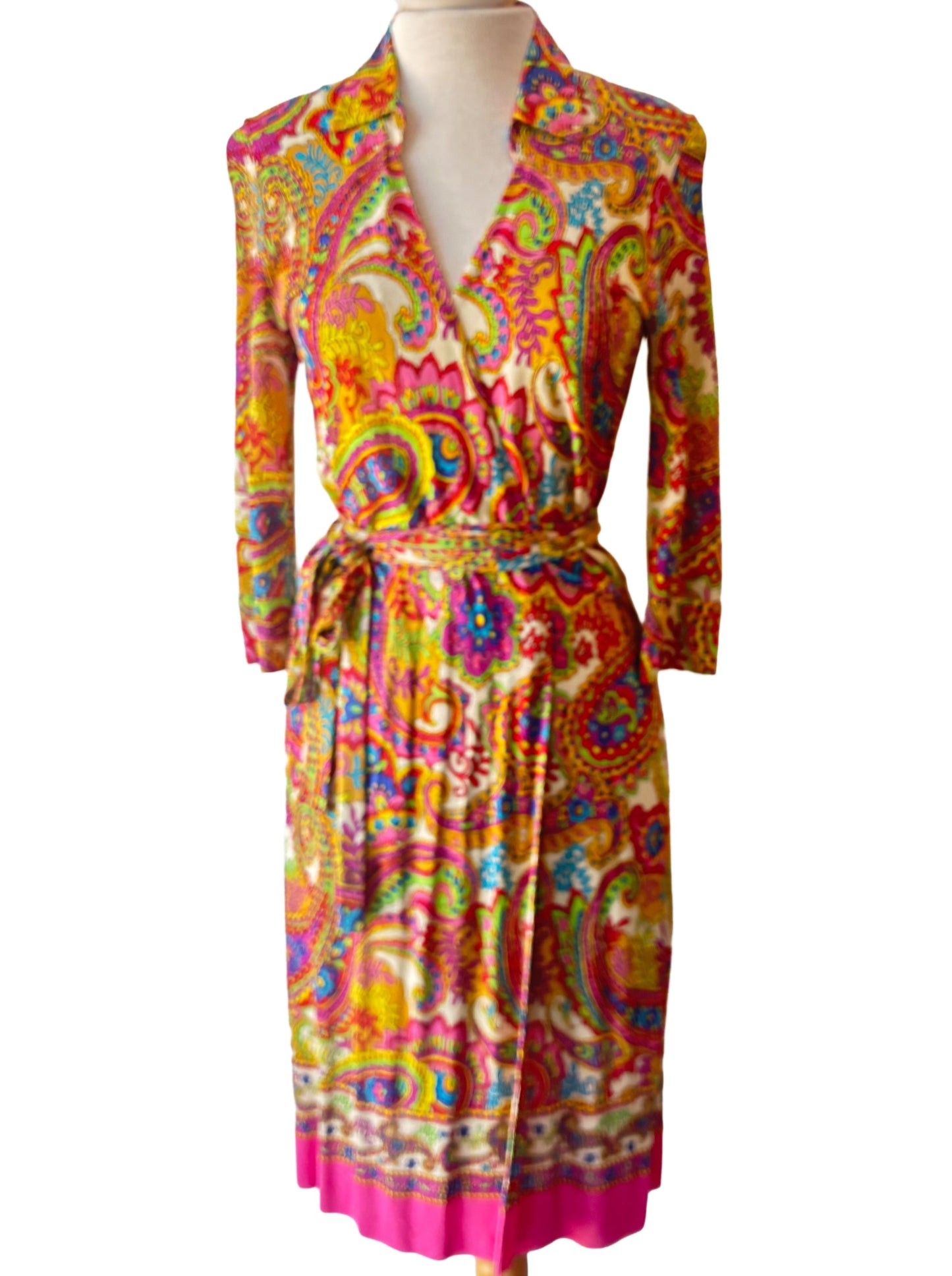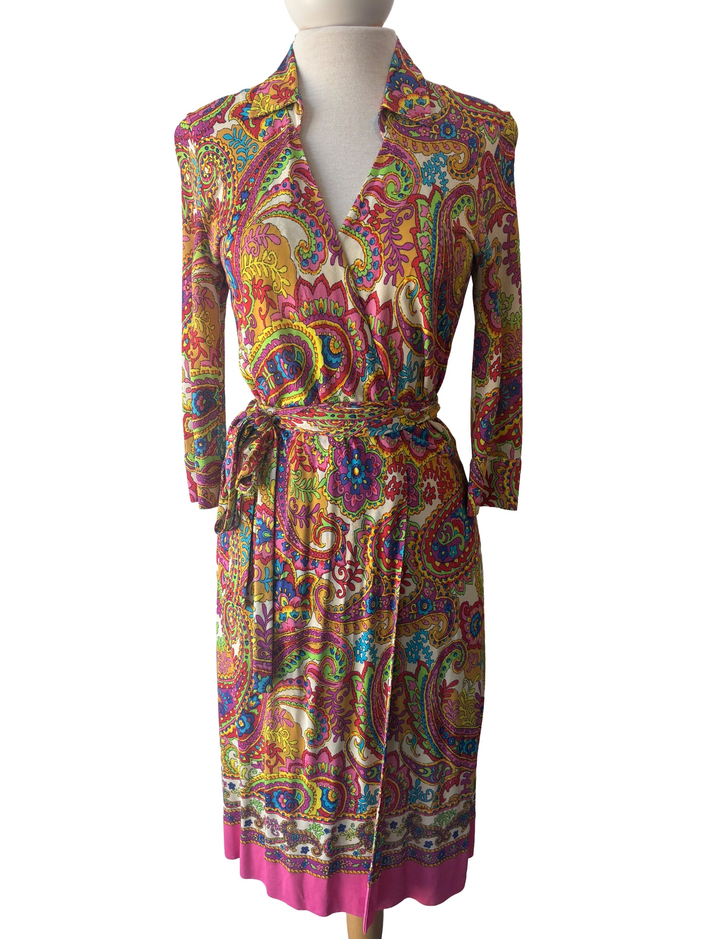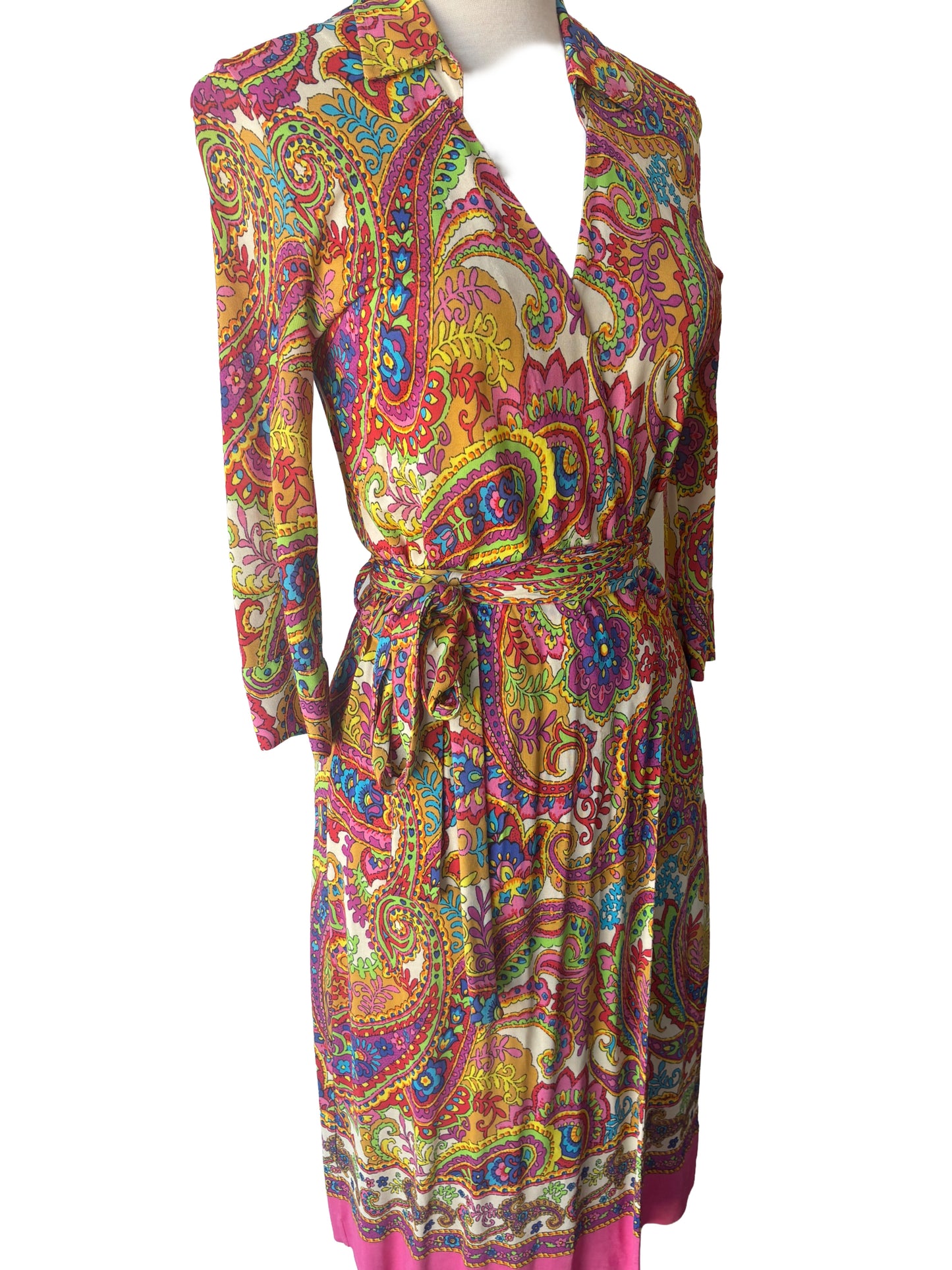 Wrap yourself in a swirl of 60s inspired charm with this colorful Dolce & Gabbana paisley print wrap dress, a playful nod to bohemian glamour with a polished twist. Featuring a tailored small collar and chic 3/4 length sleeves, this piece balances flirtation with finesse. The flattering wrap silhouette secures with an internal tie, discreet snaps, and a coordinating waist belt that cinches just right. In excellent condition, it’s a statement piece that doesn’t shout, just winks knowingly from across the room. Dress is free of notable flaws.