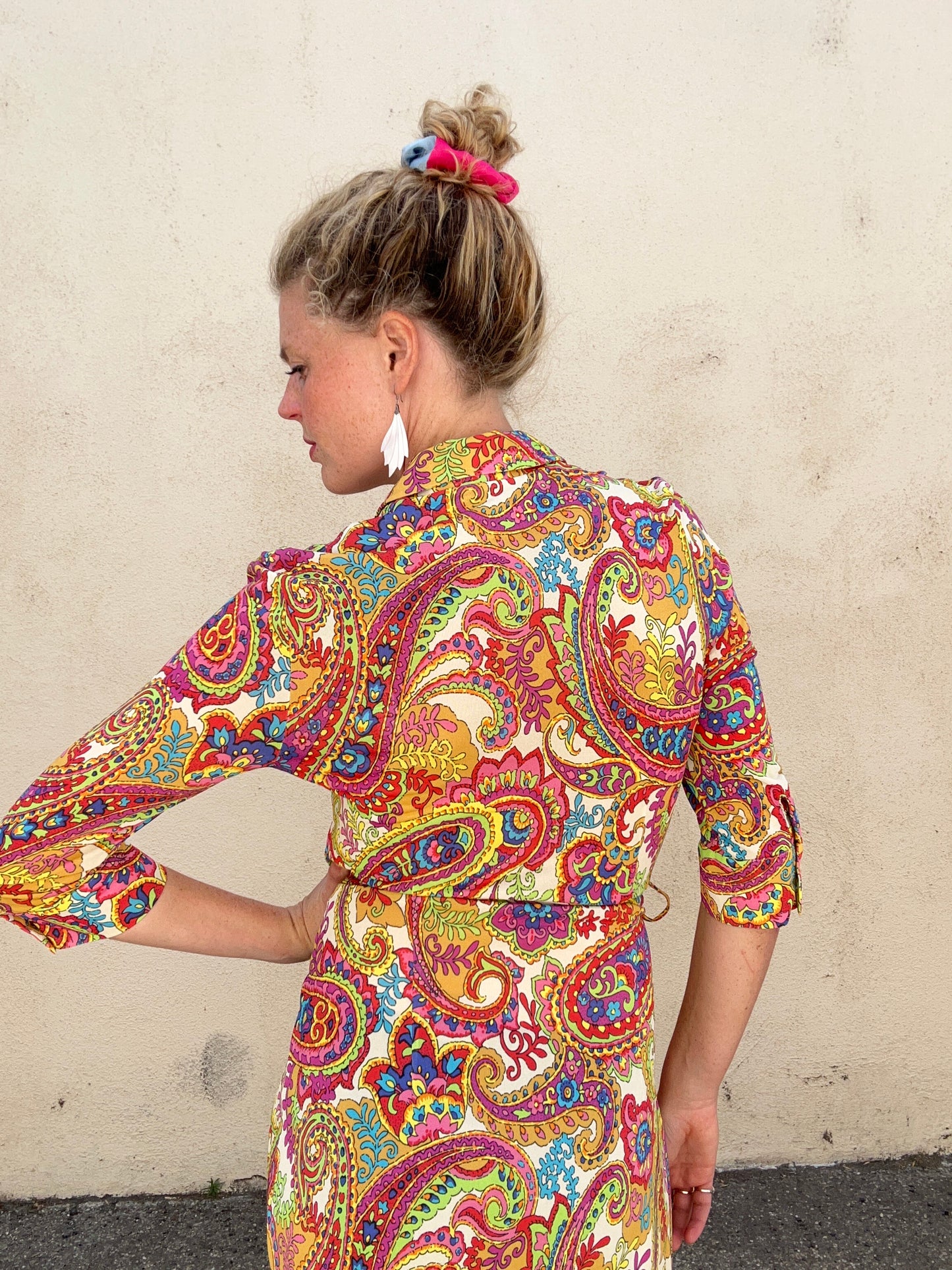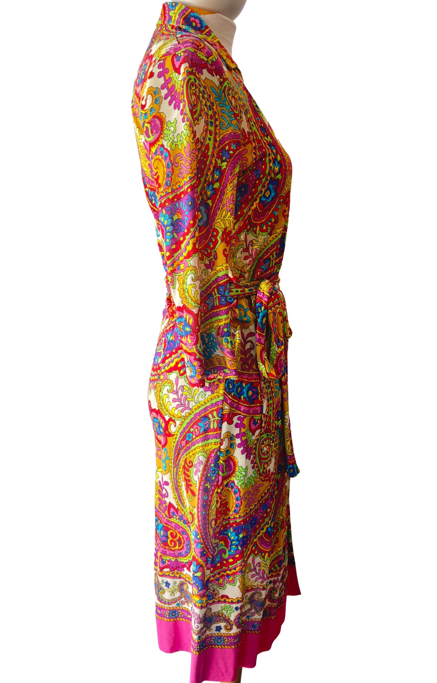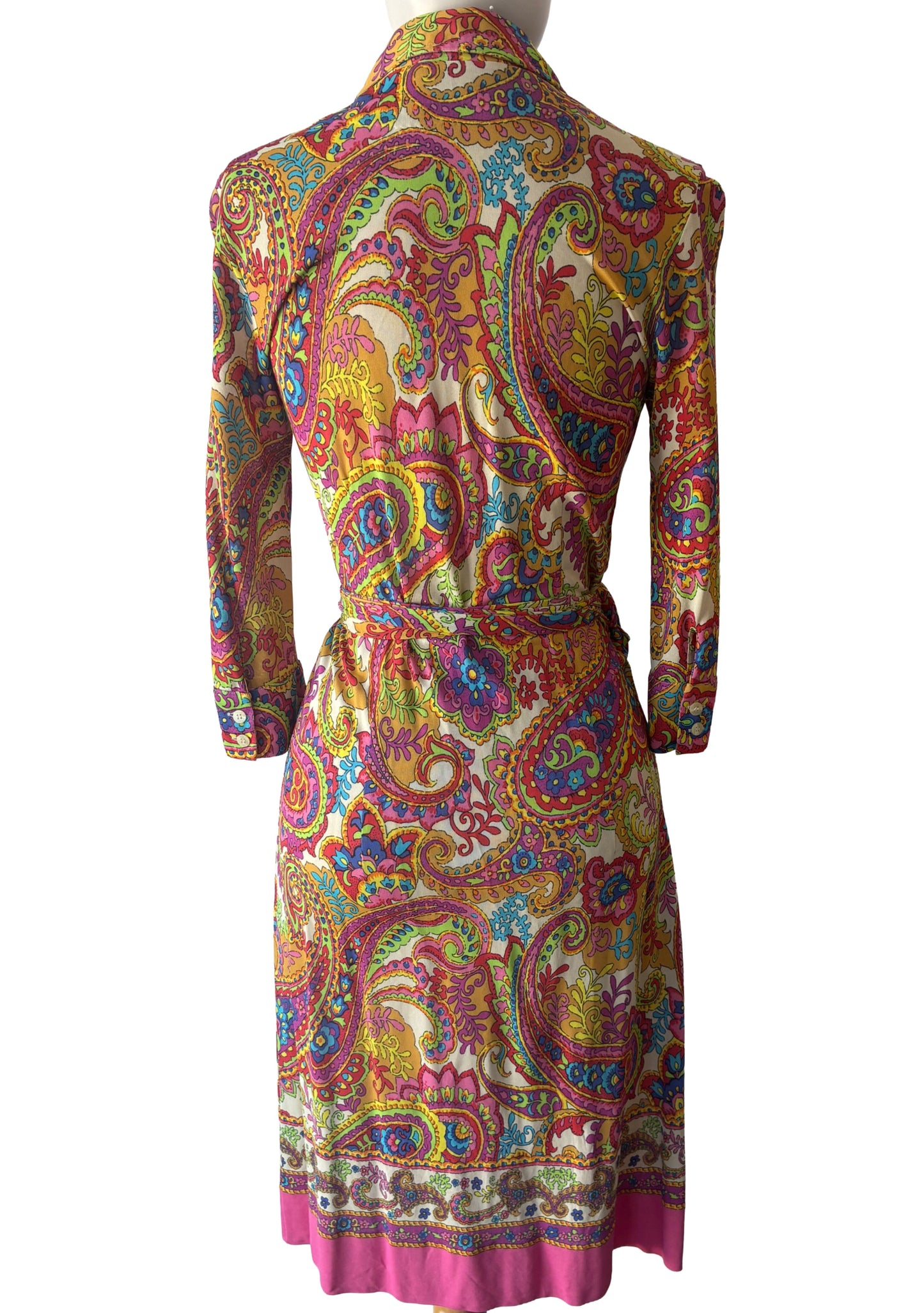 Wrap yourself in a swirl of 60s inspired charm with this colorful Dolce & Gabbana paisley print wrap dress, a playful nod to bohemian glamour with a polished twist. Featuring a tailored small collar and chic 3/4 length sleeves, this piece balances flirtation with finesse. The flattering wrap silhouette secures with an internal tie, discreet snaps, and a coordinating waist belt that cinches just right. In excellent condition, it’s a statement piece that doesn’t shout, just winks knowingly from across the room. Dress is free of notable flaws.
