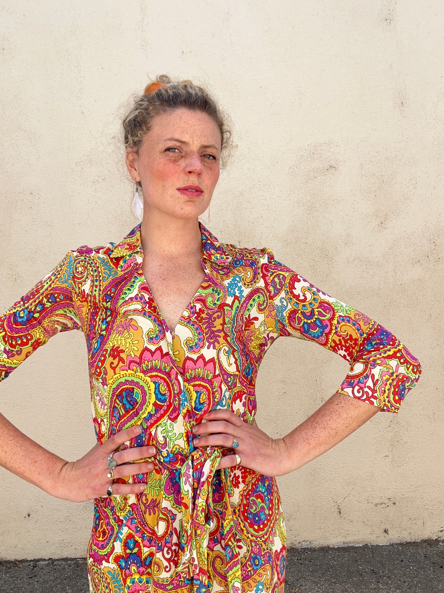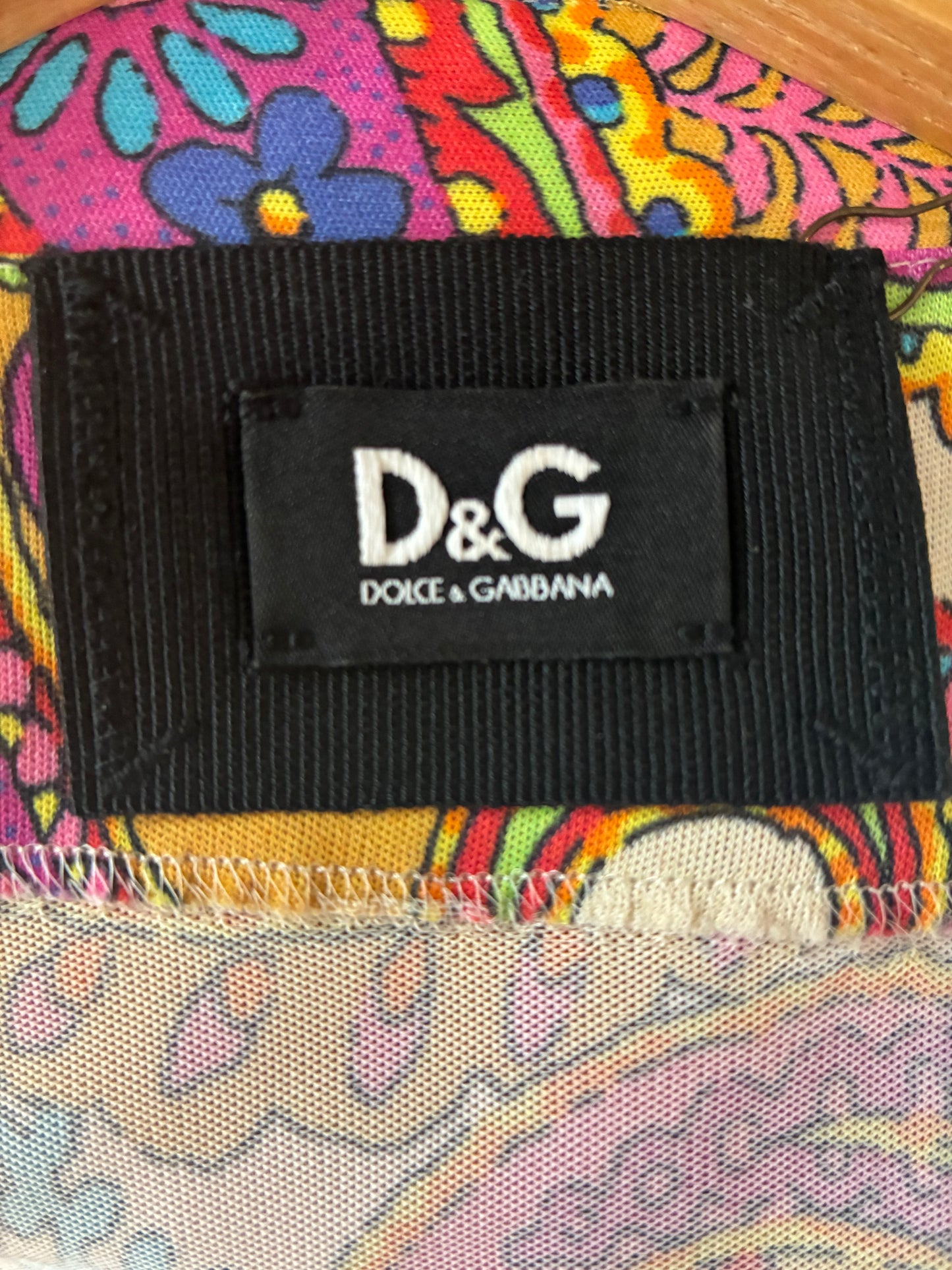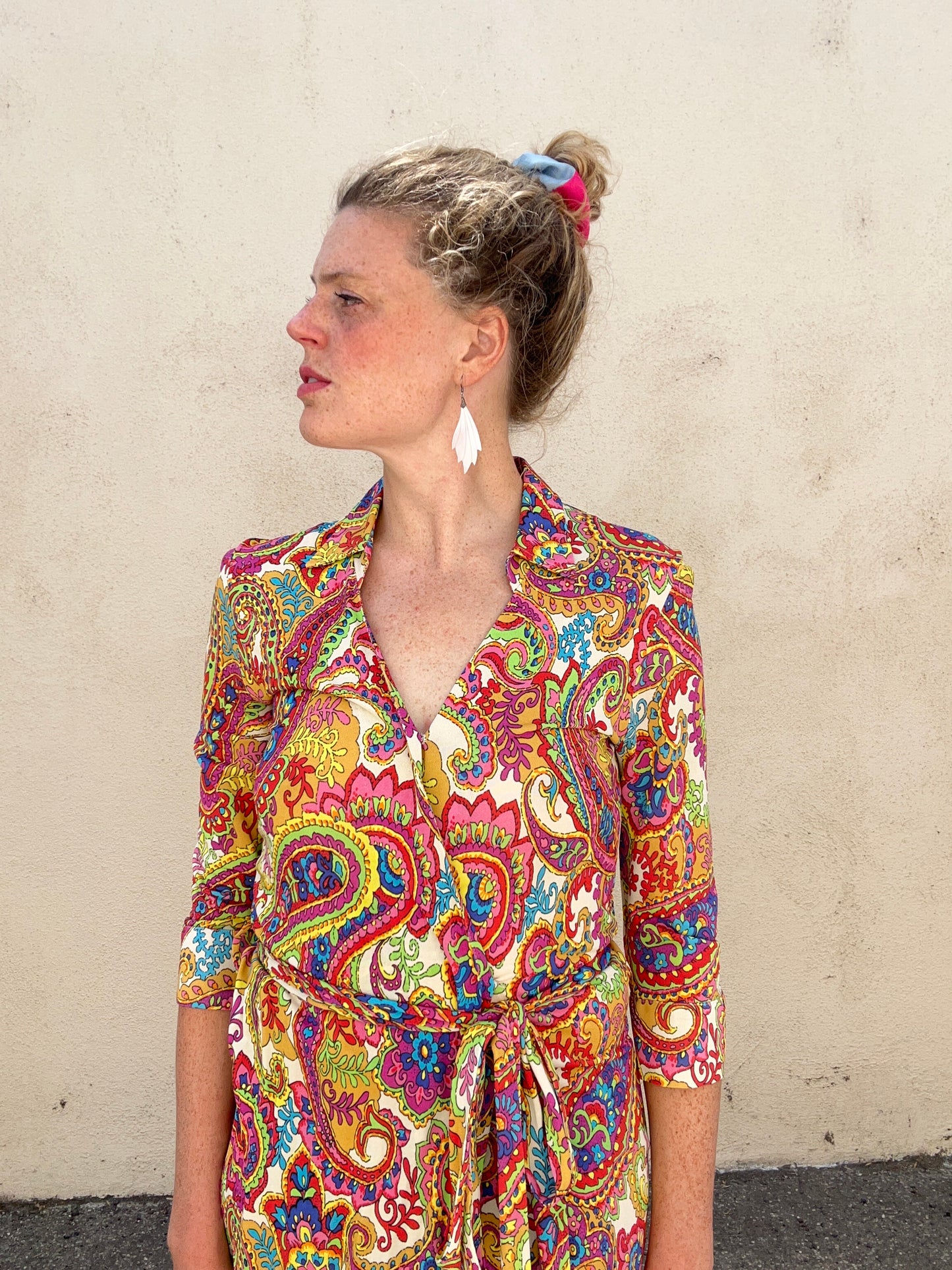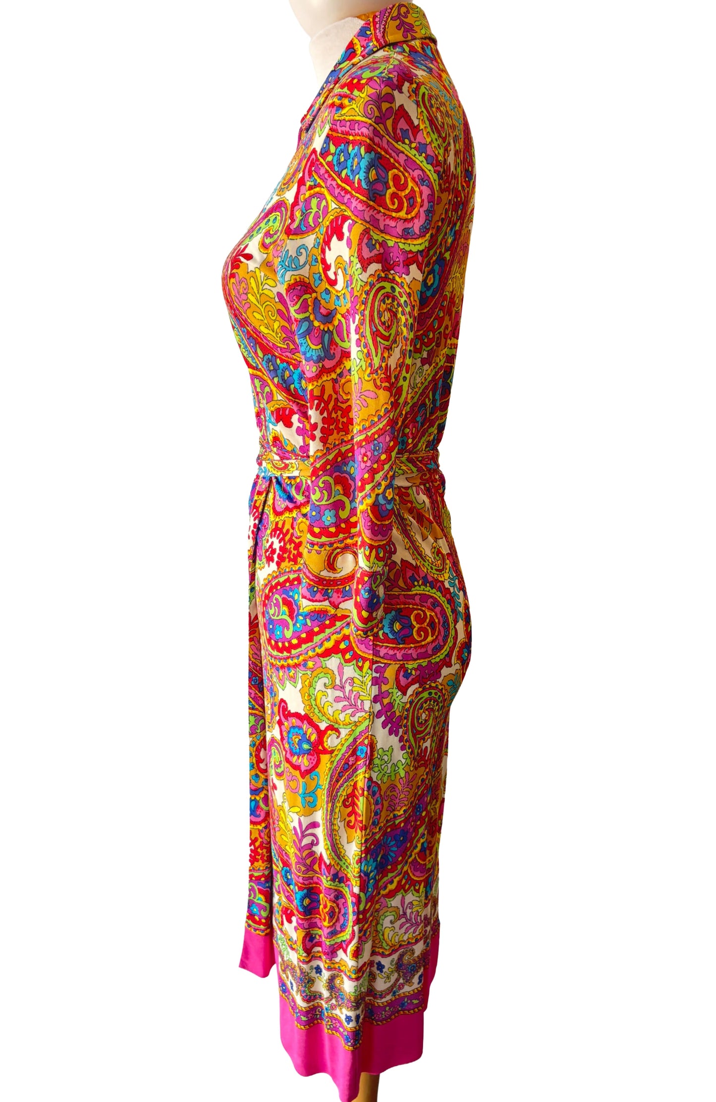 Wrap yourself in a swirl of 60s inspired charm with this colorful Dolce & Gabbana paisley print wrap dress, a playful nod to bohemian glamour with a polished twist. Featuring a tailored small collar and chic 3/4 length sleeves, this piece balances flirtation with finesse. The flattering wrap silhouette secures with an internal tie, discreet snaps, and a coordinating waist belt that cinches just right. In excellent condition, it’s a statement piece that doesn’t shout, just winks knowingly from across the room. Dress is free of notable flaws.
