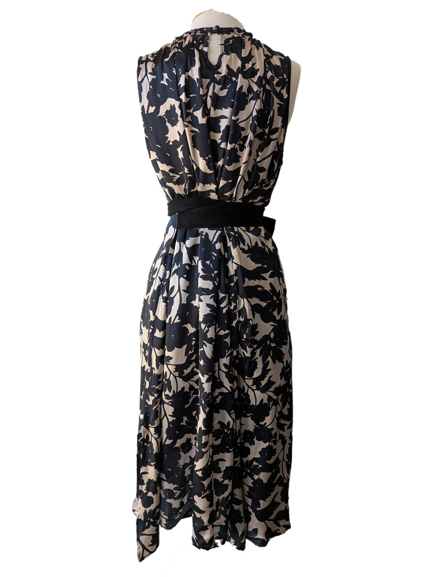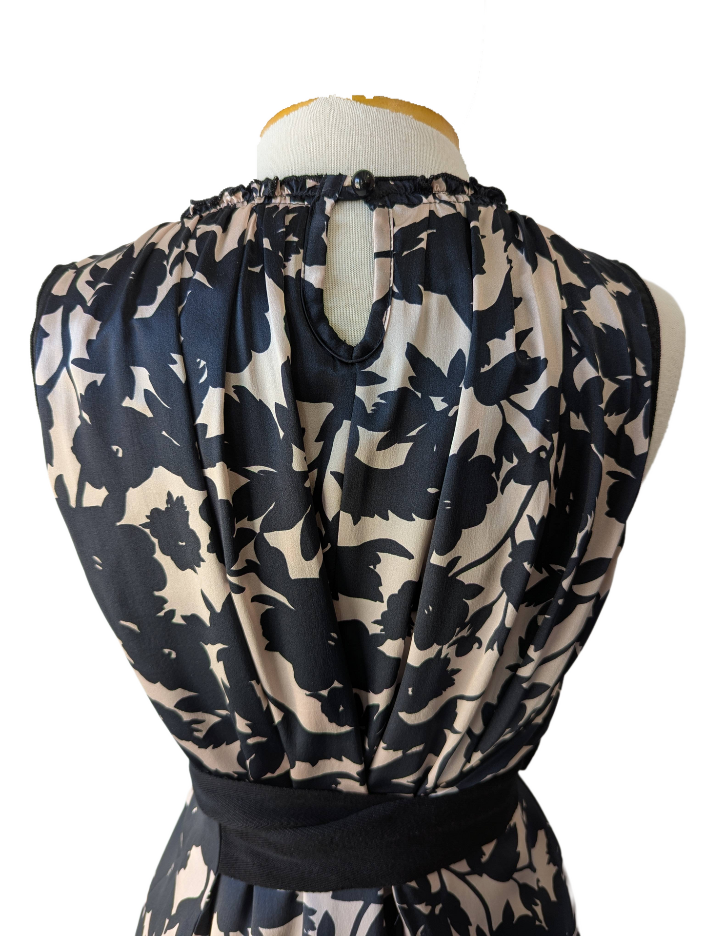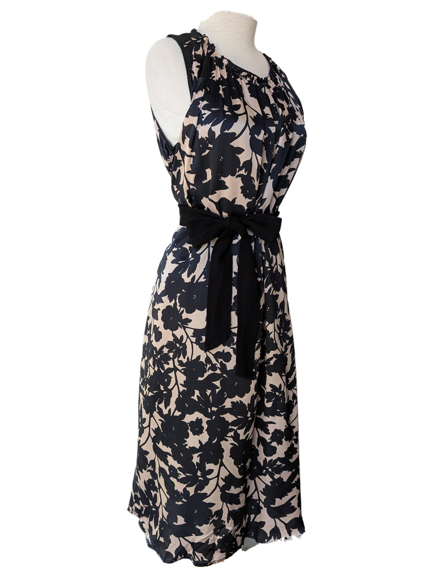 Some dresses make an entrance. This one makes an impression. Cut in fluid charmeuse silk with an inky black-on-tan floral that’s equal parts bold and understated, it drapes with ease and clean sophistication. The cotton twill sash wraps you in at the waist (more a neat embrace than a cinch) while the single button at the back of the neck adds a little detail to the function. It’s the perfect blend of soft swish and structured tie, both classic and contemporary. Dress is in excellent condition and is free of notable flaws.