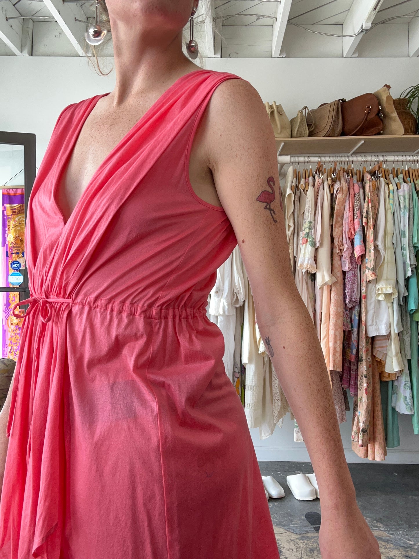Eres Pink Beach Cover-Up. A light-weight and easy to wear little pink cotton dress perfect for a day at the beach or lounging poolside. Sleeveless with a drawstring waist. Fabric drapes delicately throughout, has a flowy panel at the front of the skirt for added charm. Marked L/XL. 100% cotton. Made in France. In excellent, like-new condition.