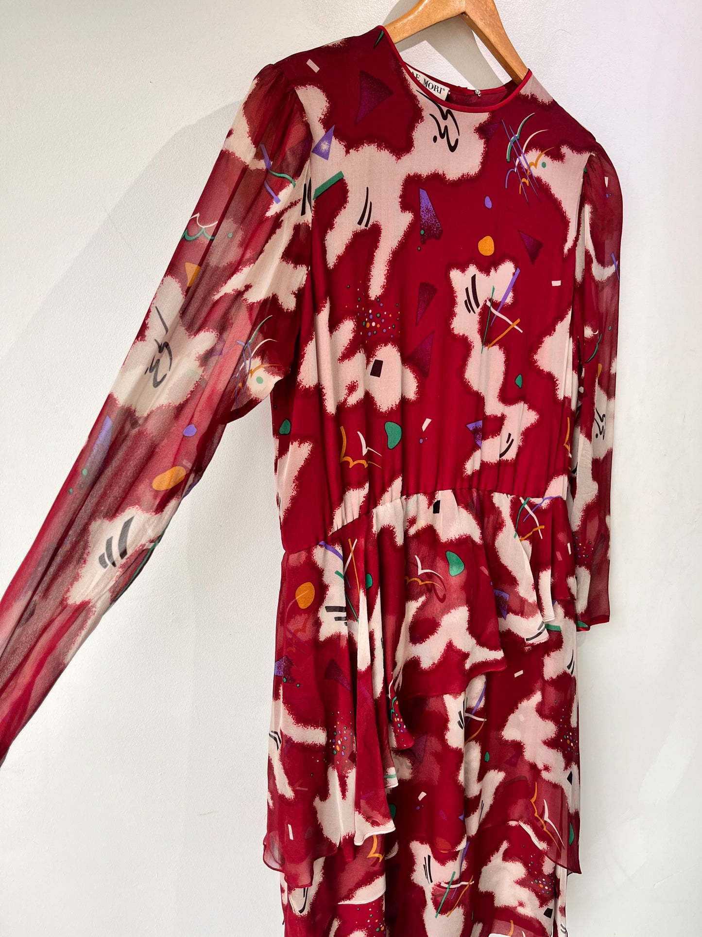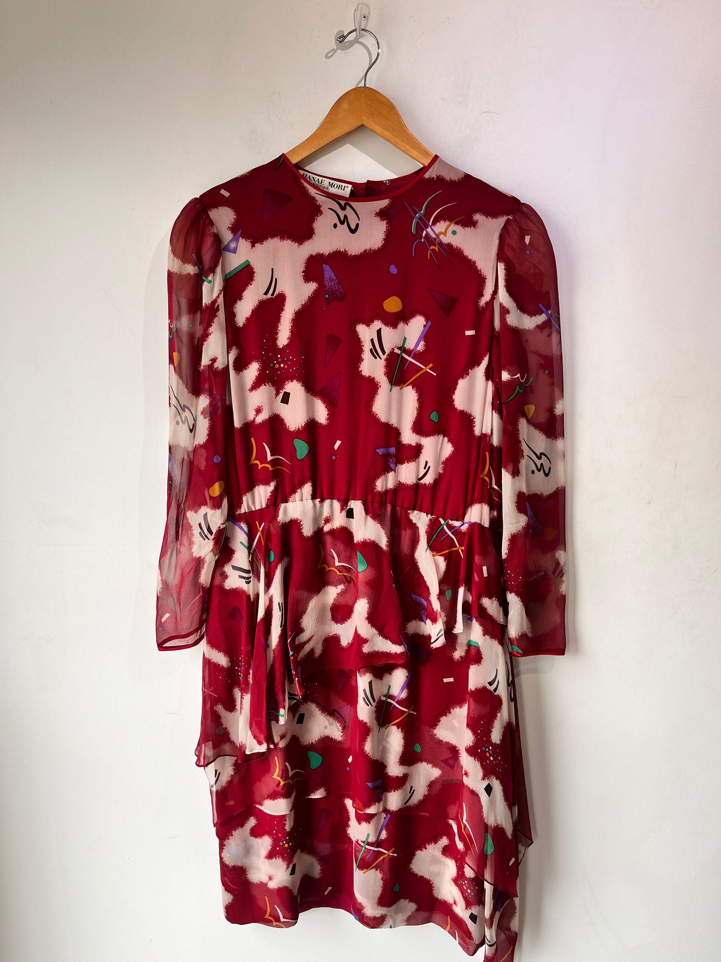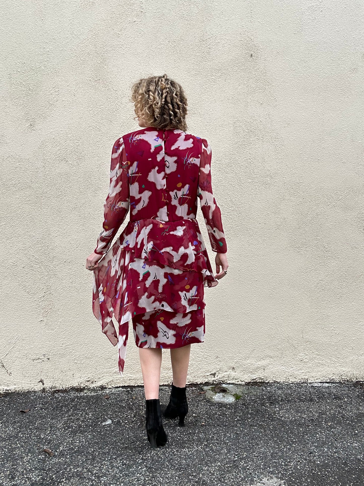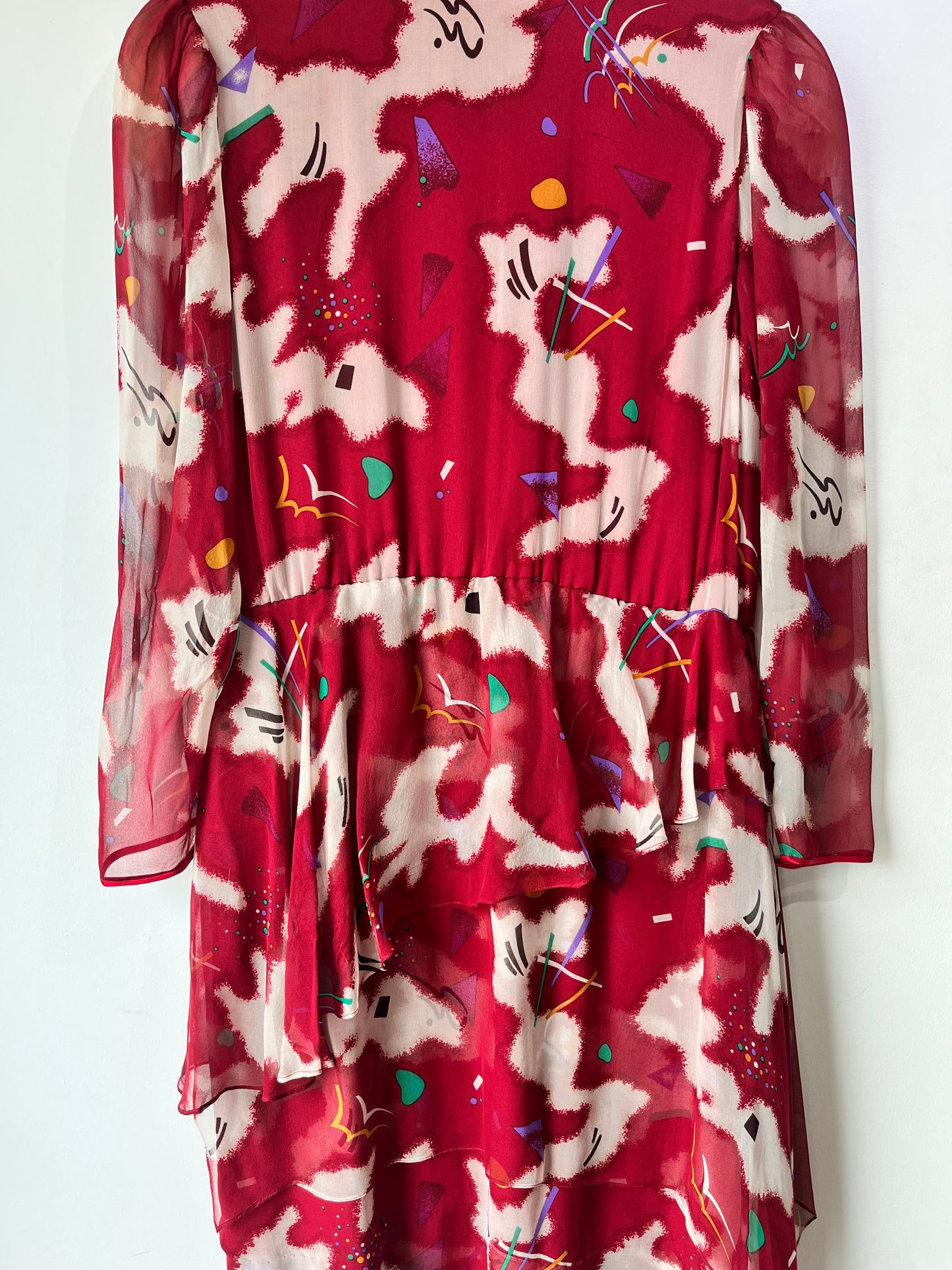 Hanae Mori Boutique Maroon Silk Print Dress with Peplum. This breezy silk chiffon number features a large scale abstract print, an asymmetrical peplum scarf waist and a sheer long sleeve and is 100% fun! Round neckline and covered button back, dress is in excellent condition! Body is fully lined.