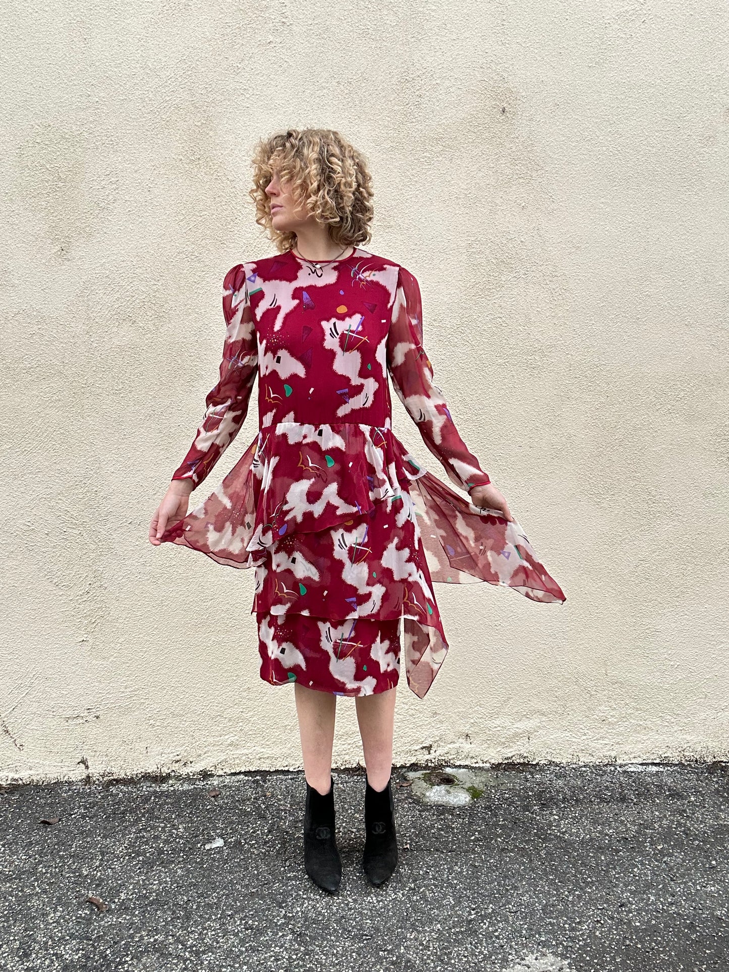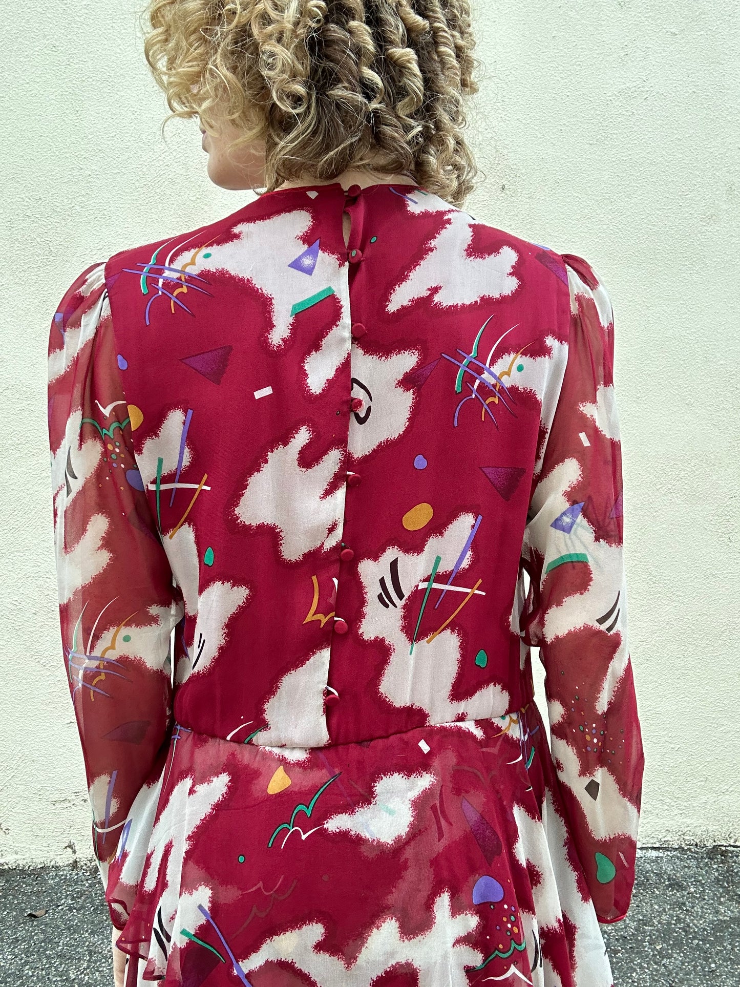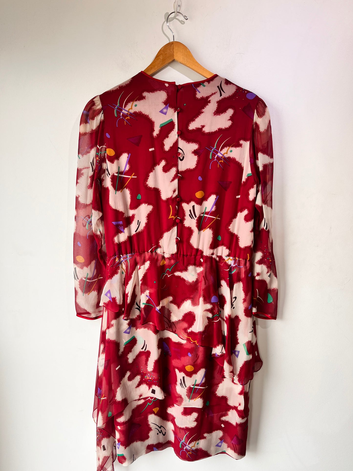 Hanae Mori Boutique Maroon Silk Print Dress with Peplum. This breezy silk chiffon number features a large scale abstract print, an asymmetrical peplum scarf waist and a sheer long sleeve and is 100% fun! Round neckline and covered button back, dress is in excellent condition! Body is fully lined.