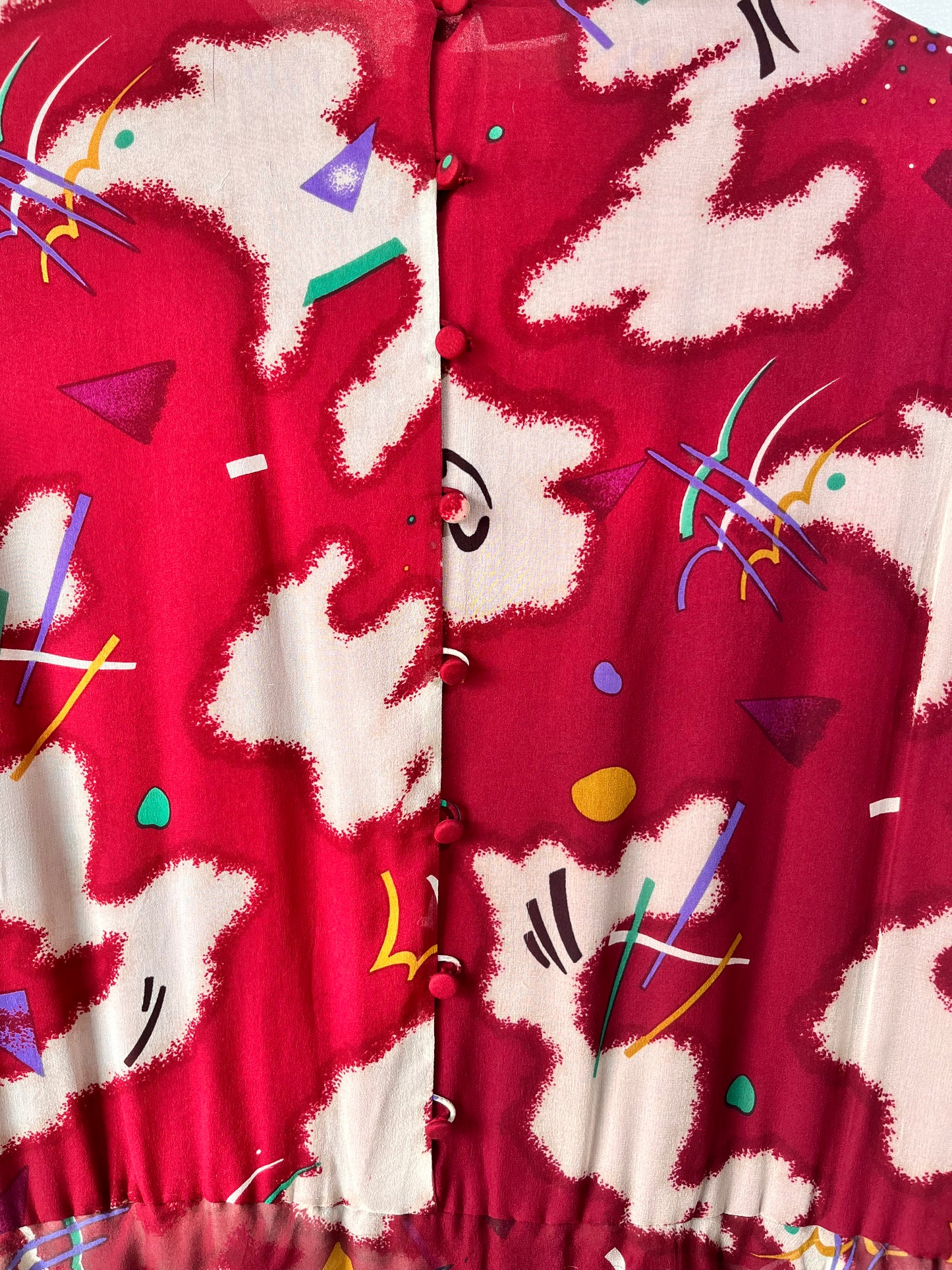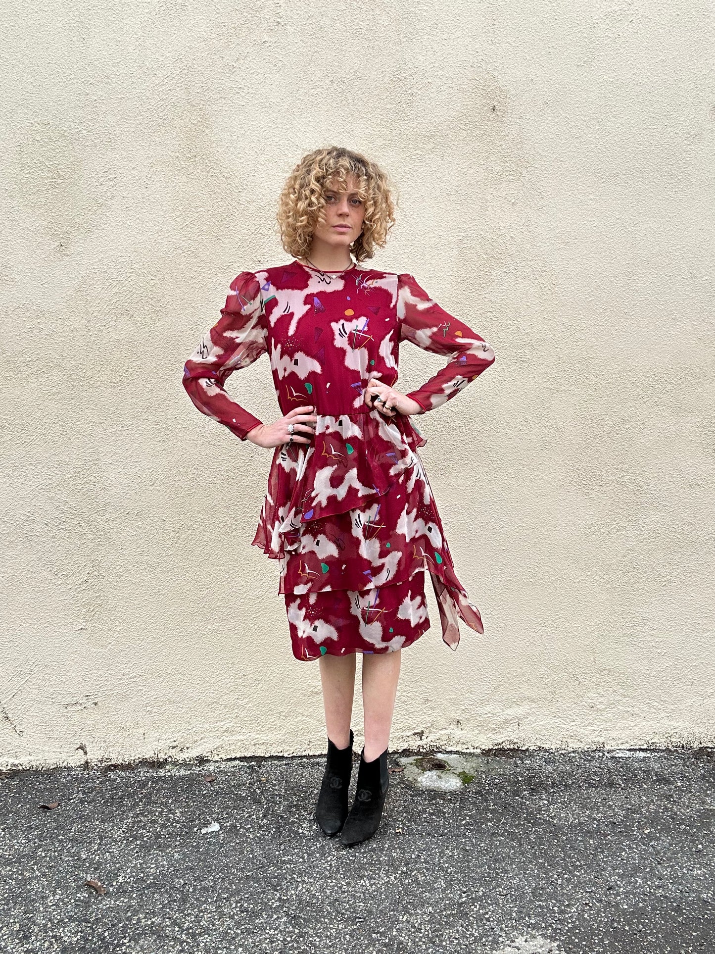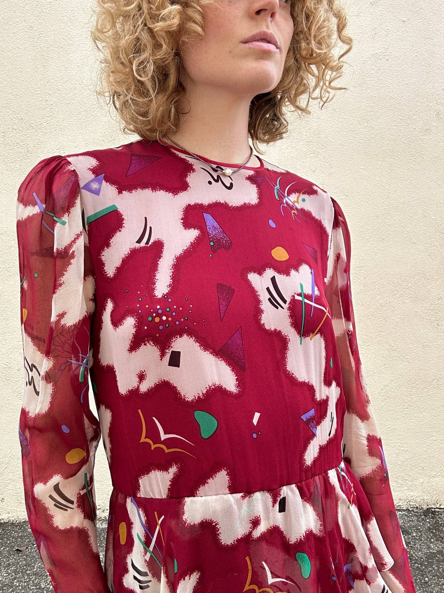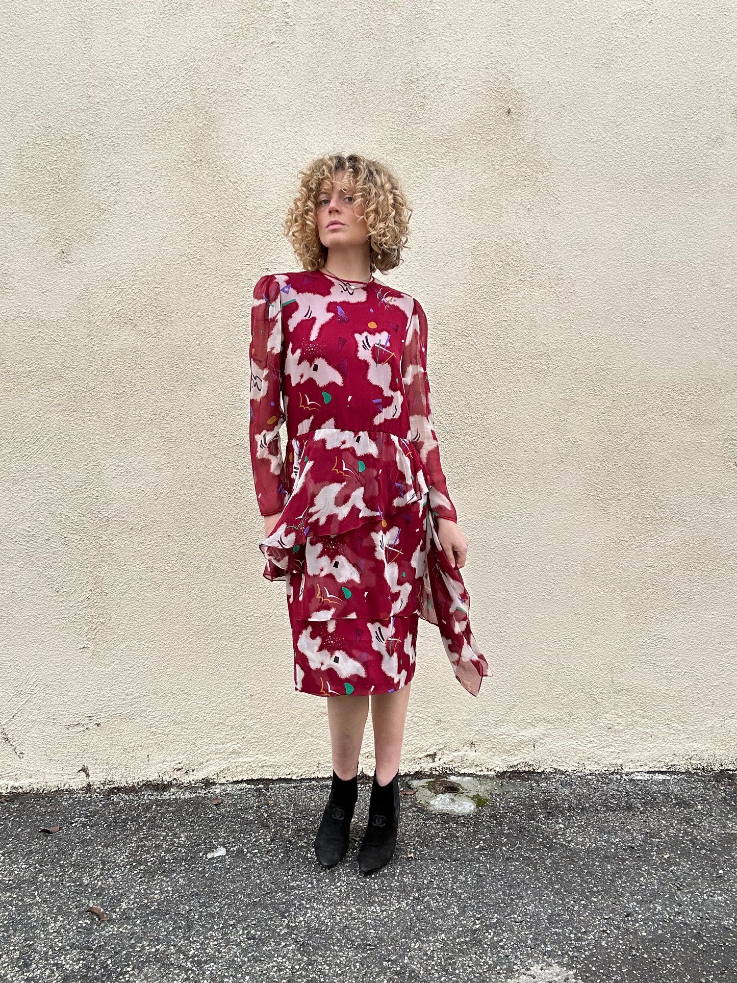 Hanae Mori Boutique Maroon Silk Print Dress with Peplum. This breezy silk chiffon number features a large scale abstract print, an asymmetrical peplum scarf waist and a sheer long sleeve and is 100% fun! Round neckline and covered button back, dress is in excellent condition! Body is fully lined.