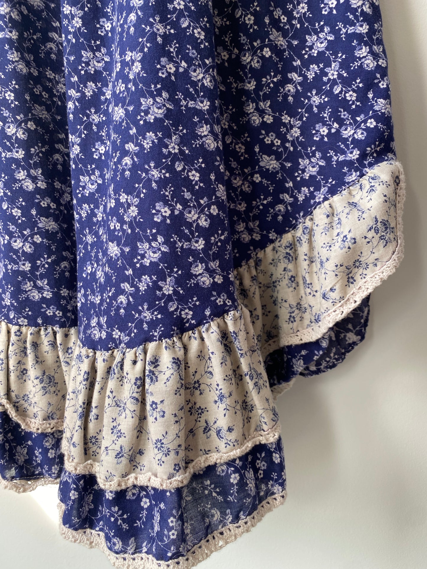 How Sweet it Is Blue Floral Dress in excellent condition. Off the shoulder with cool rounded hem. Lace details! Unmarked size fits small/medium best. 100% cotton.