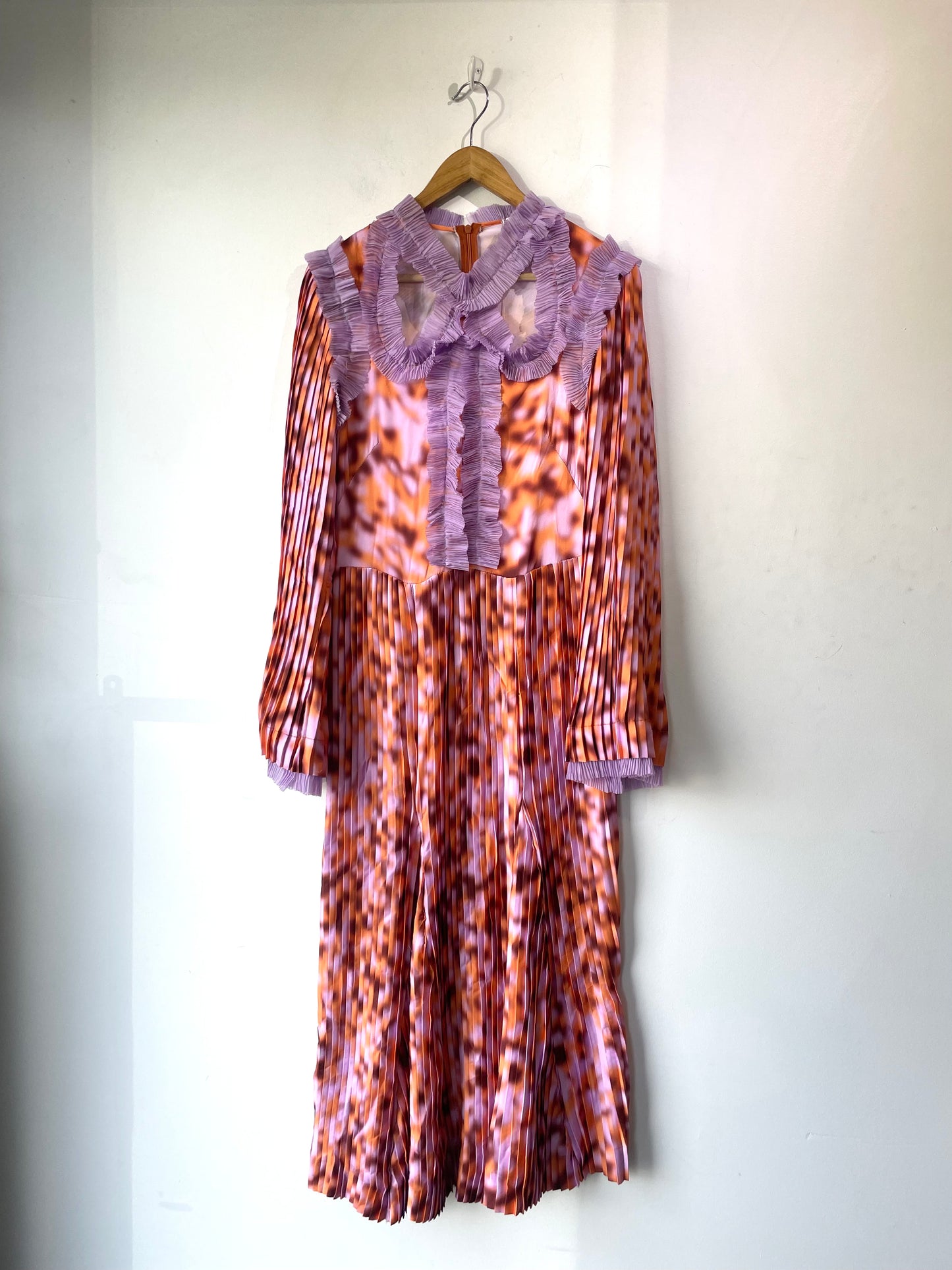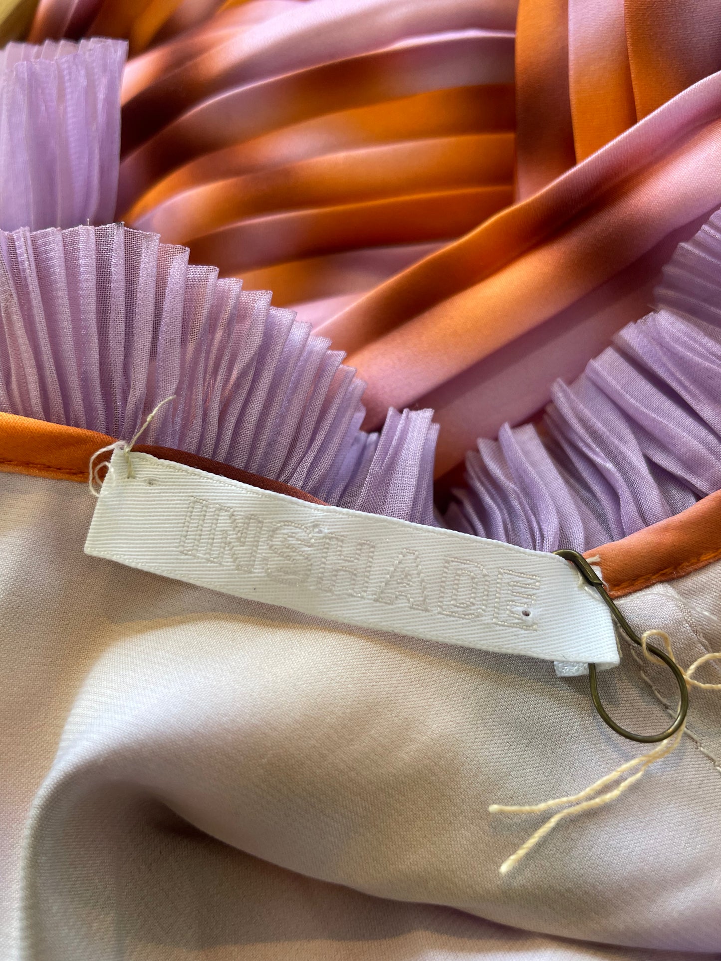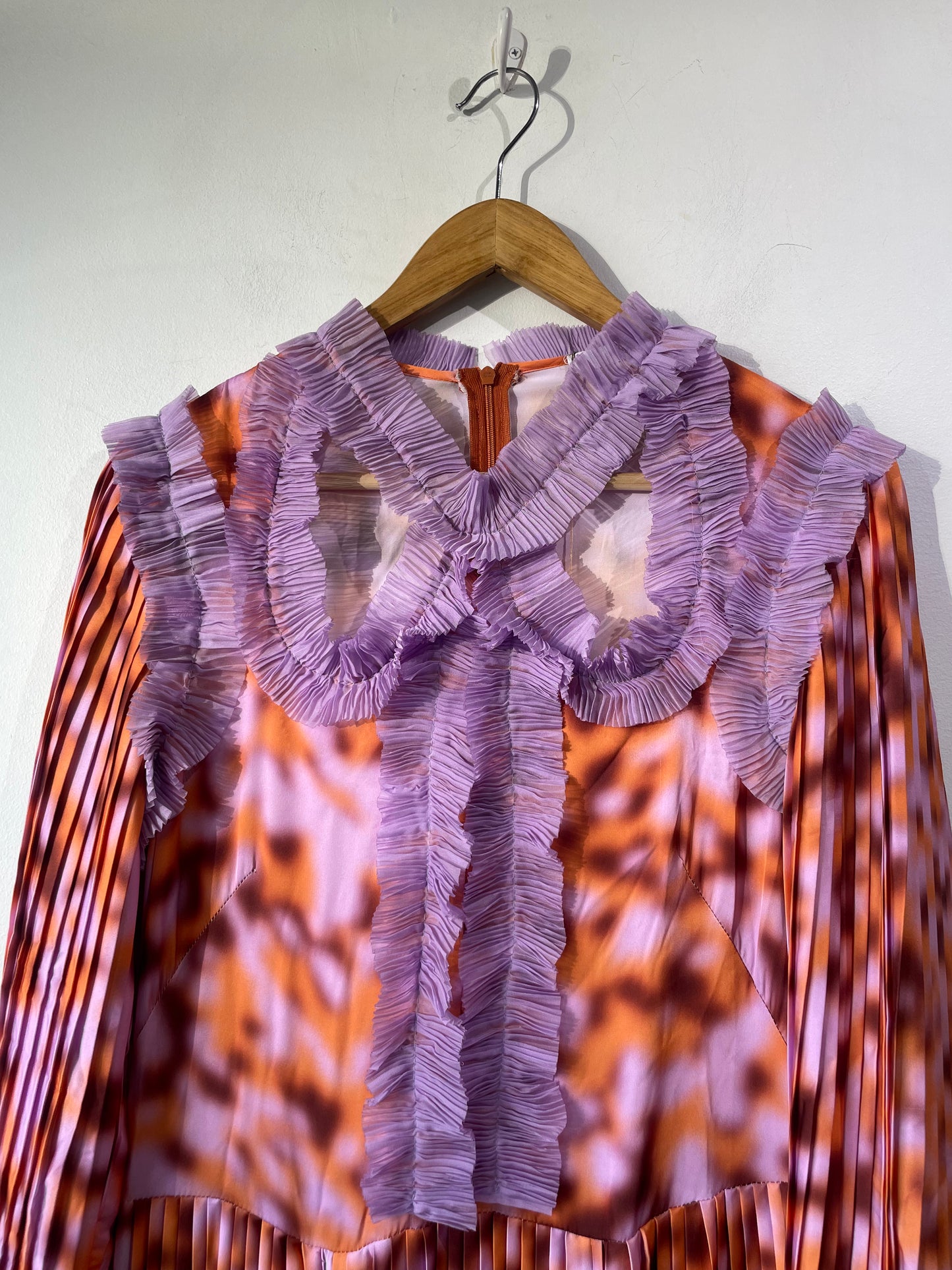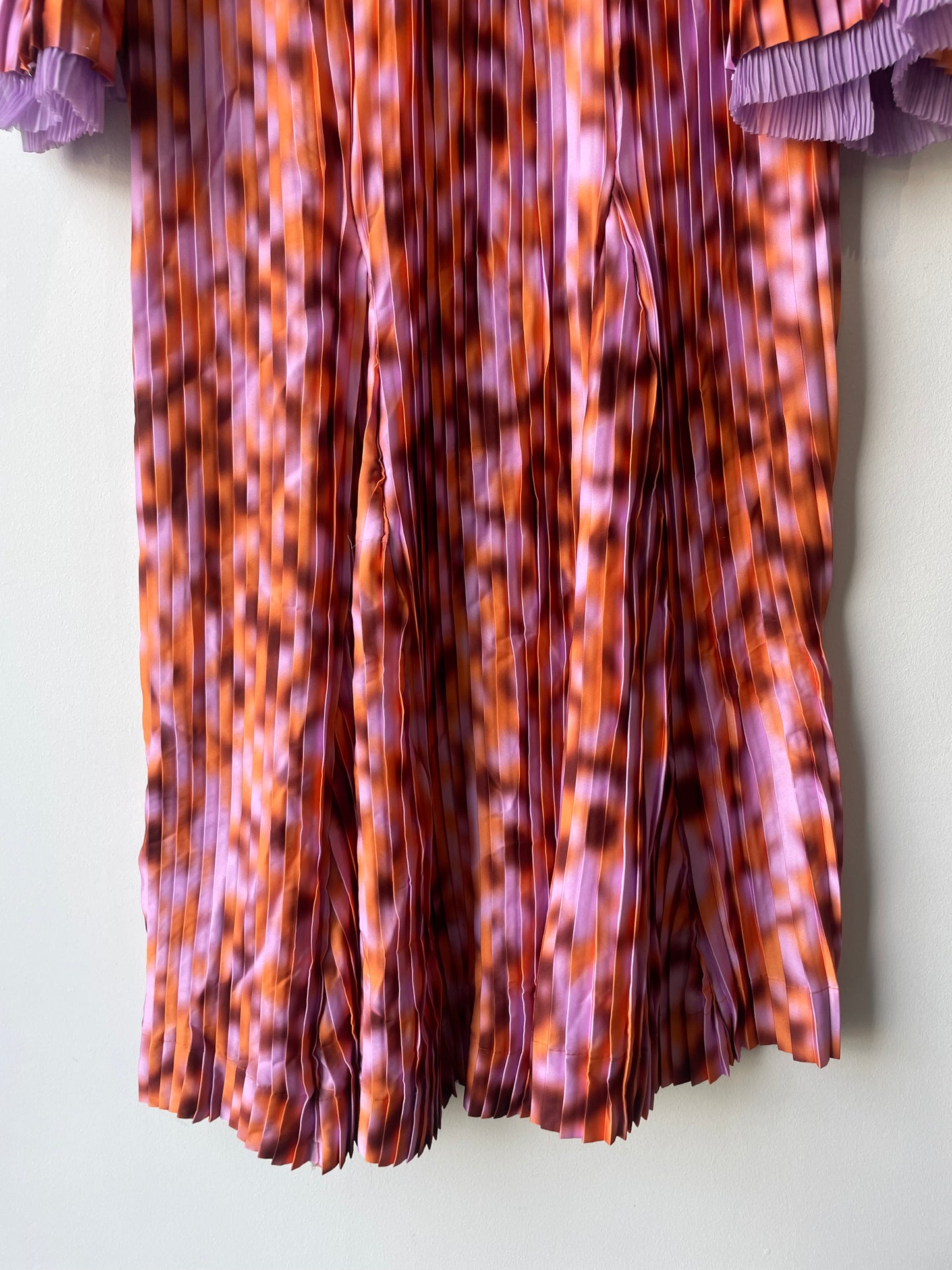 Inshade Orange and Purple Pleated Ruffly Dress. A funky dress in a fun orange purple colorway. Features pleated ruffle details around front and pleated skirt/sleeve. In good condition, some runs in the fabric. 100% polyester. Marked size S, please refer to measurements.