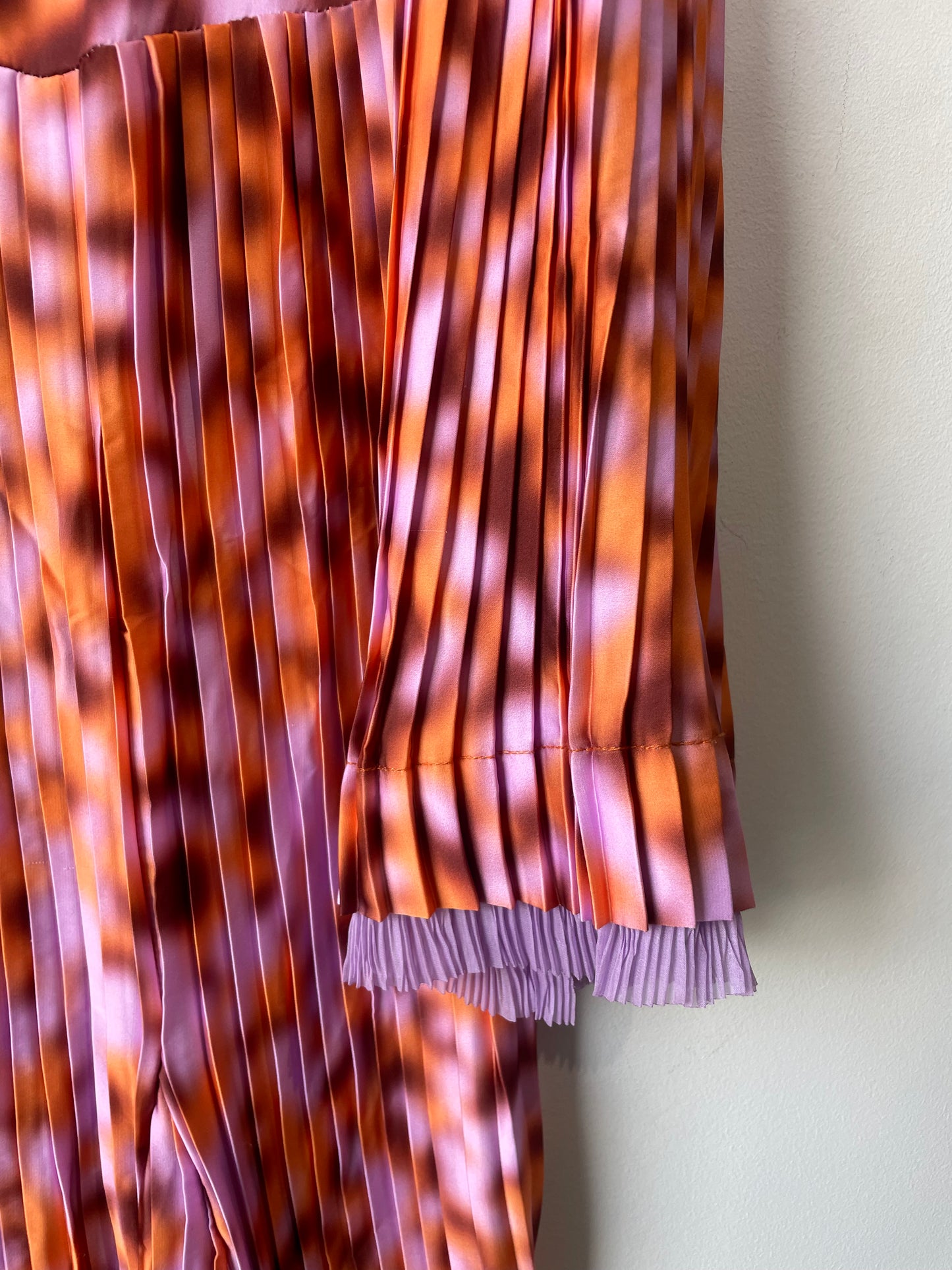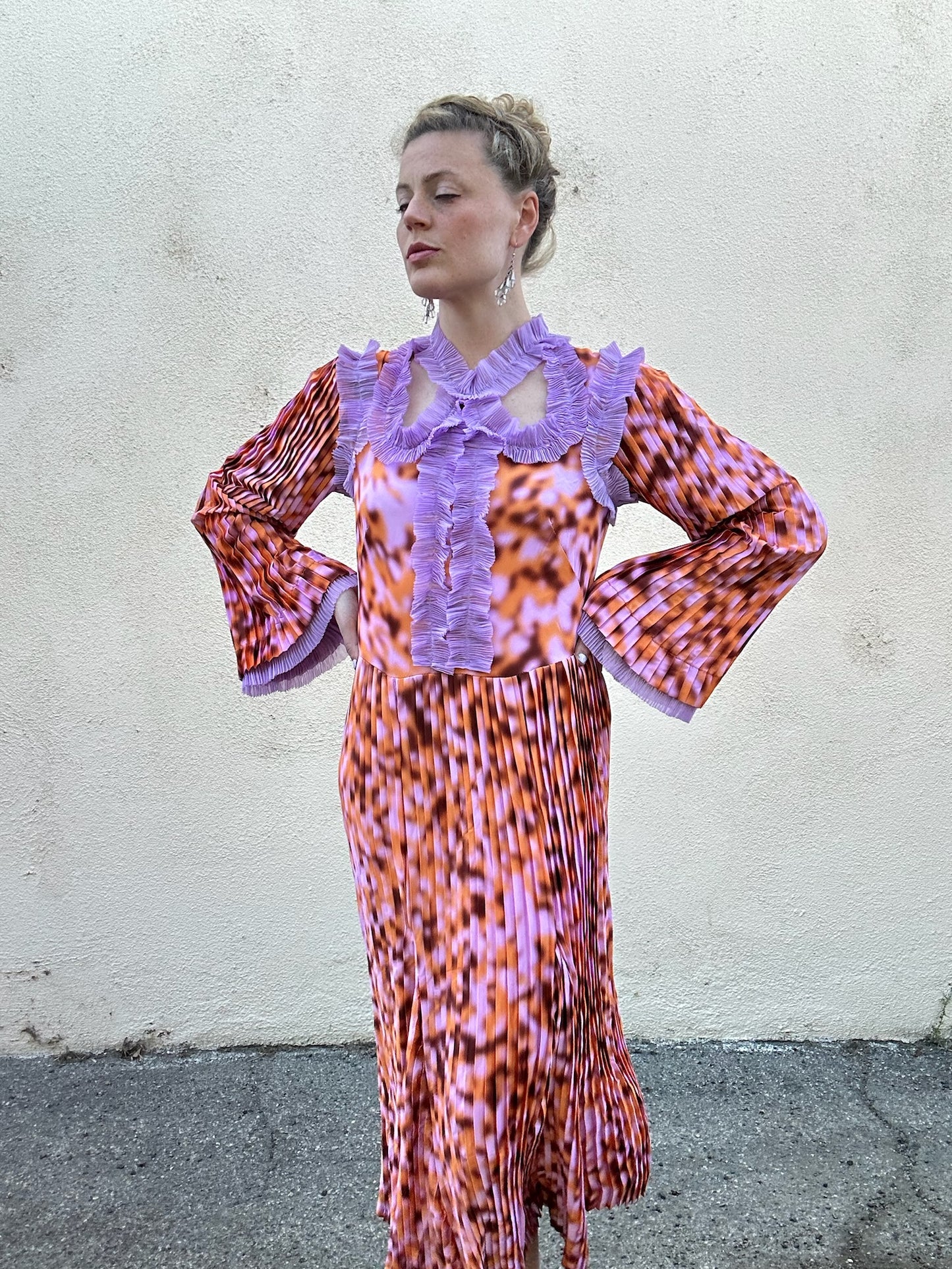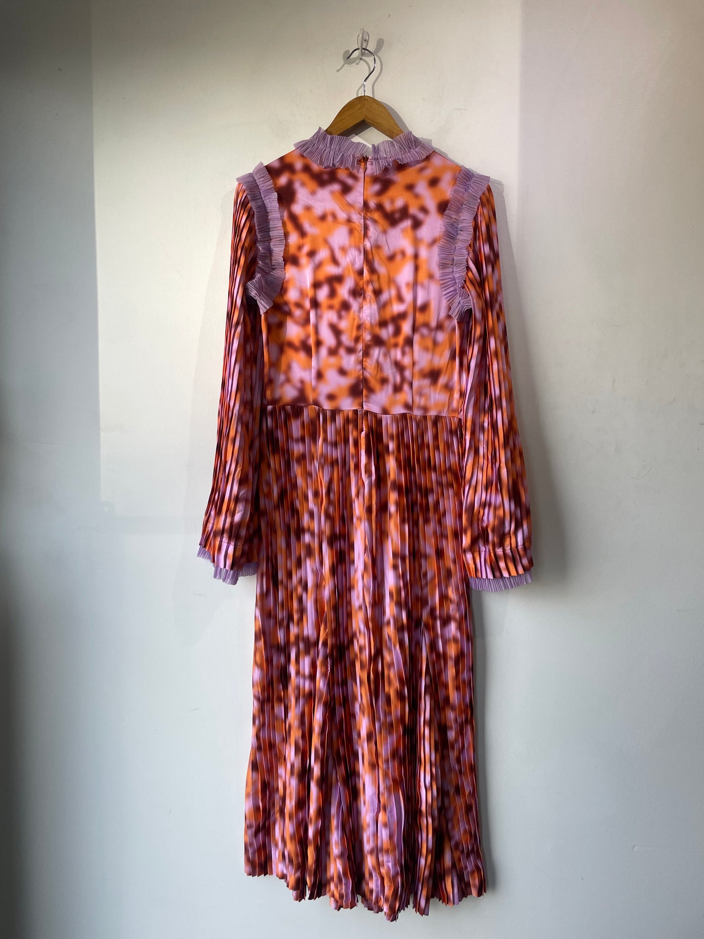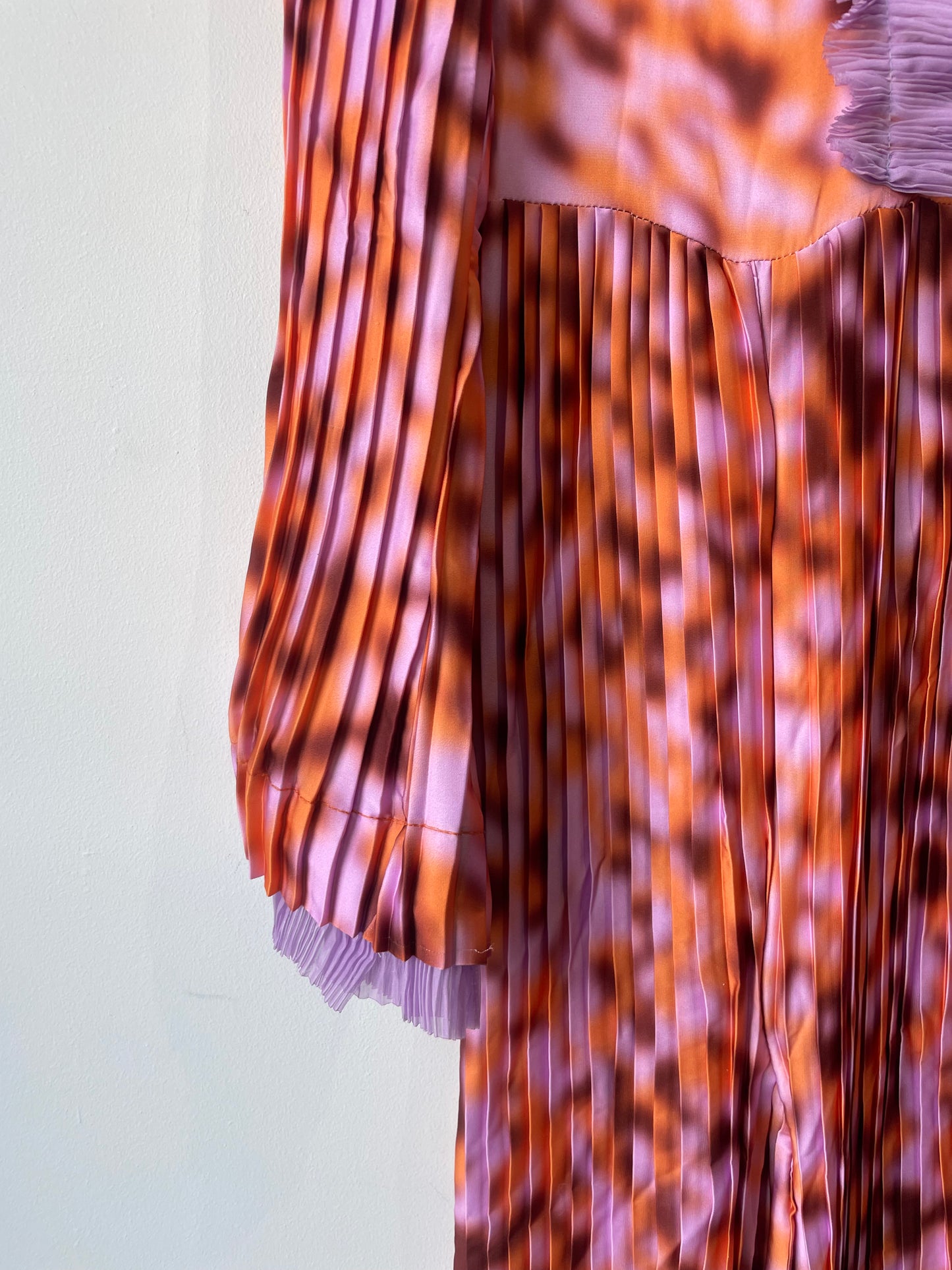 Inshade Orange and Purple Pleated Ruffly Dress. A funky dress in a fun orange purple colorway. Features pleated ruffle details around front and pleated skirt/sleeve. In good condition, some runs in the fabric. 100% polyester. Marked size S, please refer to measurements.