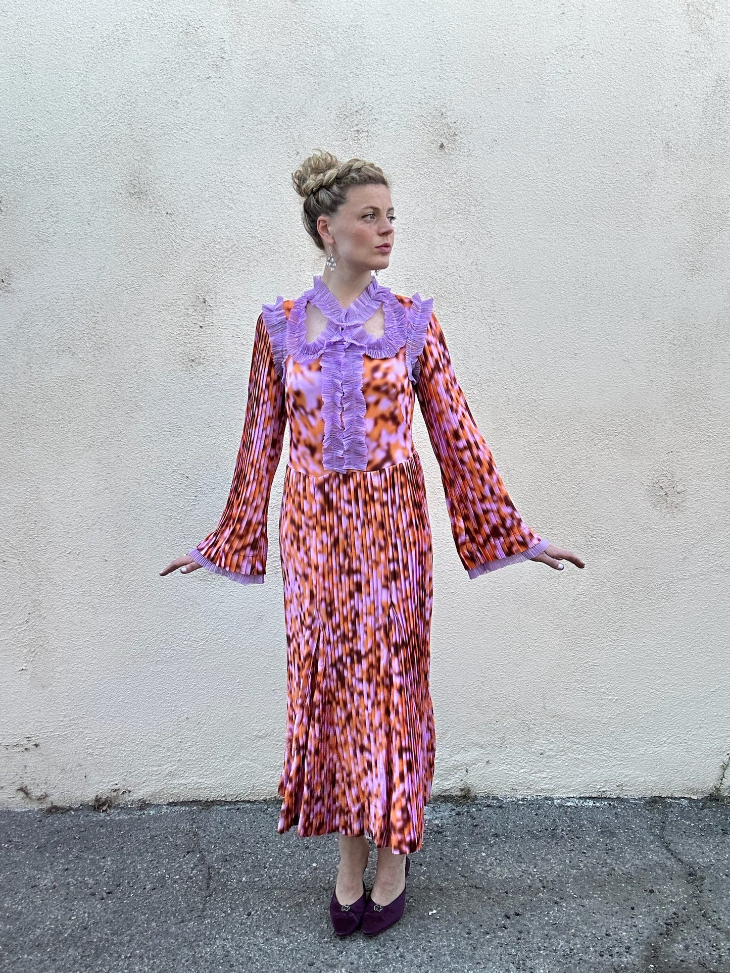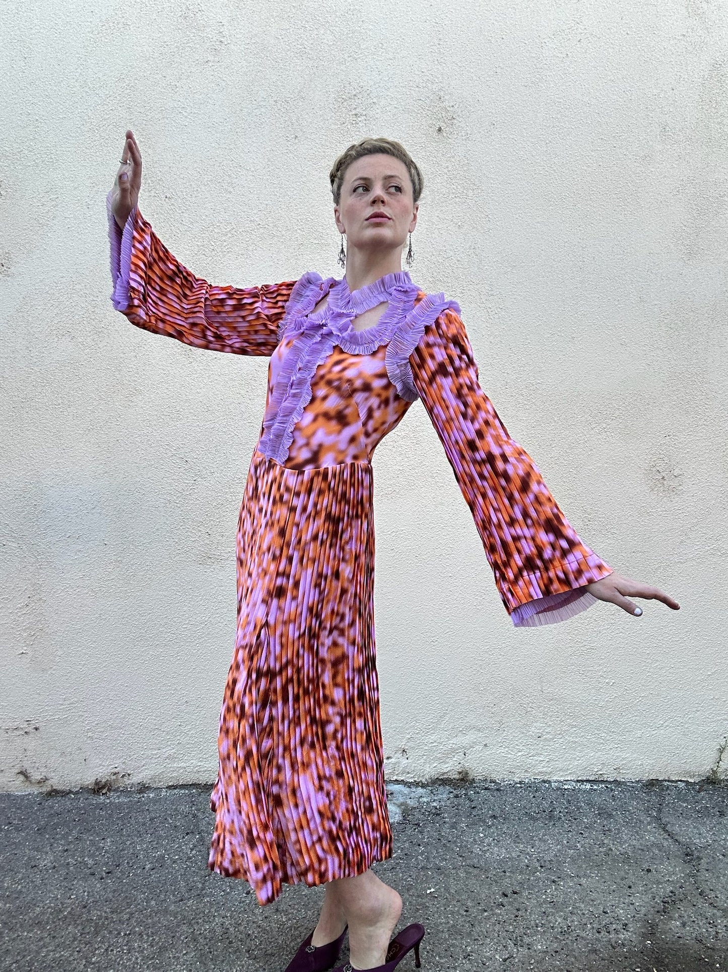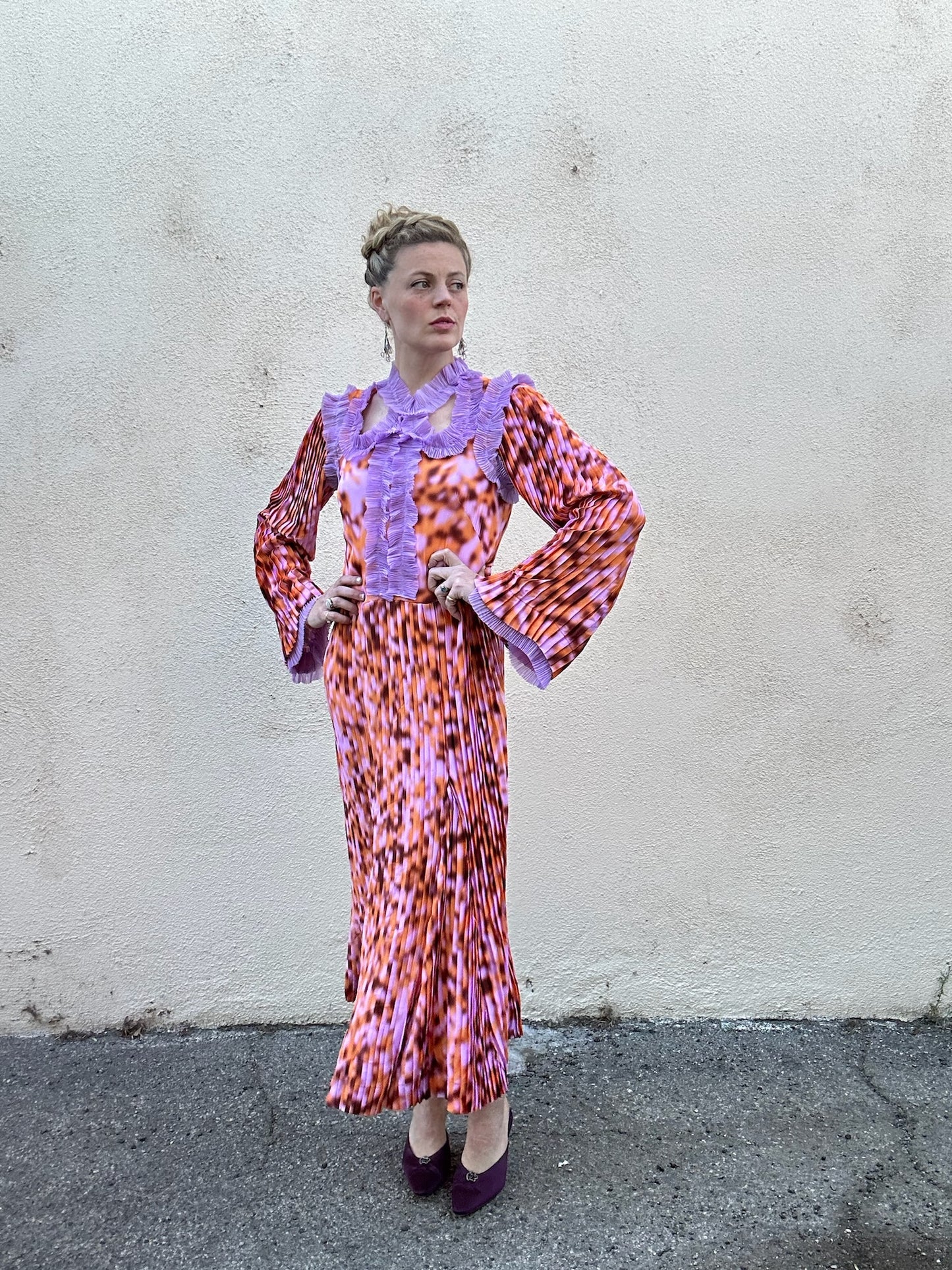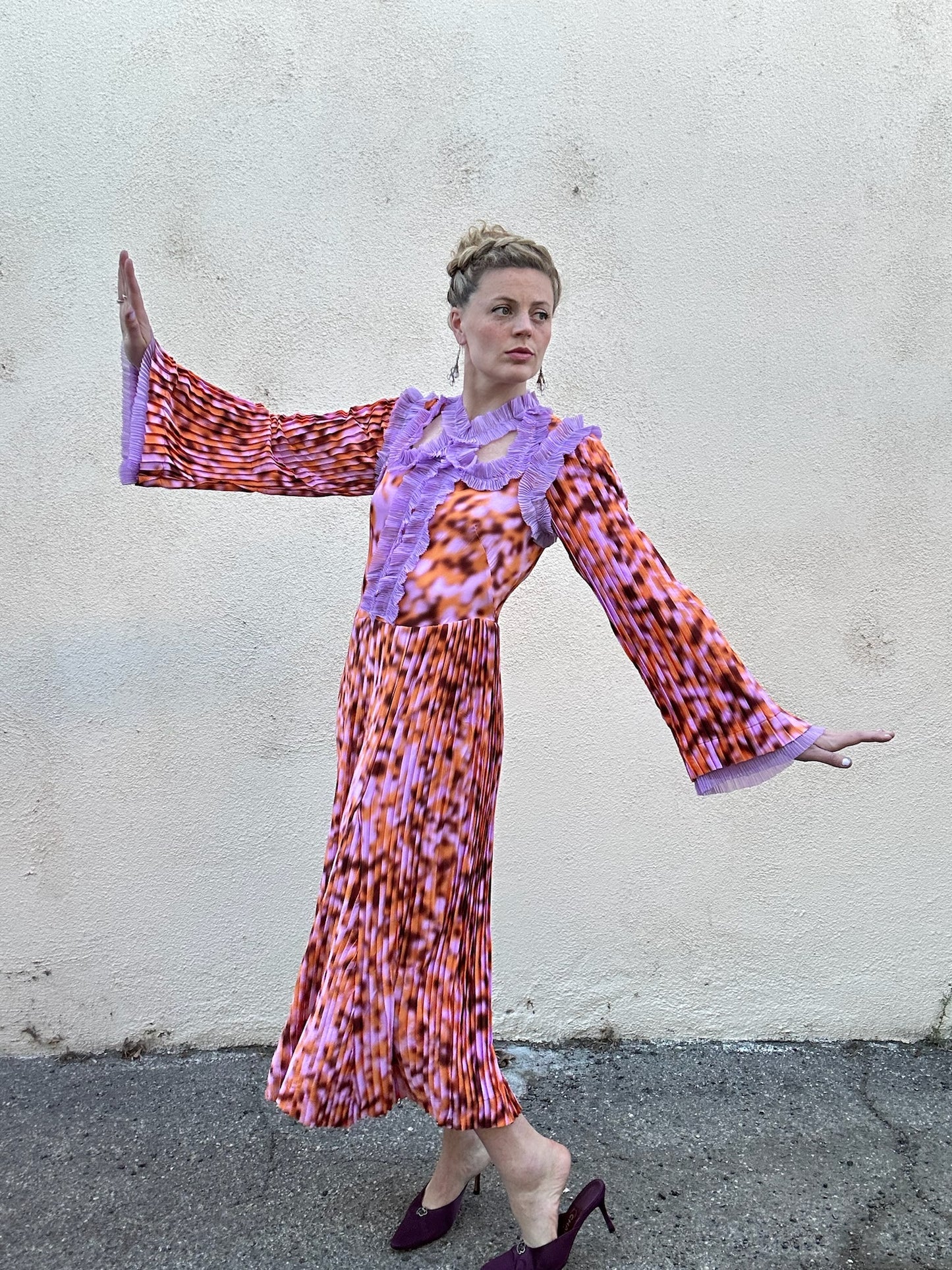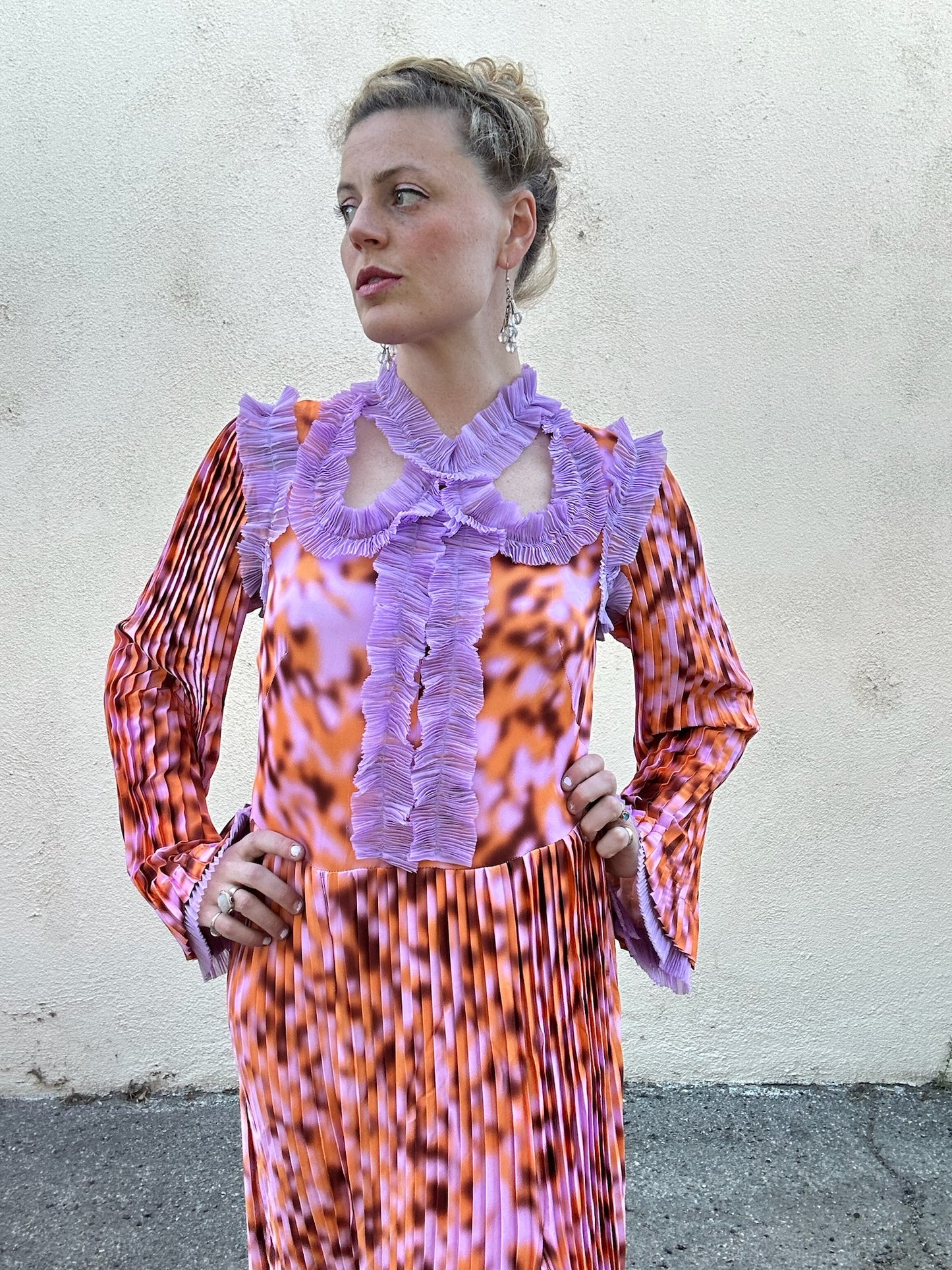 Inshade Orange and Purple Pleated Ruffly Dress. A funky dress in a fun orange purple colorway. Features pleated ruffle details around front and pleated skirt/sleeve. In good condition, some runs in the fabric. 100% polyester. Marked size S, please refer to measurements.