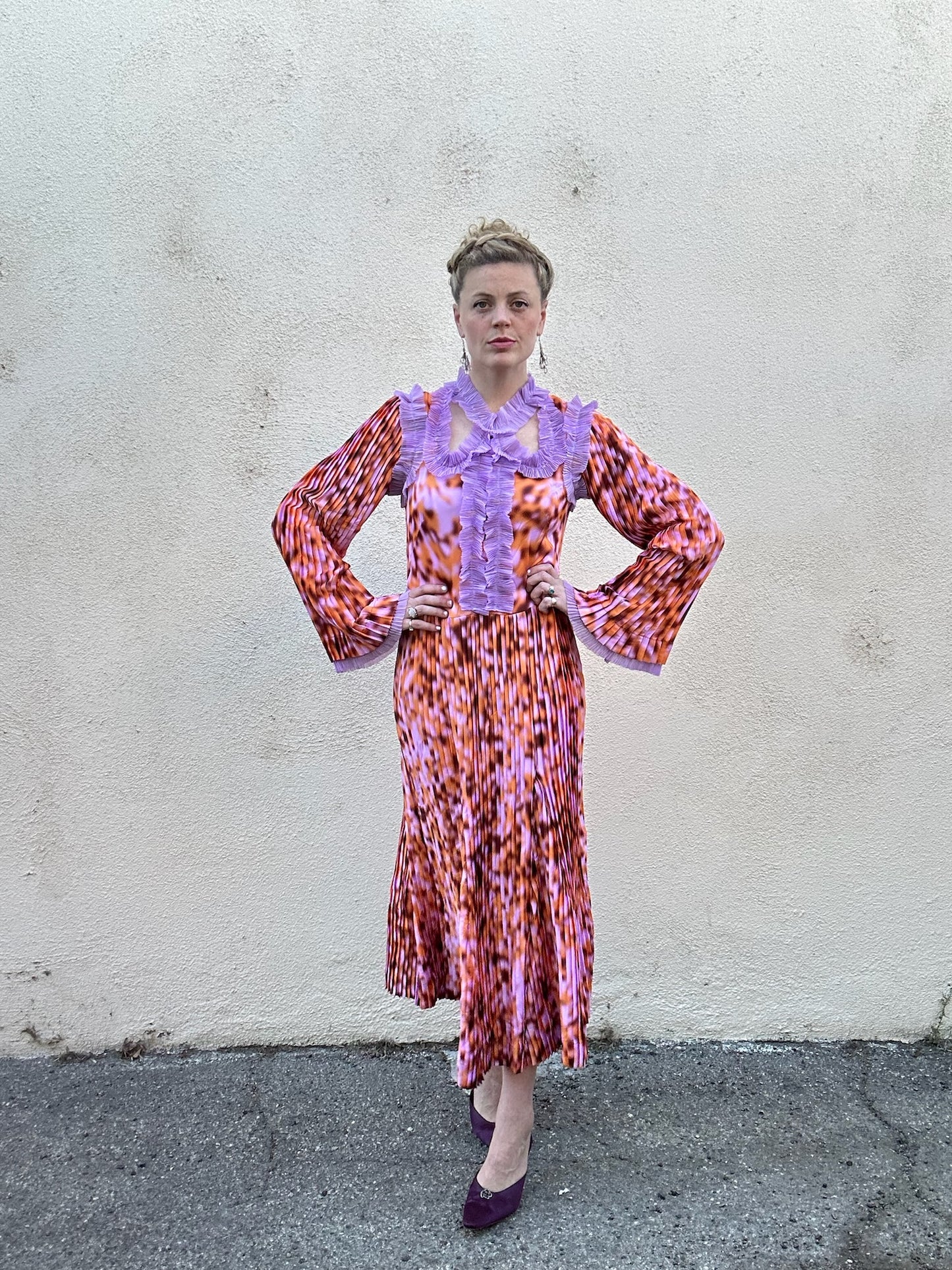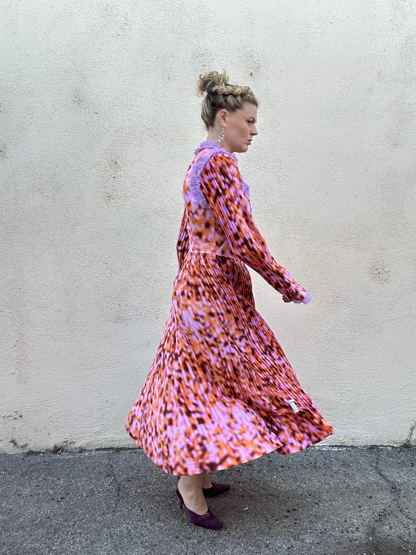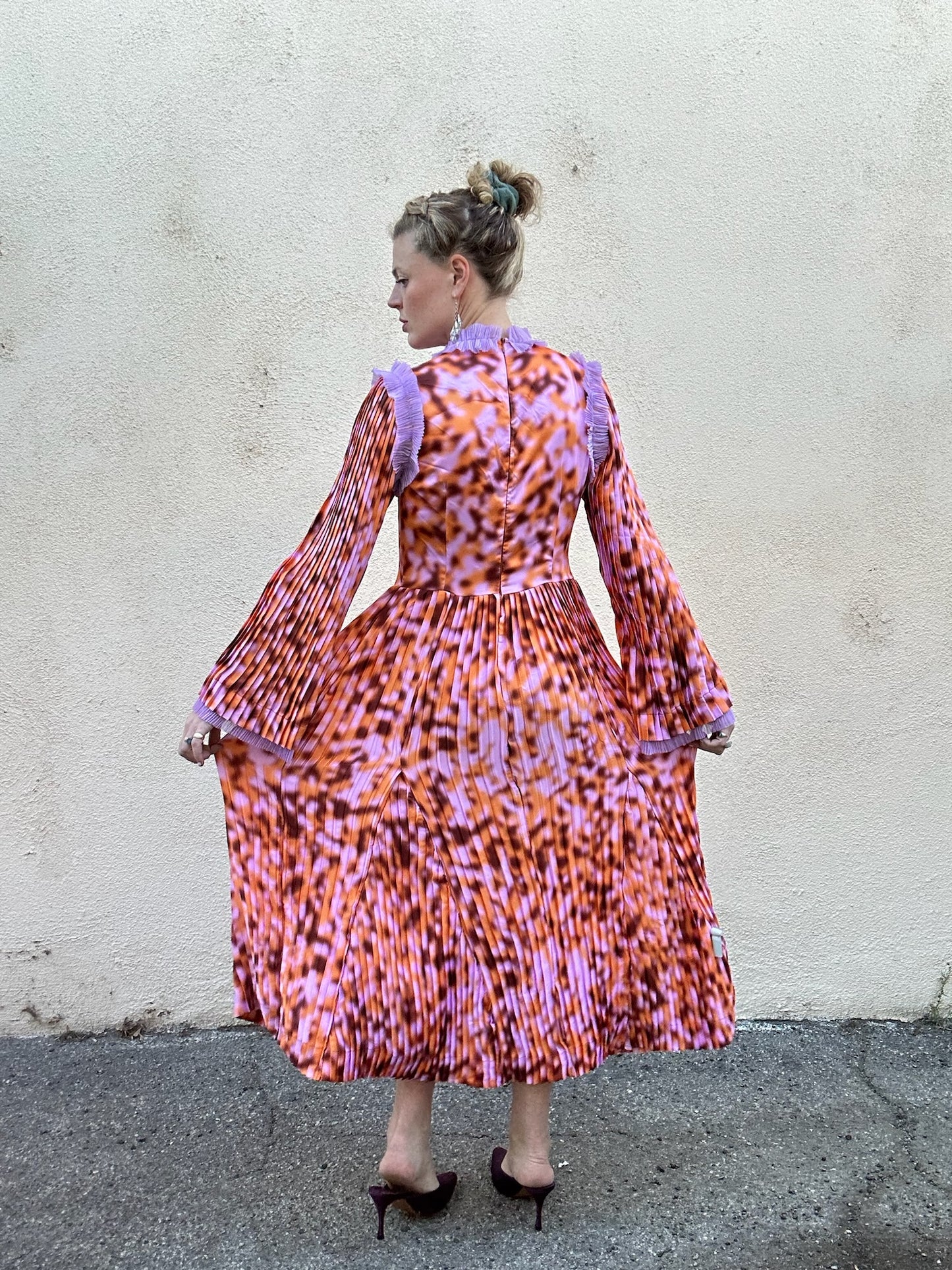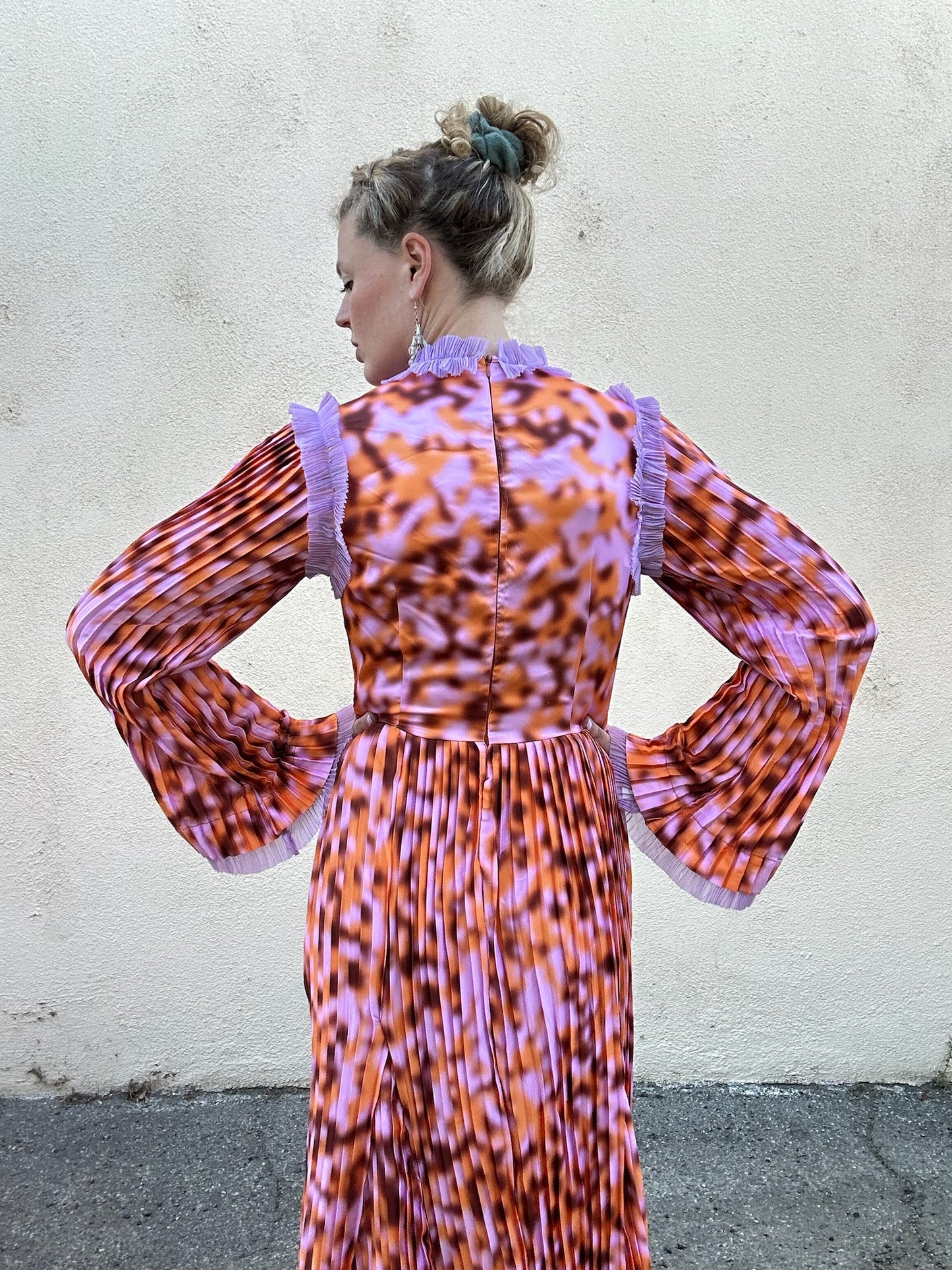 Inshade Orange and Purple Pleated Ruffly Dress. A funky dress in a fun orange purple colorway. Features pleated ruffle details around front and pleated skirt/sleeve. In good condition, some runs in the fabric. 100% polyester. Marked size S, please refer to measurements.