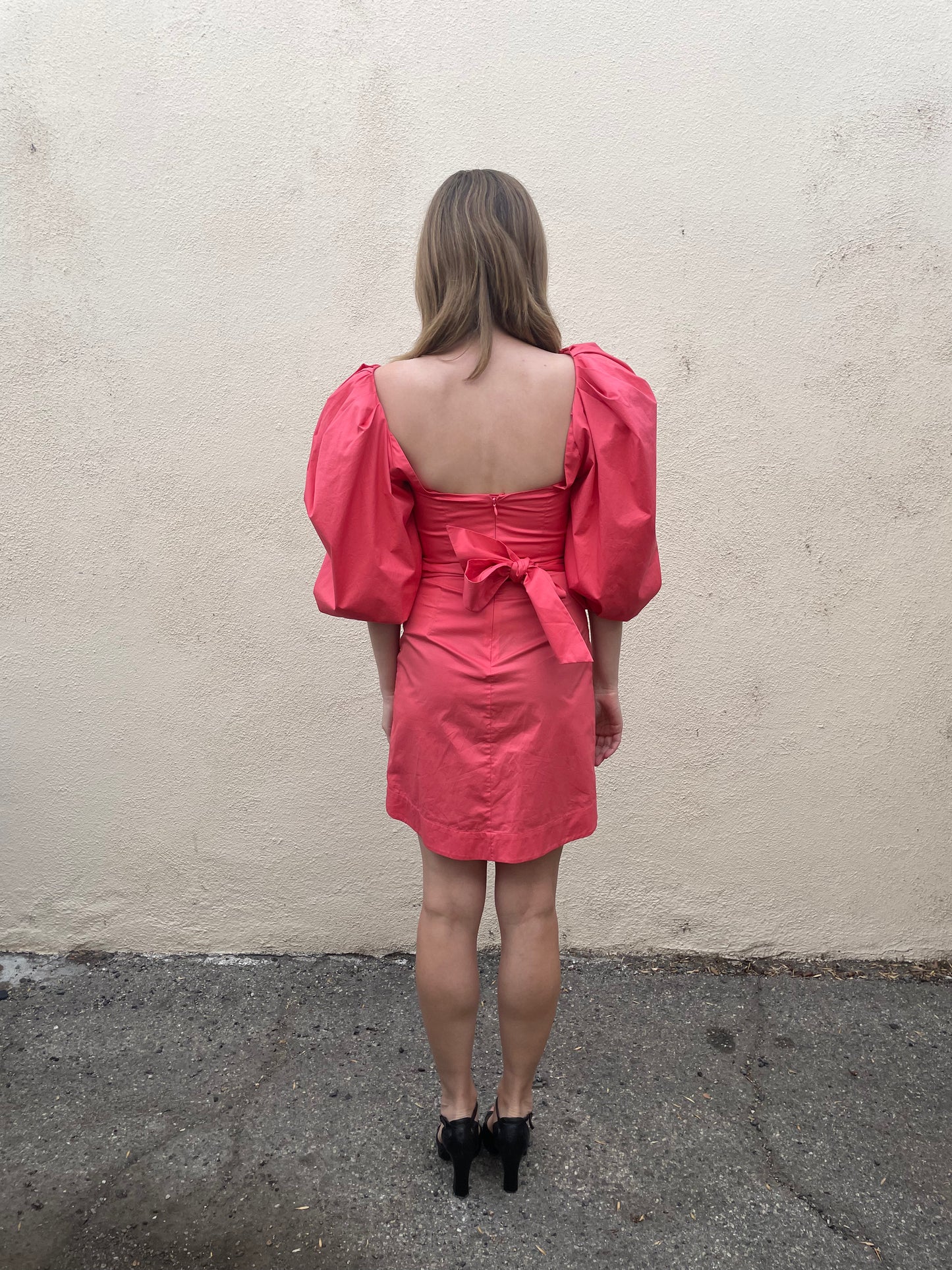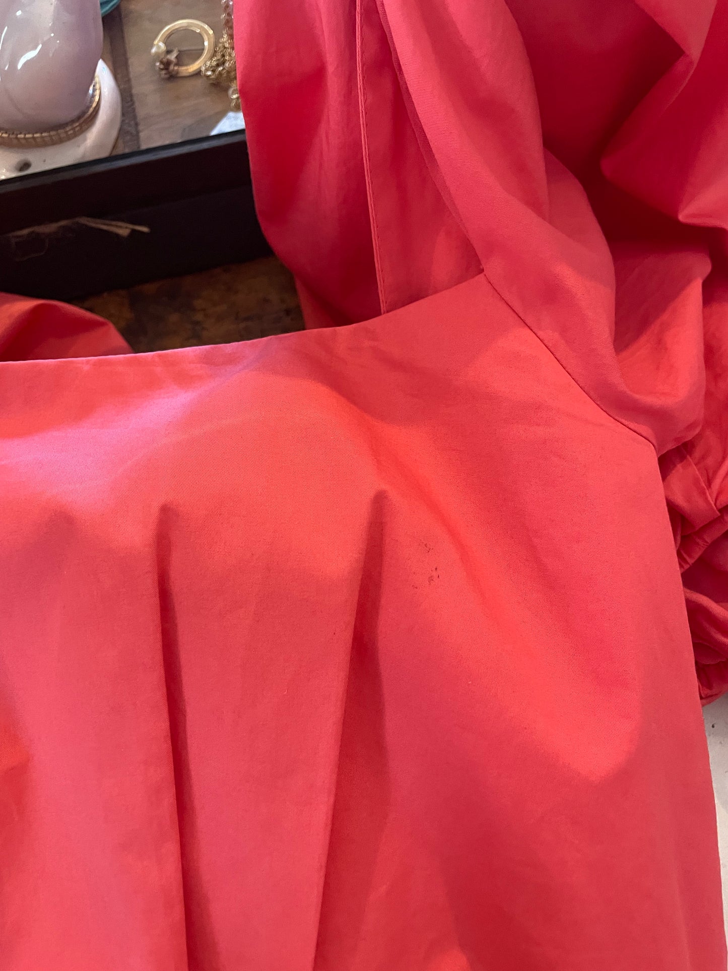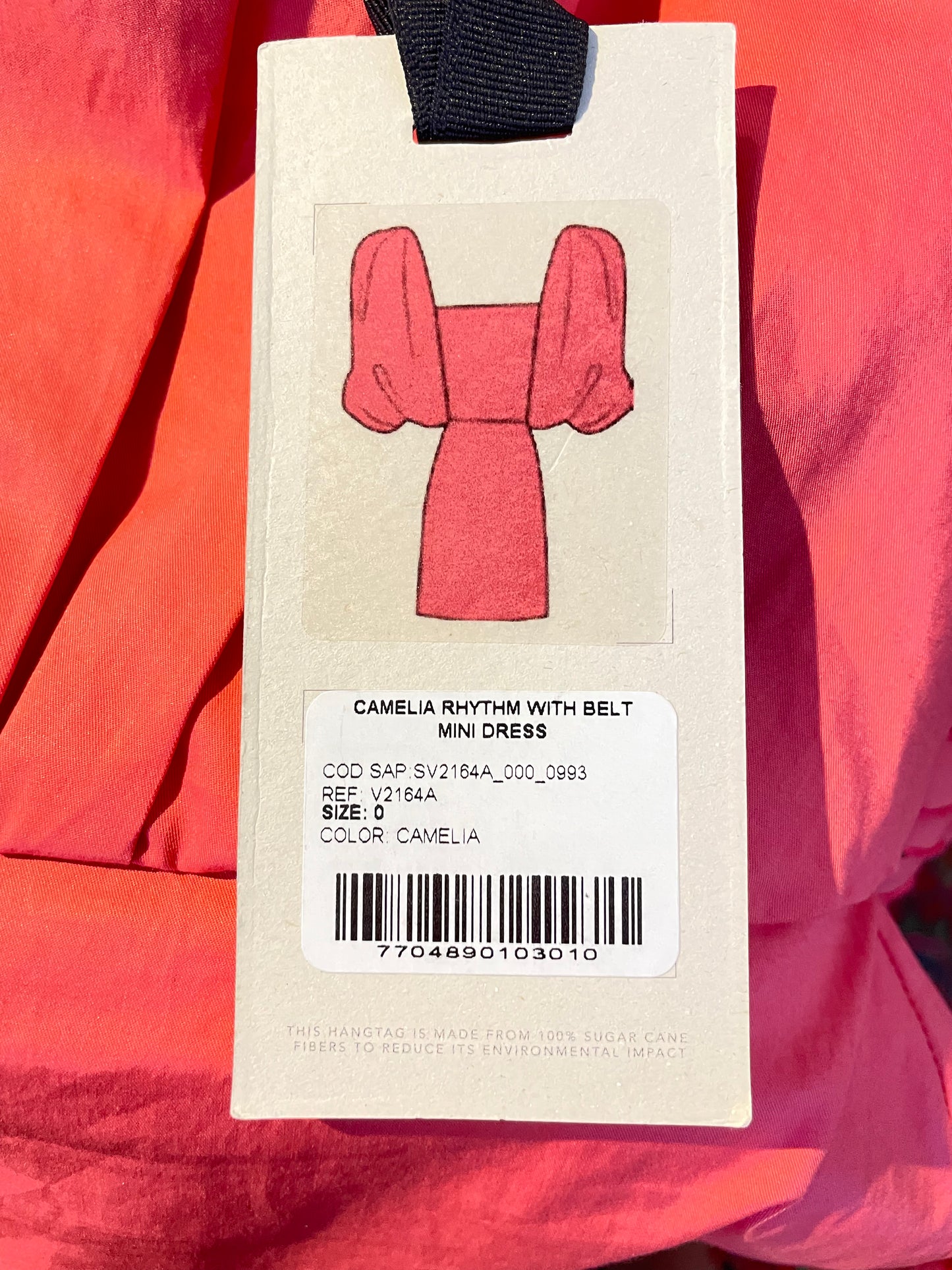 Johanna Ortiz Camelia Rhythm with Belt Mini Dress, size 0. Fits more like a 2 or a 4. Drama in all the right places. Bold sculpted puff sleeves, a clean square neckline, and a cinched waist with matching rope tie give this coral mini a strong feminine silhouette without feeling sweet. Confident, modern, and made for a good entrance. Minor stain, likely removable, only visible on close inspection.