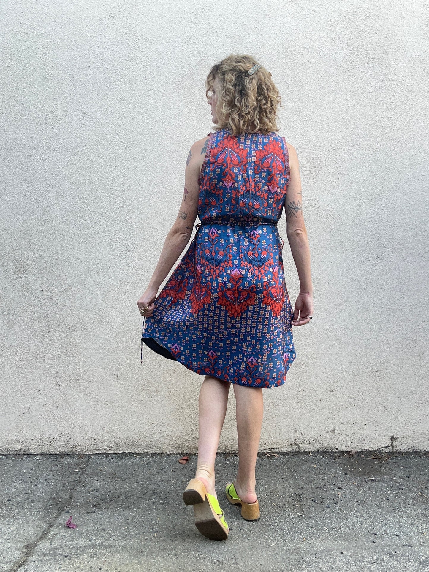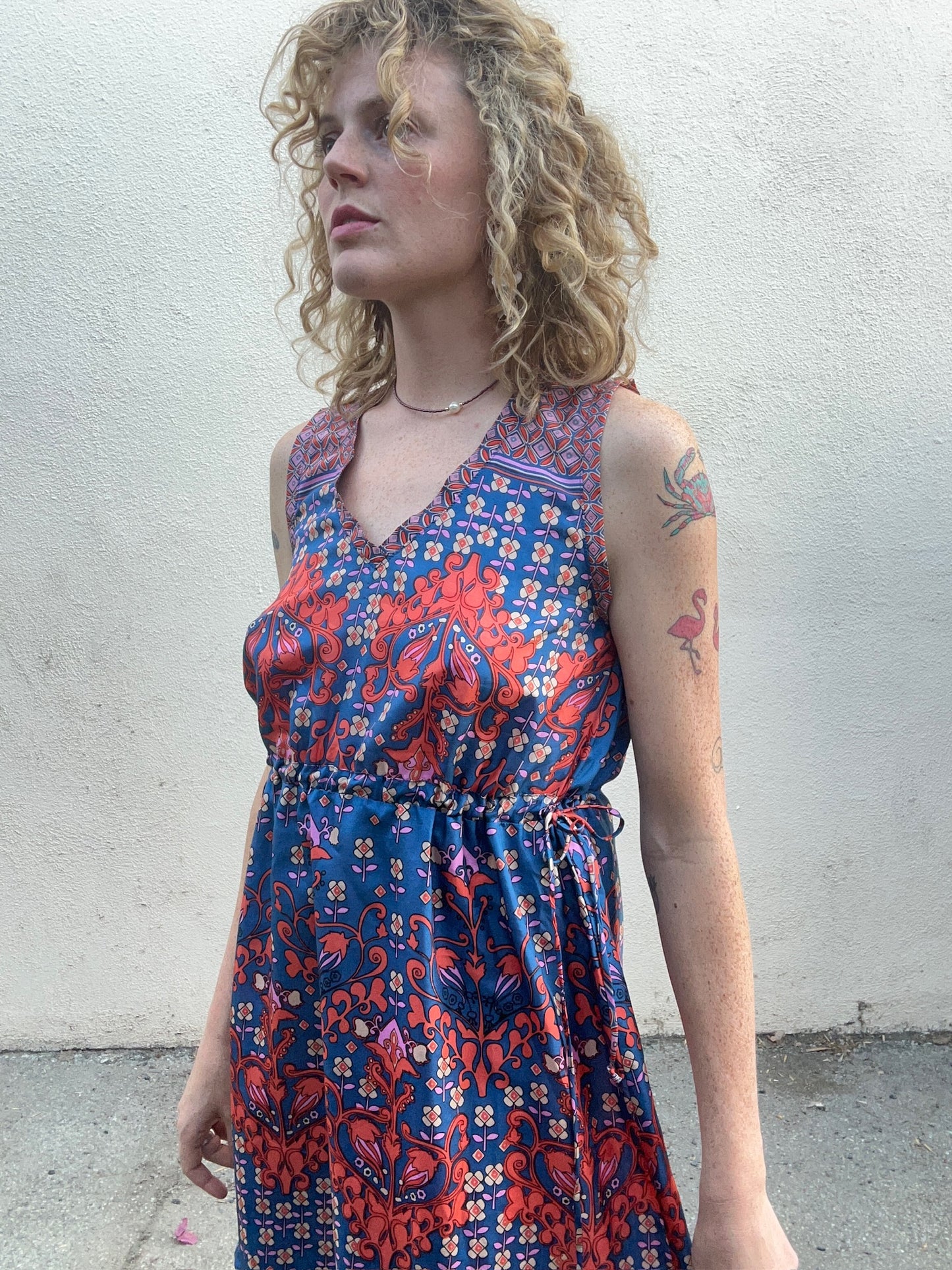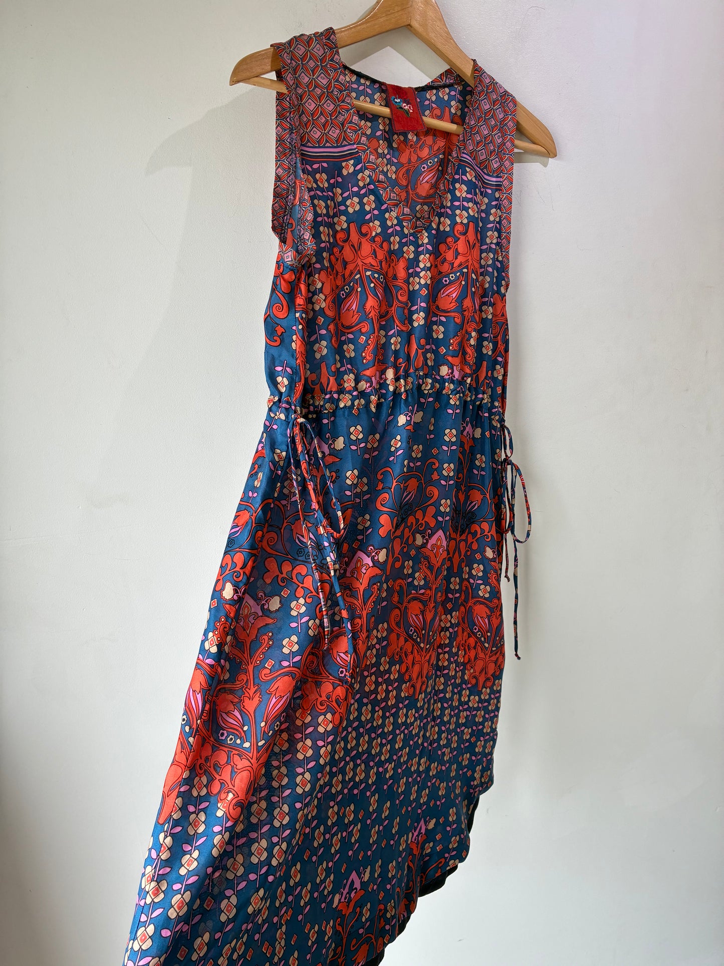 Johnny Was Blue and Orange Silk Floral Sleeveless Dress