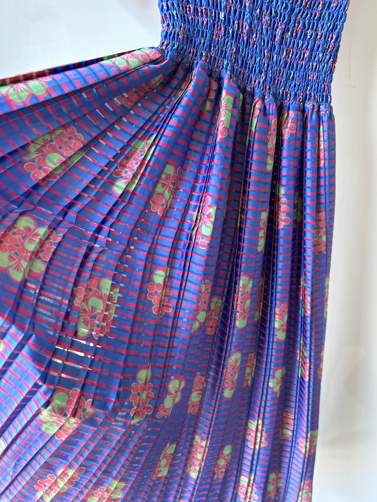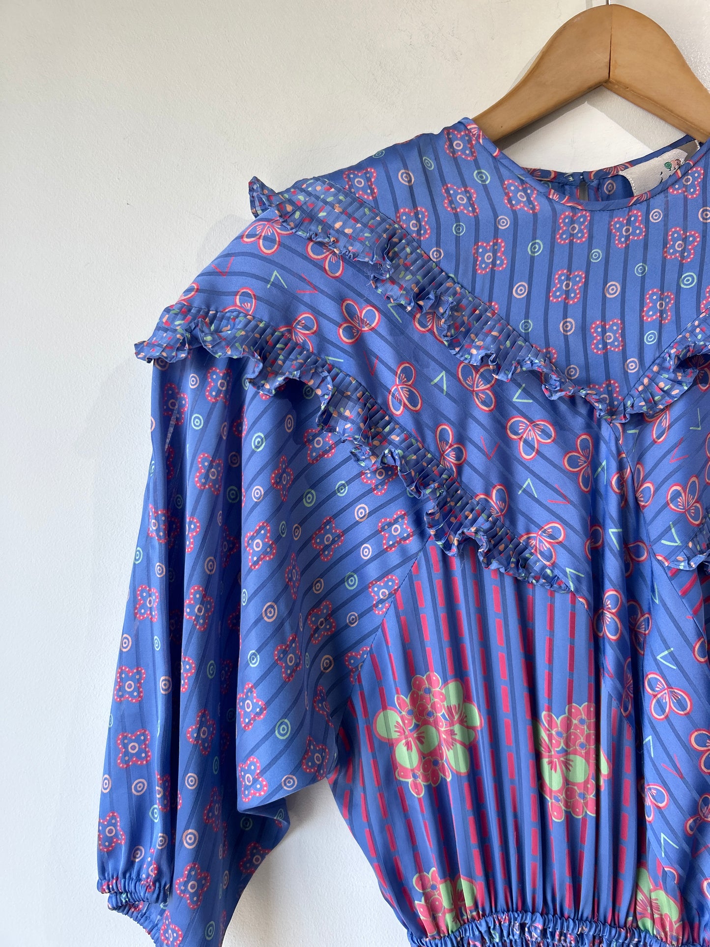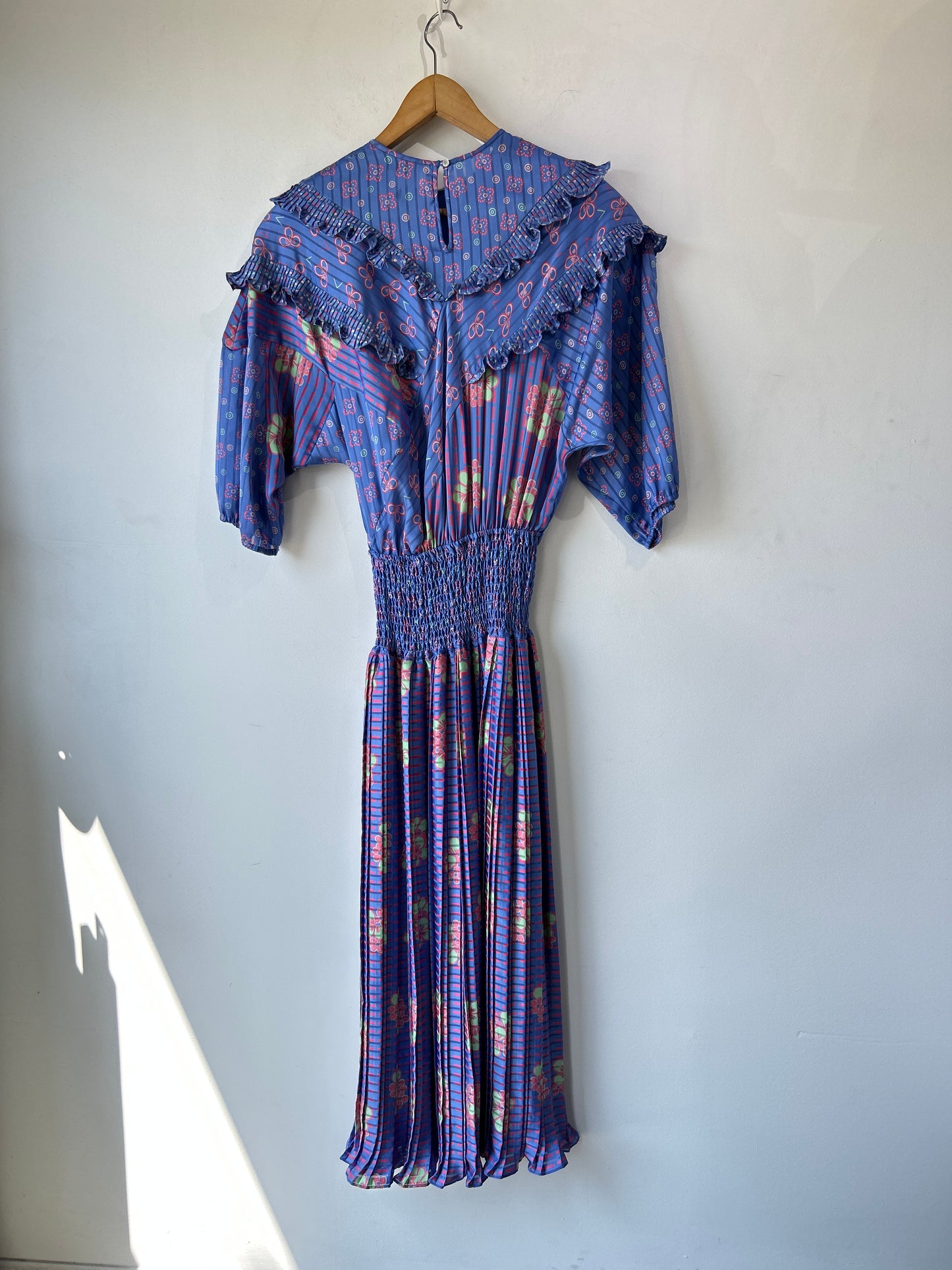 Judi Michael For Seasons 1980's Dress. Perfect '80s silhouette with big shoulders, cinched waist, and pleated bottom. Ruffles throughout the top and slightly sheer bottom. A fever dream! 100% Polyester, hand wash warm. Fits like a S/M.