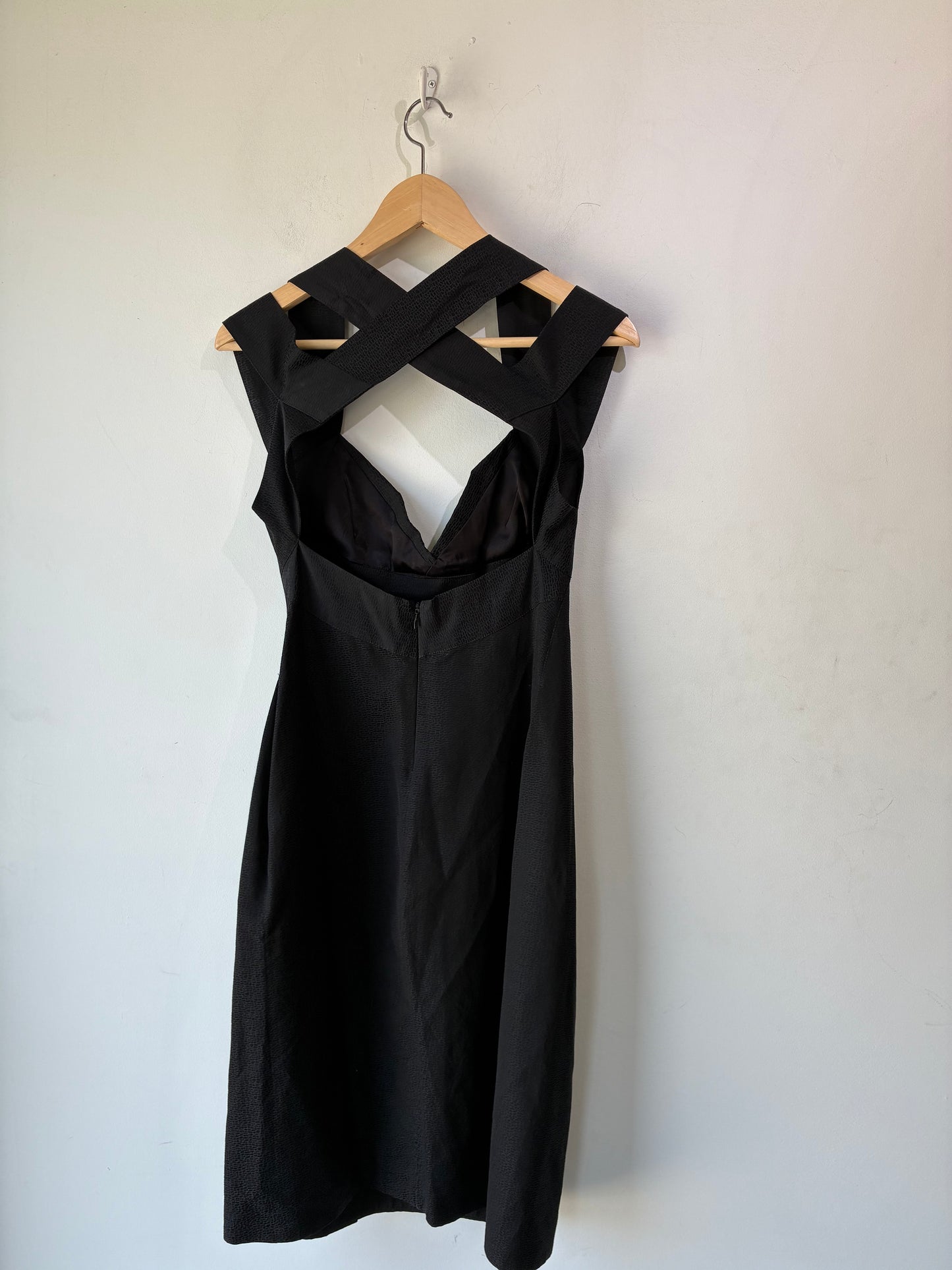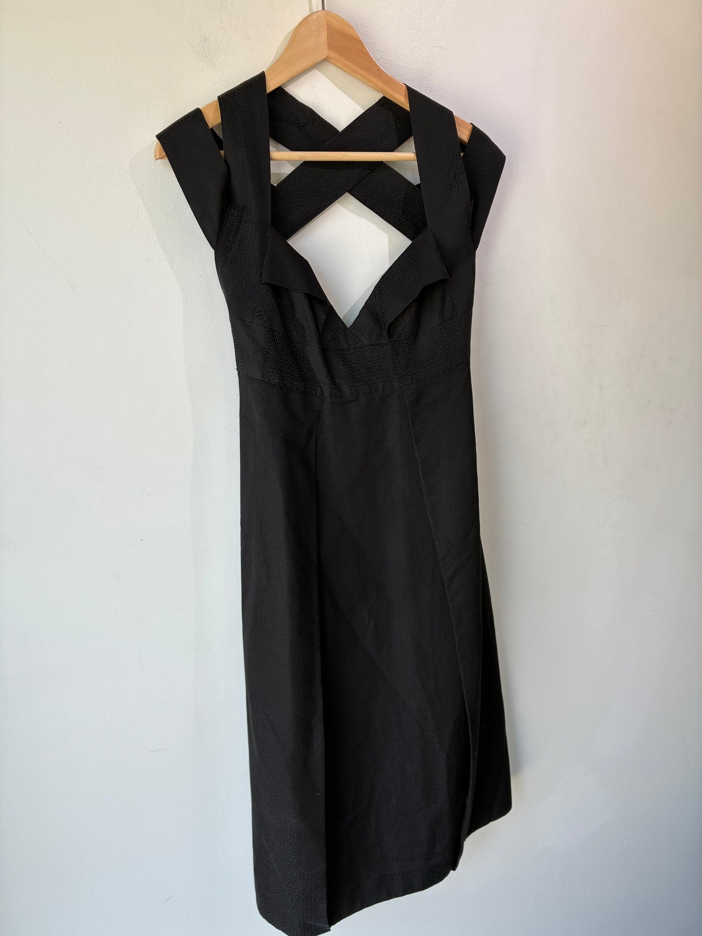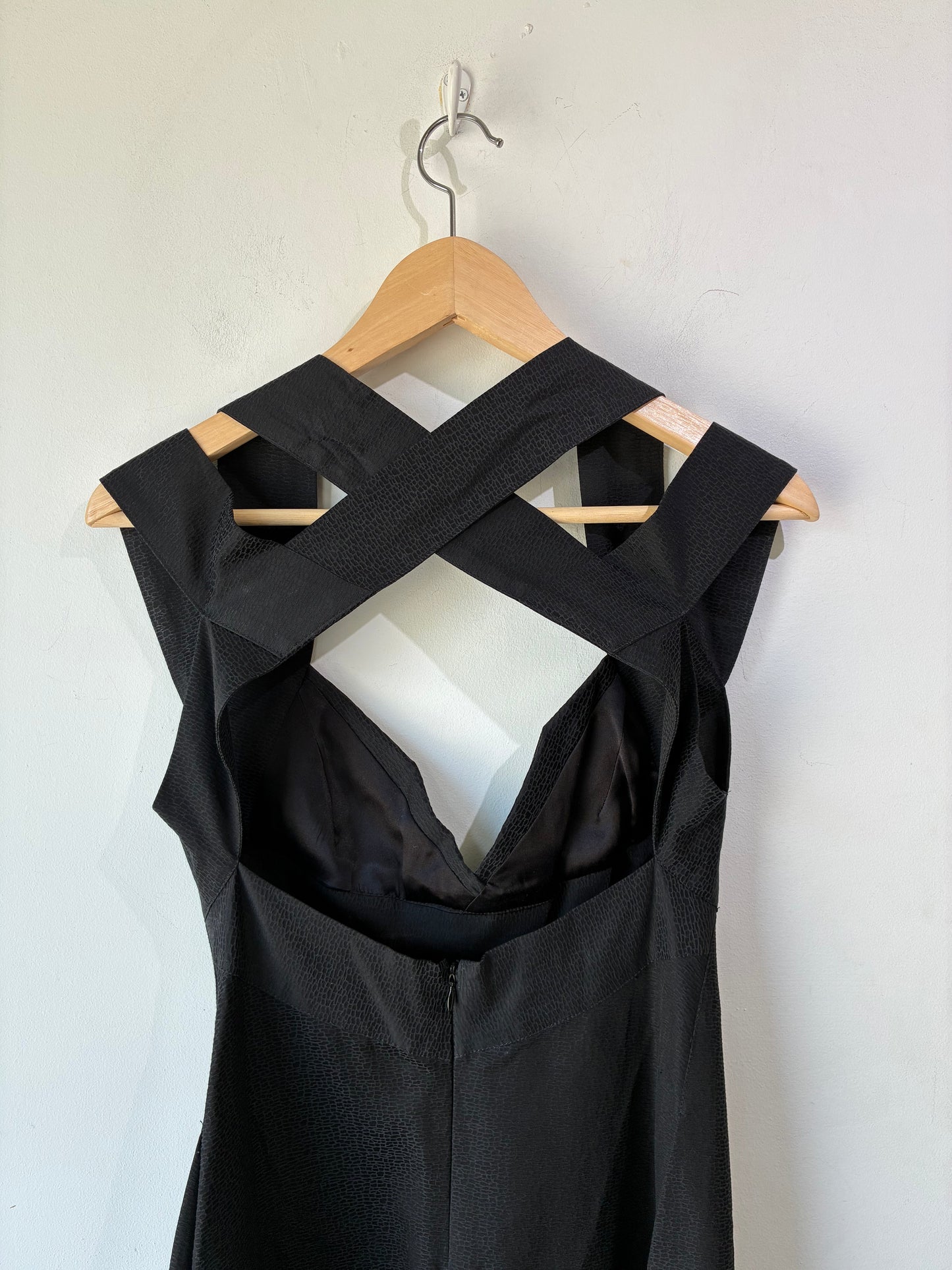 Kai Kuhne Black Strappy Dress. Both striking and stunning, this gorgeous dress features a small scale reptile texture, a sweetheart neckline with bust folds and an open back with wide criss-cross straps at the shoulder blades. Add semi-fitted skirt with fold pleats to the hemline and you have got a real head-turner. A beautiful and memorable choice for any occasion! Dress is in excellent condition and is free of stains, tears and defects.