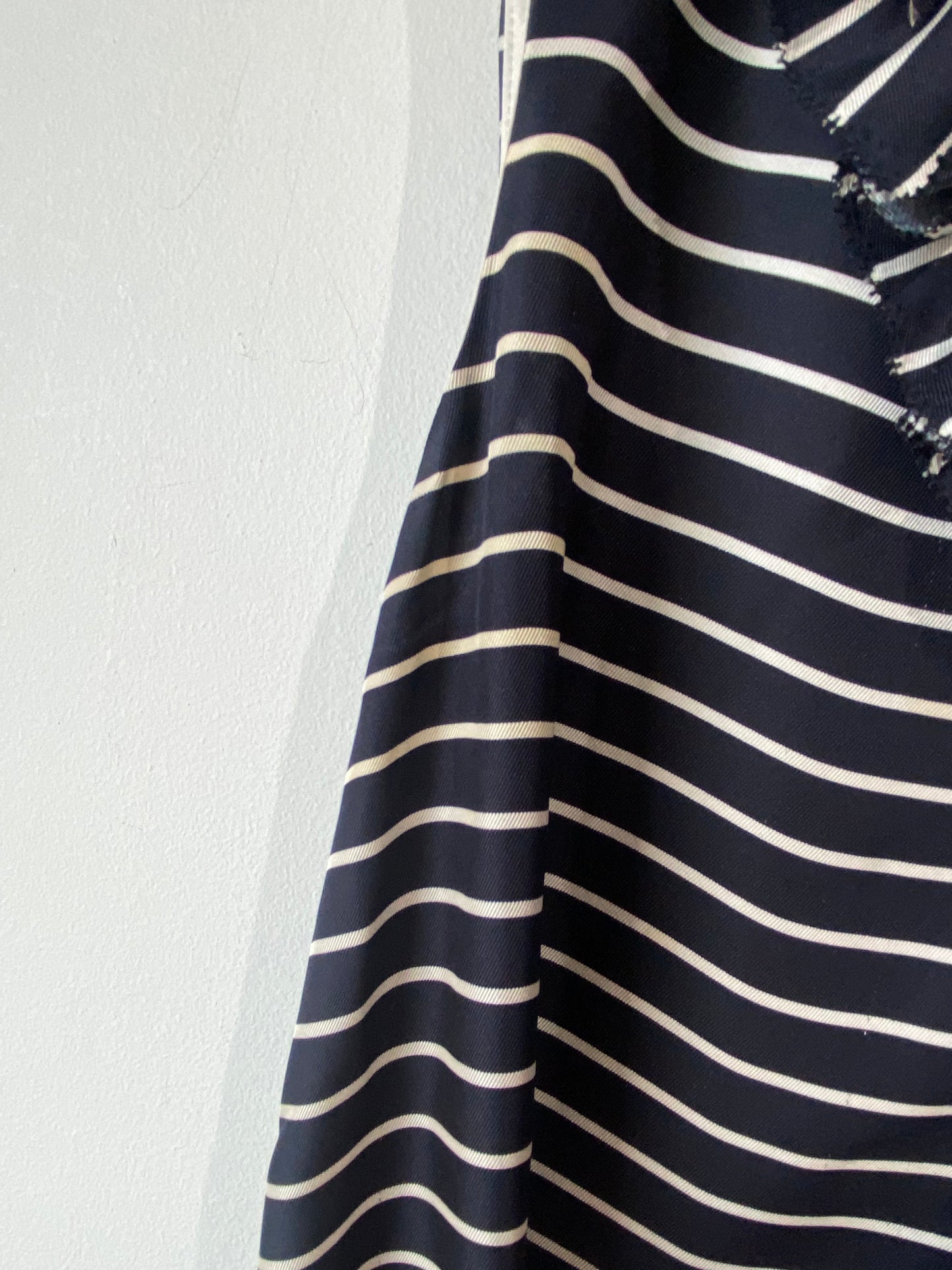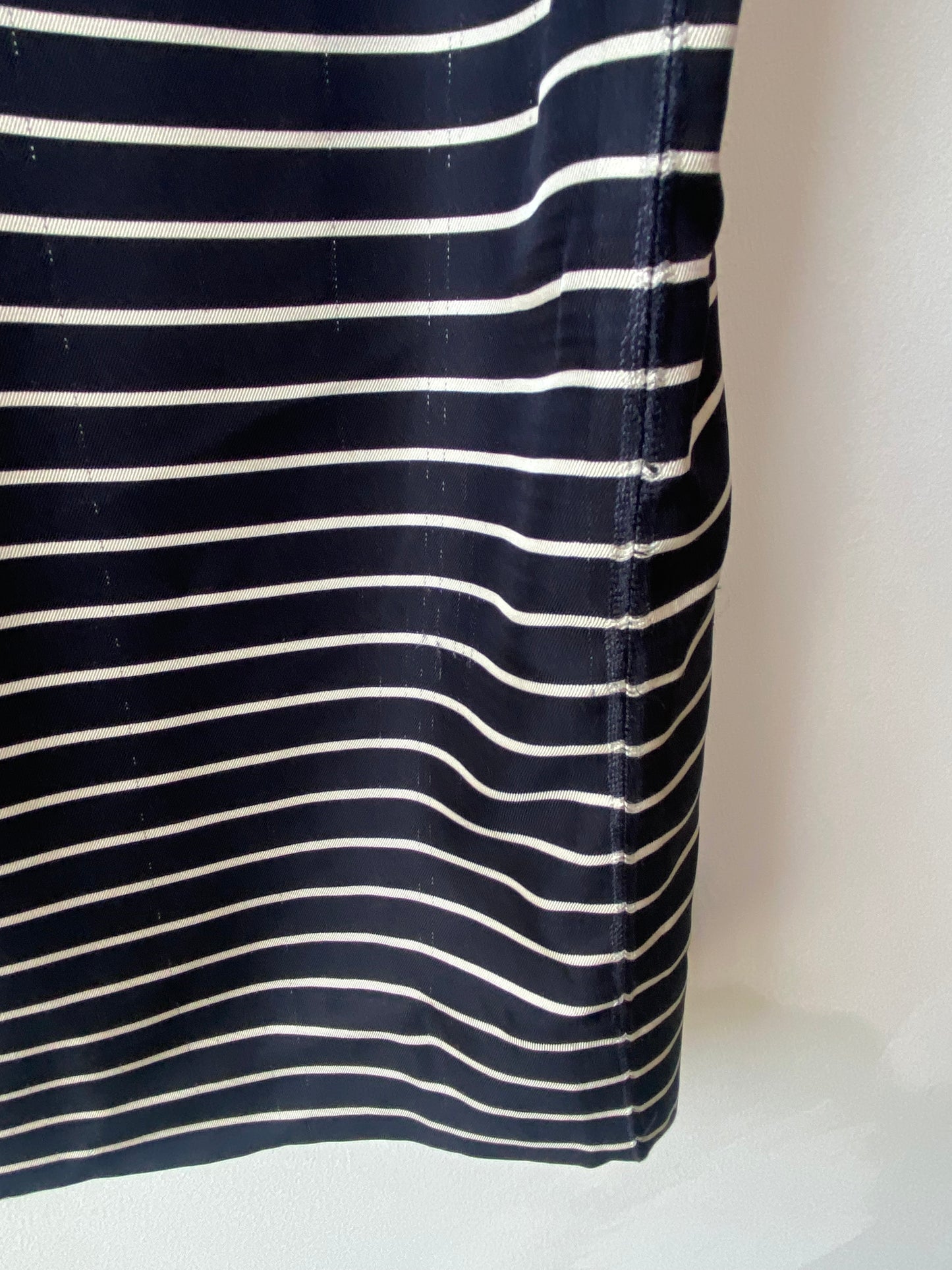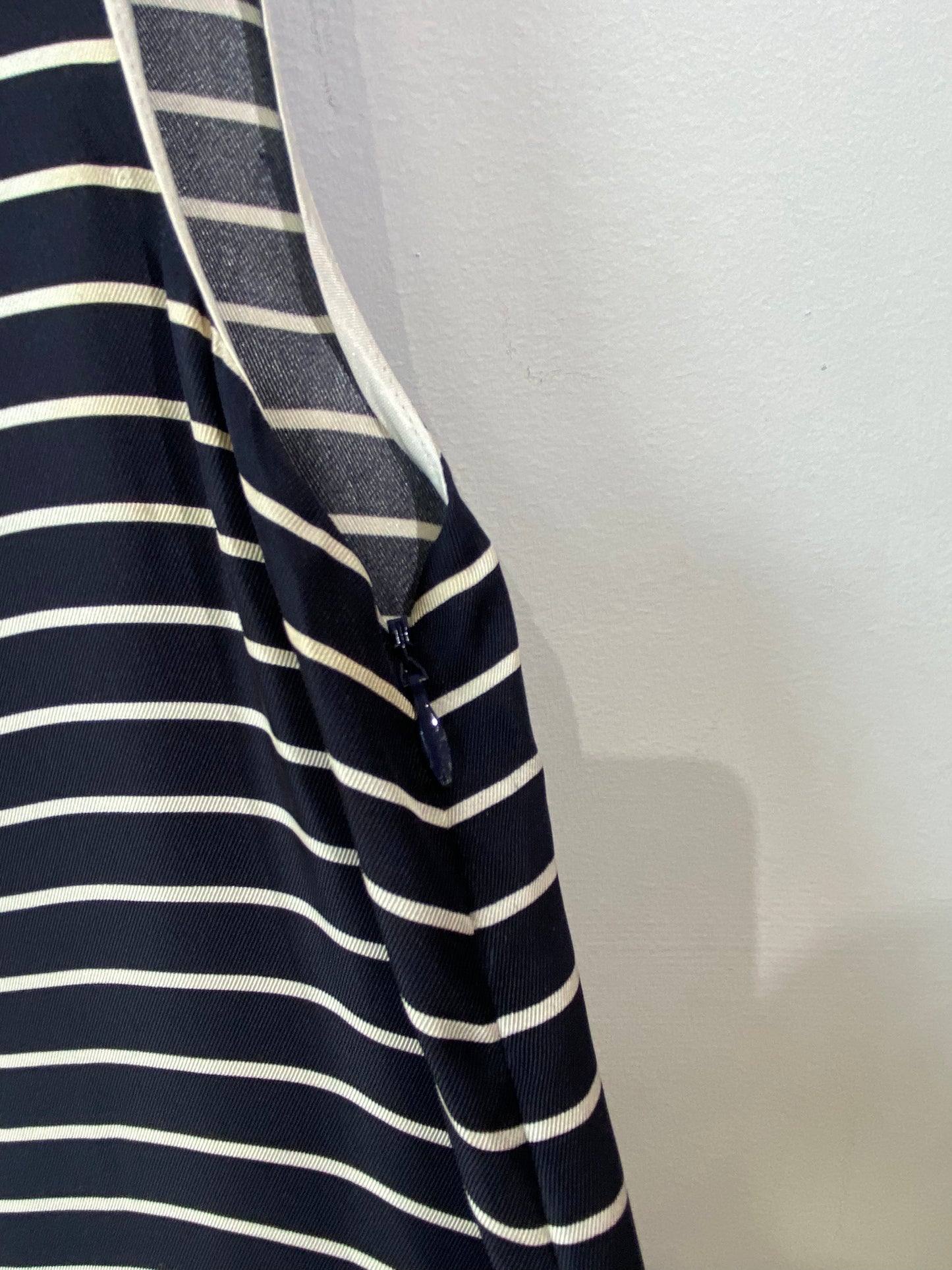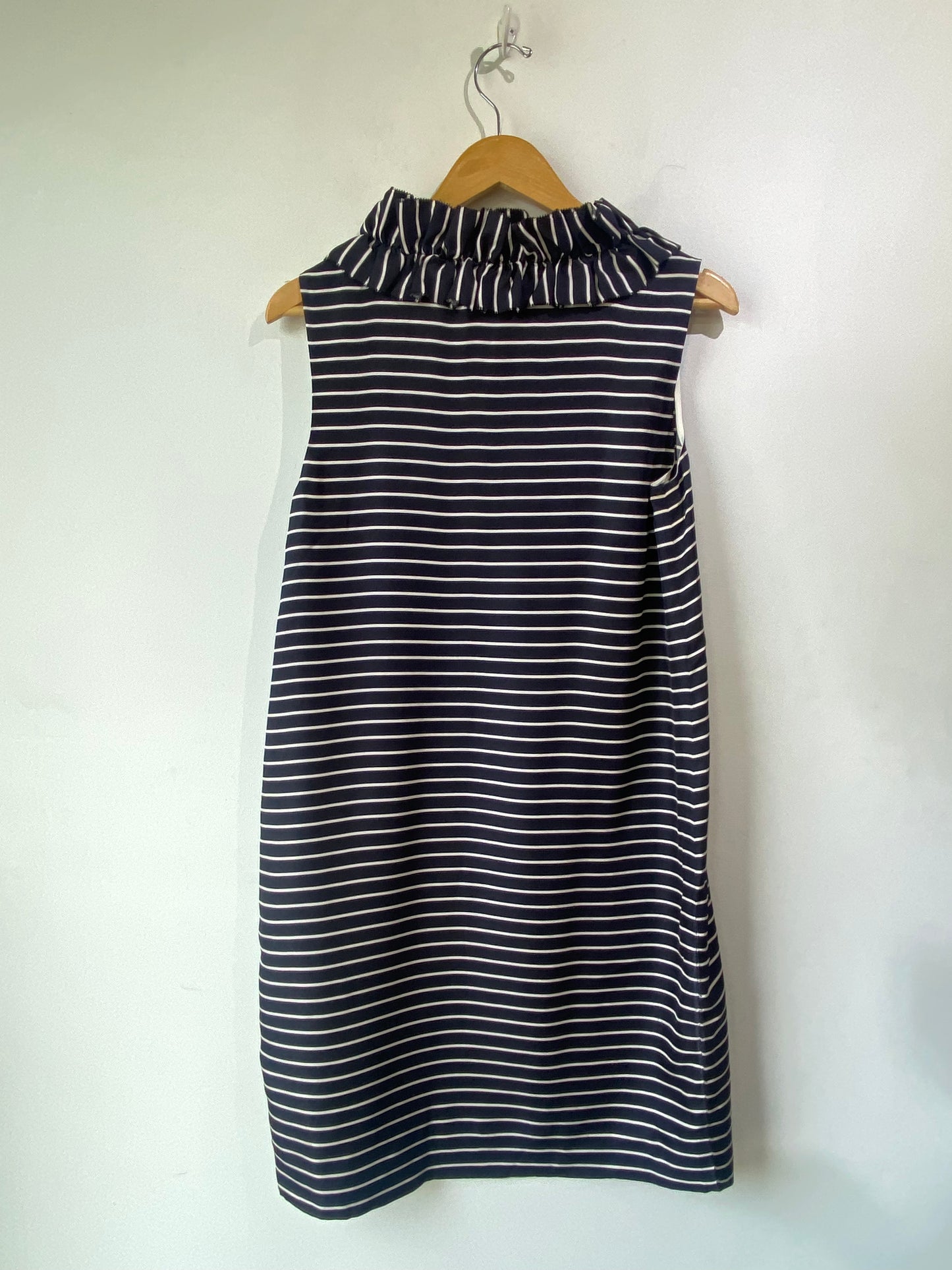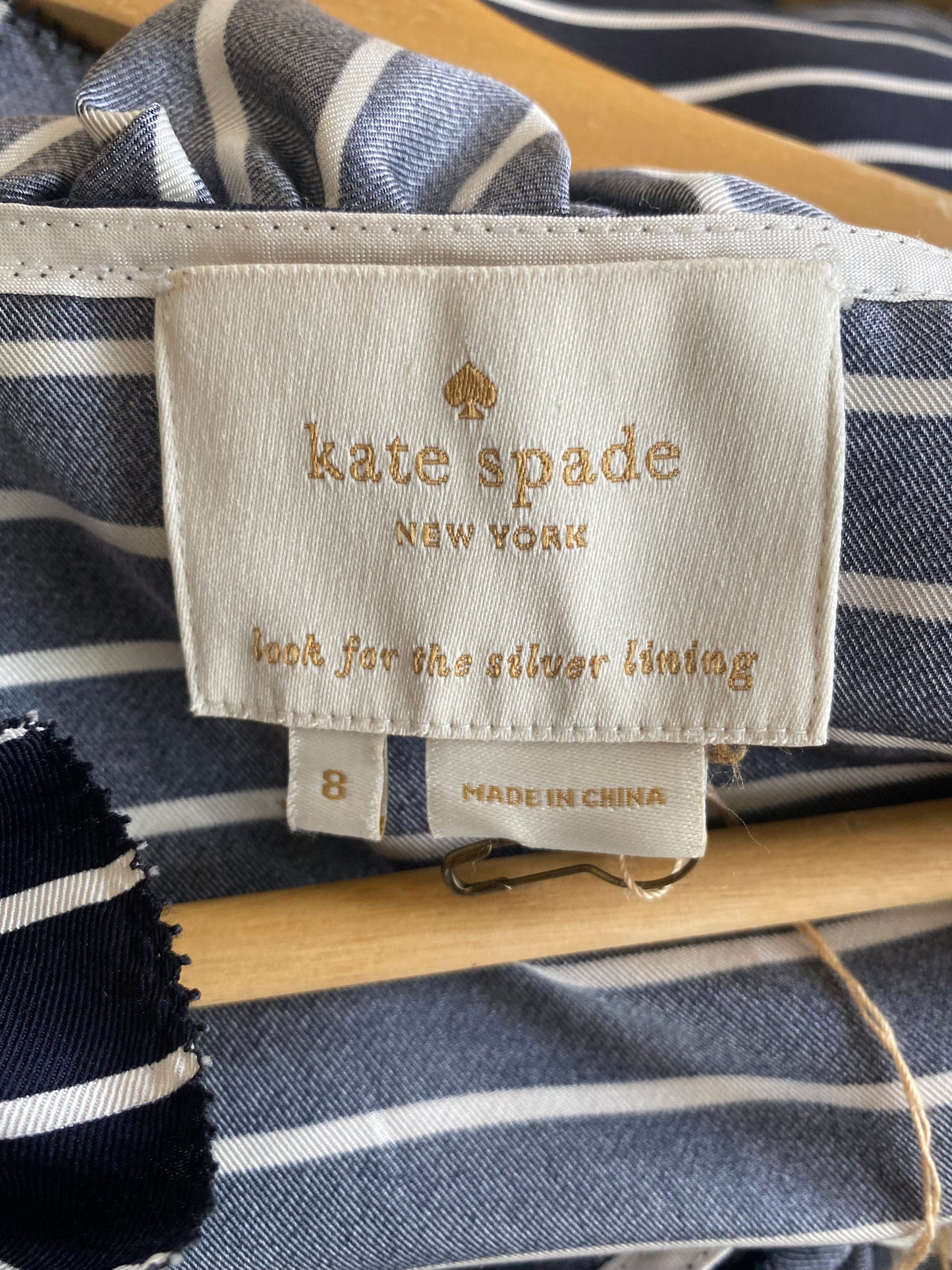 Kate Spade Striped Silk Dress! Black and white stripes throughout with ruffles along the collar and a zipper on the side. Unlined. Dry clean only. Size 8, please refer to measurements. In overall great condition with minor wear under the pits and on the back near the hem.