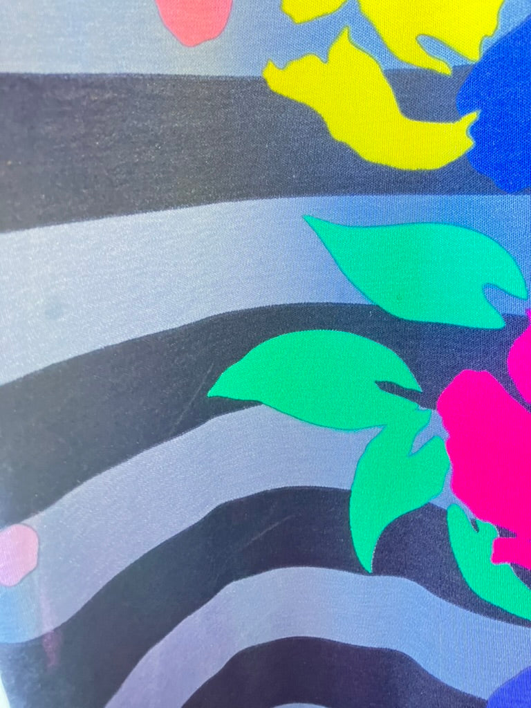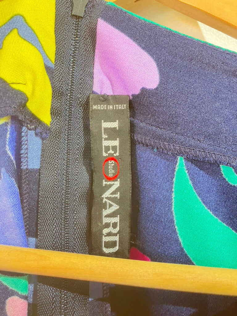 Vintage Leonard Paris Navy & Neon Floral Silk Dress in great vintage condition. Gorgeous floral printed long-sleeve silk jersey with straight hang and high scoop neck. Signature is hidden in the flora! Soft and breathable. 100% silk. Best fits L/XL. Made in Italy. Dry clean only. Two small spots near right front waist line. Hardly visible.