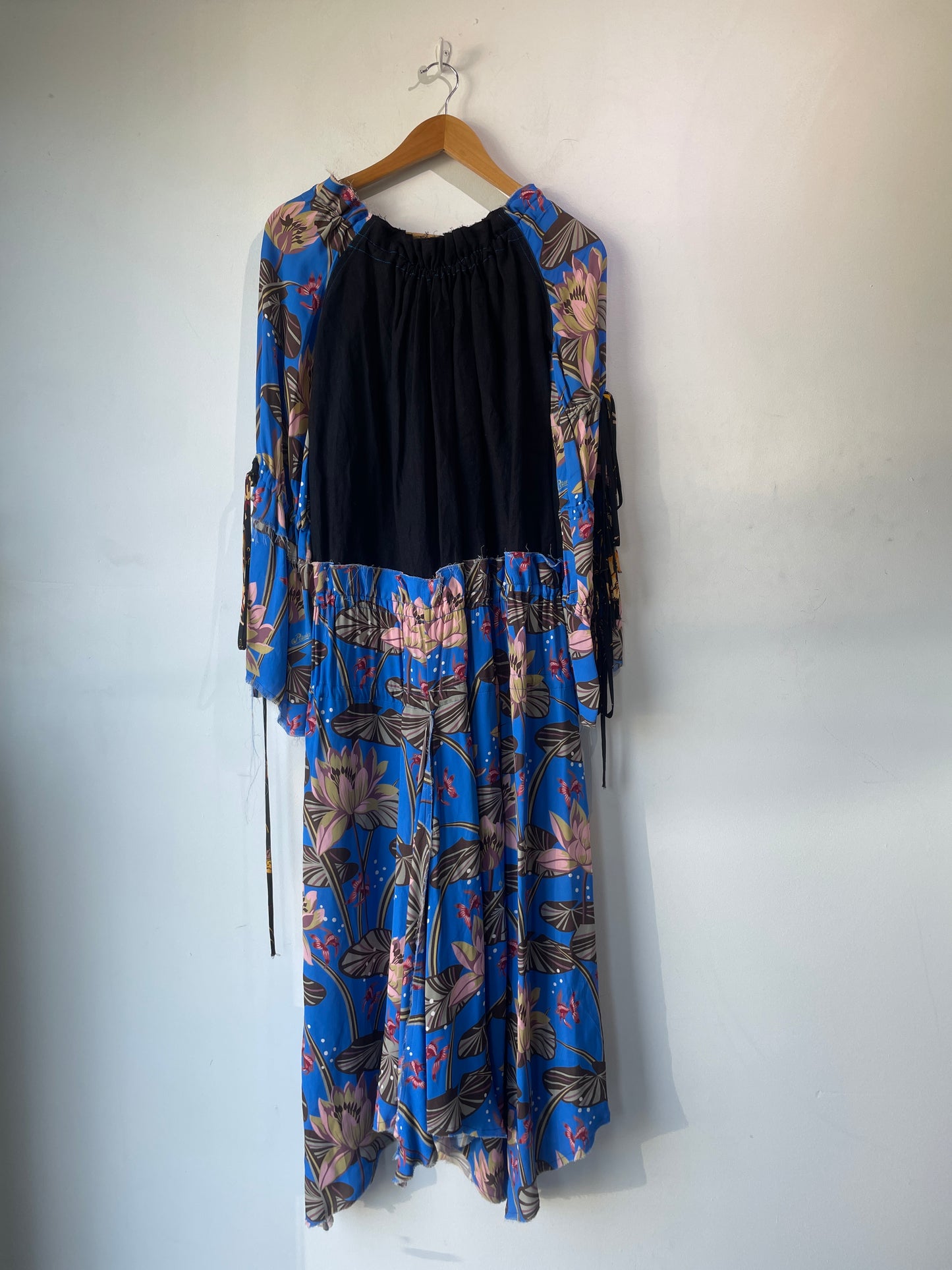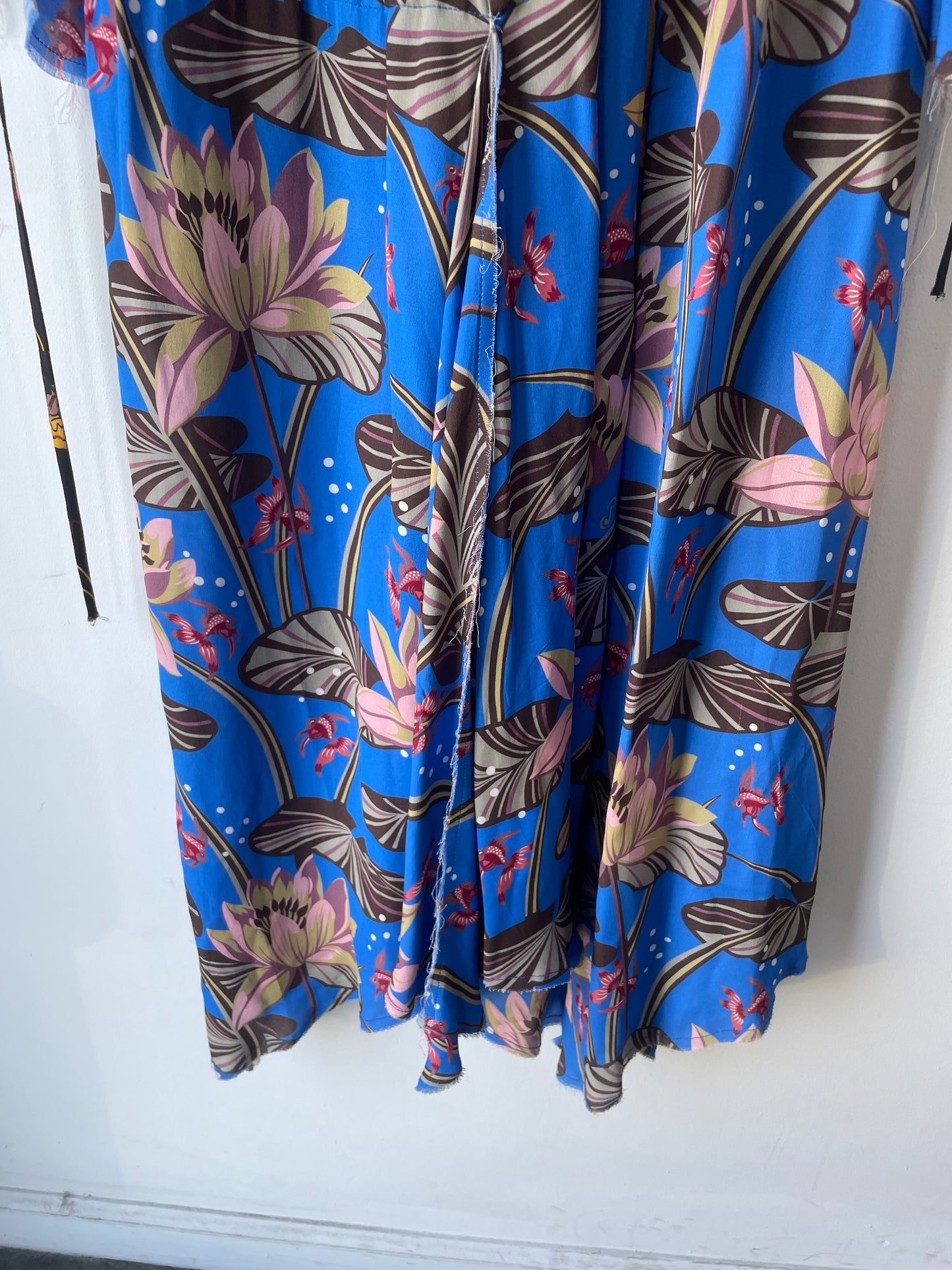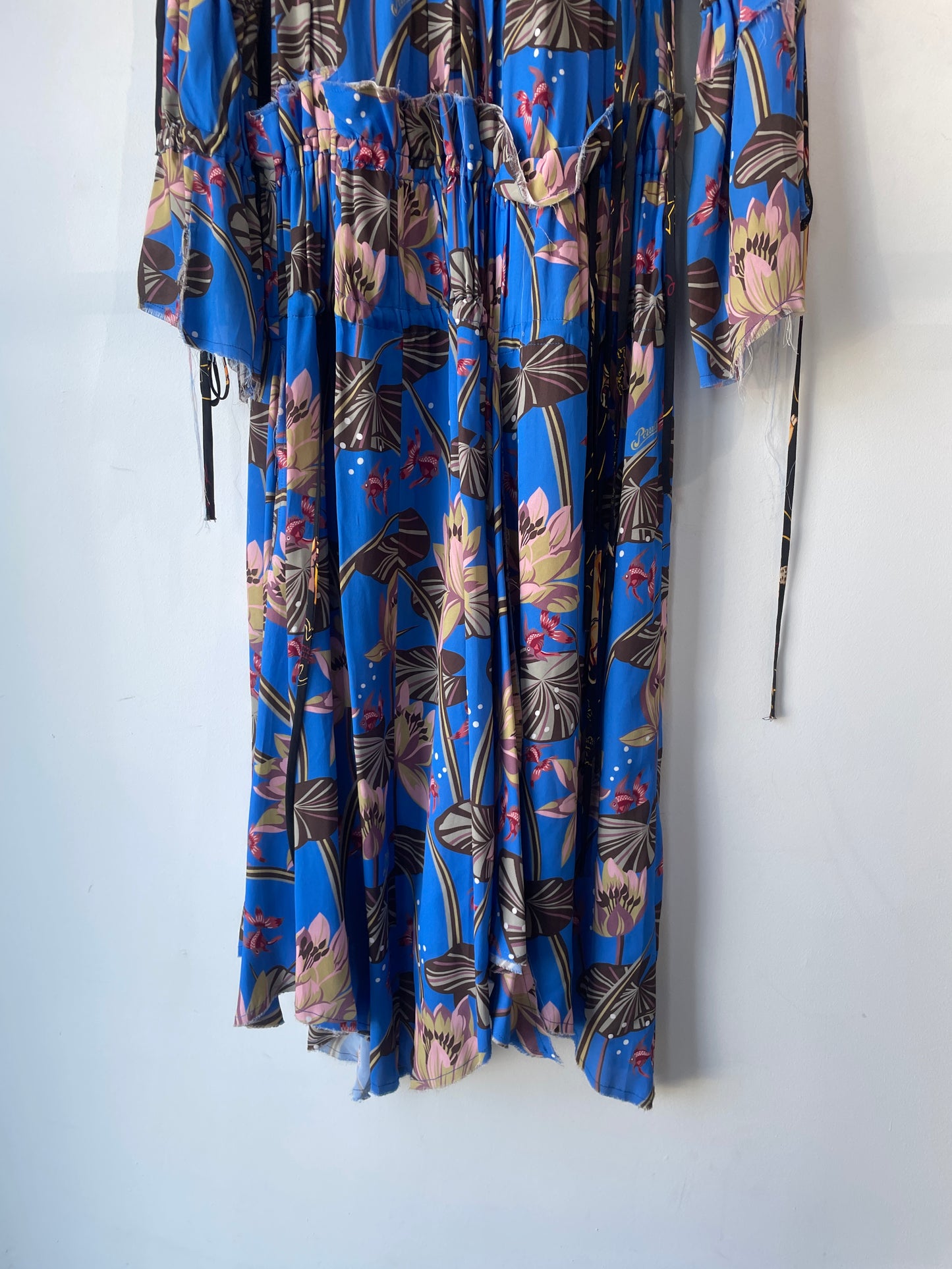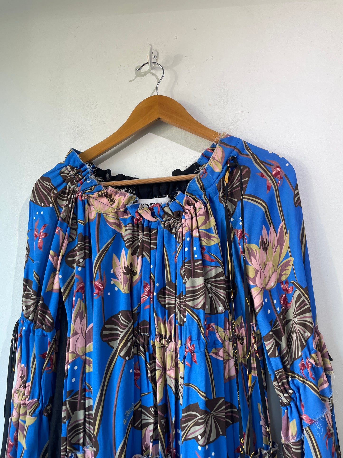 Loewe Blue Fish Floral Print Ruffled Dress. A beautifully designed blue ruffled dress. Features many fun details including multiple ties on waist, shoulder and bell sleeves for ruching and random frills off of the skirt. The design is very adjustable for many silhouettes and transformations. Also features a floral goldfish print from Paula. In excellent condition. No size tag, could fit S-M, please refer to measurements.