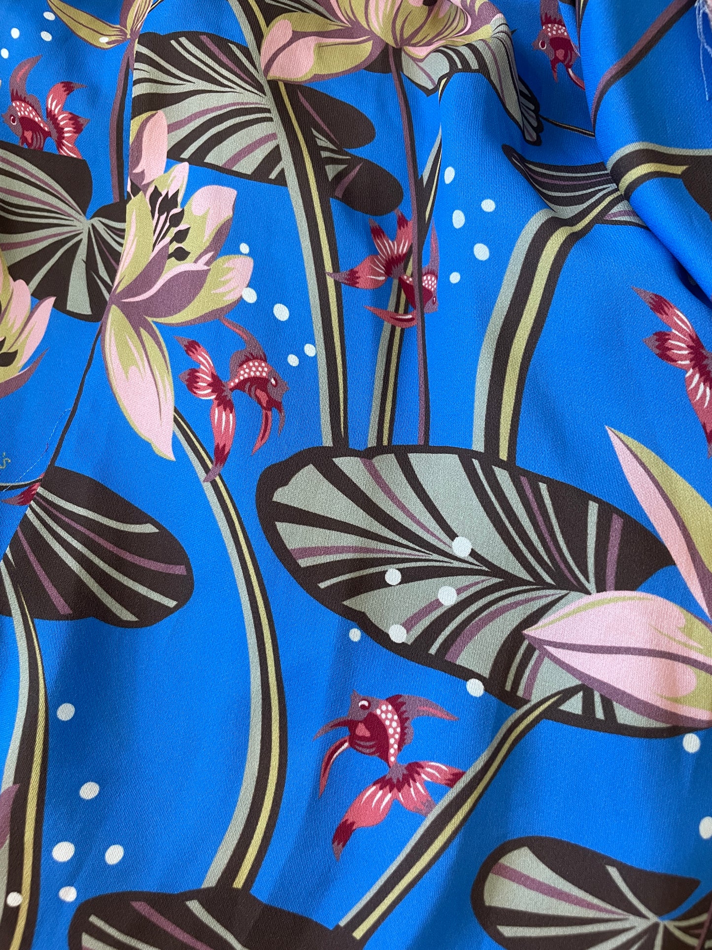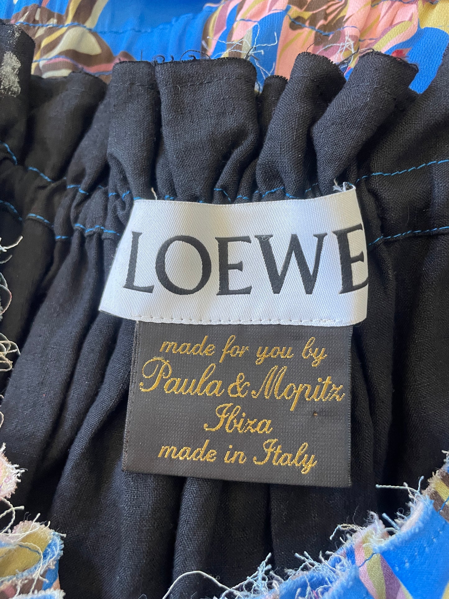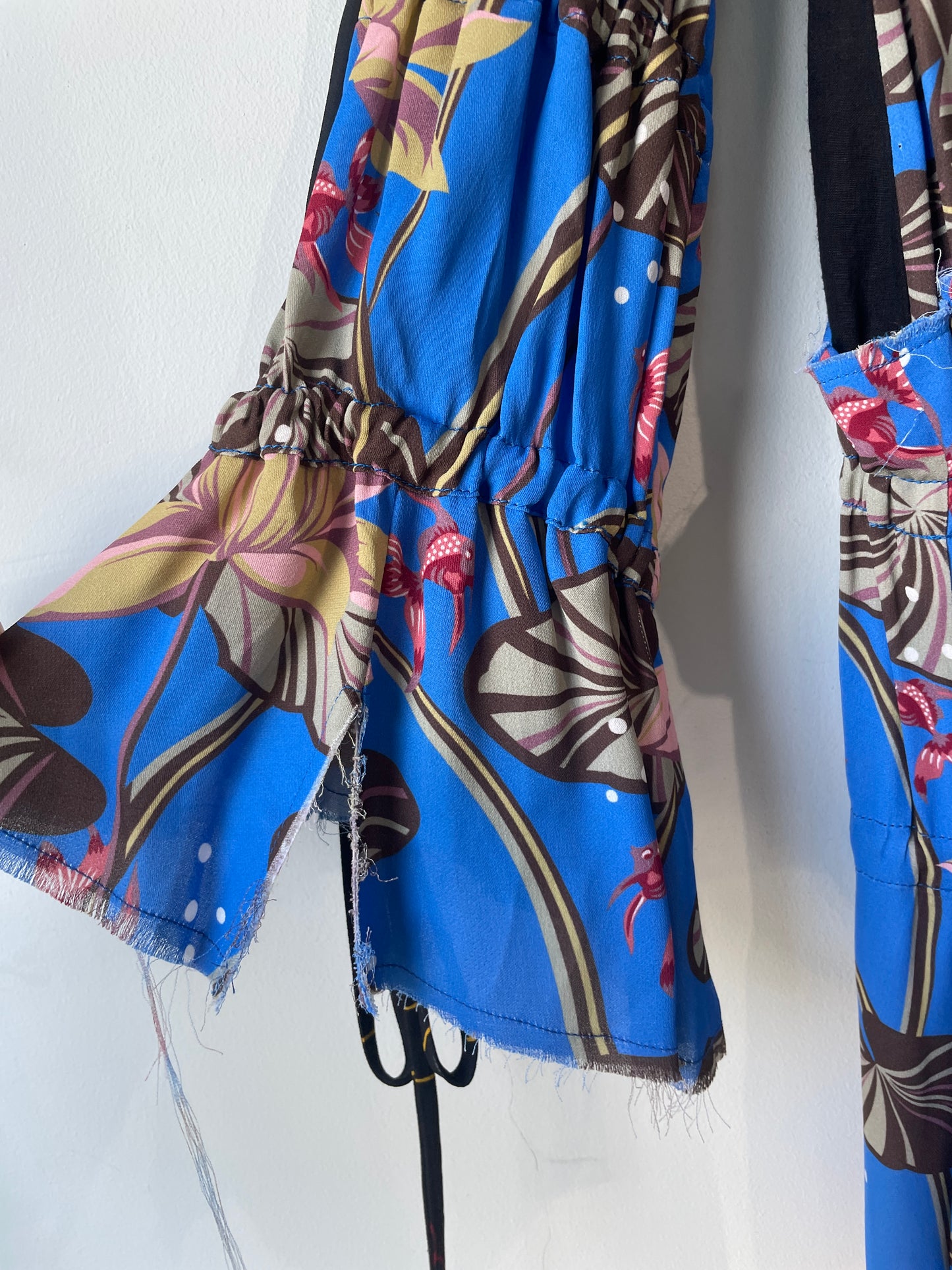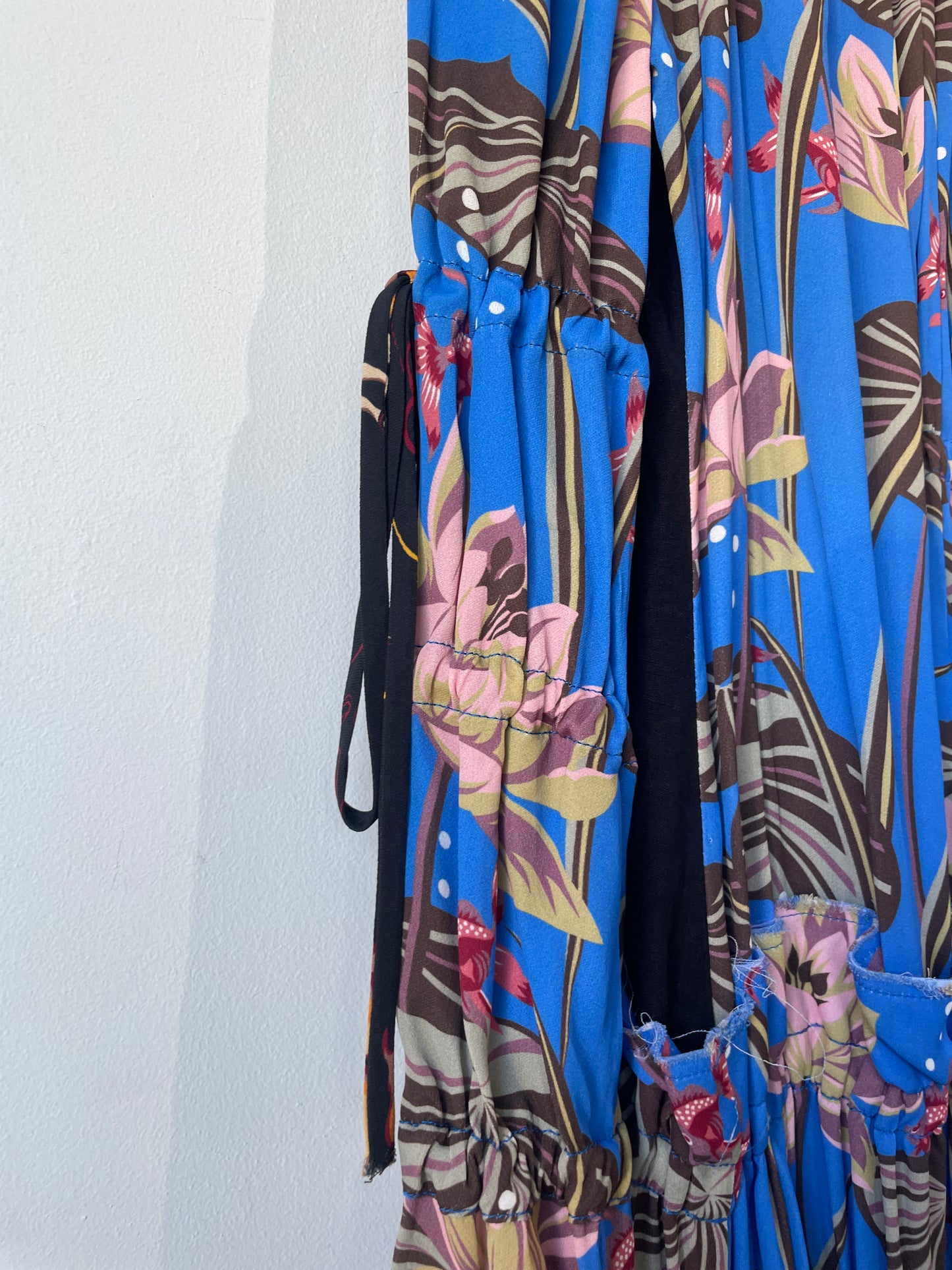 Loewe Blue Fish Floral Print Ruffled Dress. A beautifully designed blue ruffled dress. Features many fun details including multiple ties on waist, shoulder and bell sleeves for ruching and random frills off of the skirt. The design is very adjustable for many silhouettes and transformations. Also features a floral goldfish print from Paula. In excellent condition. No size tag, could fit S-M, please refer to measurements.