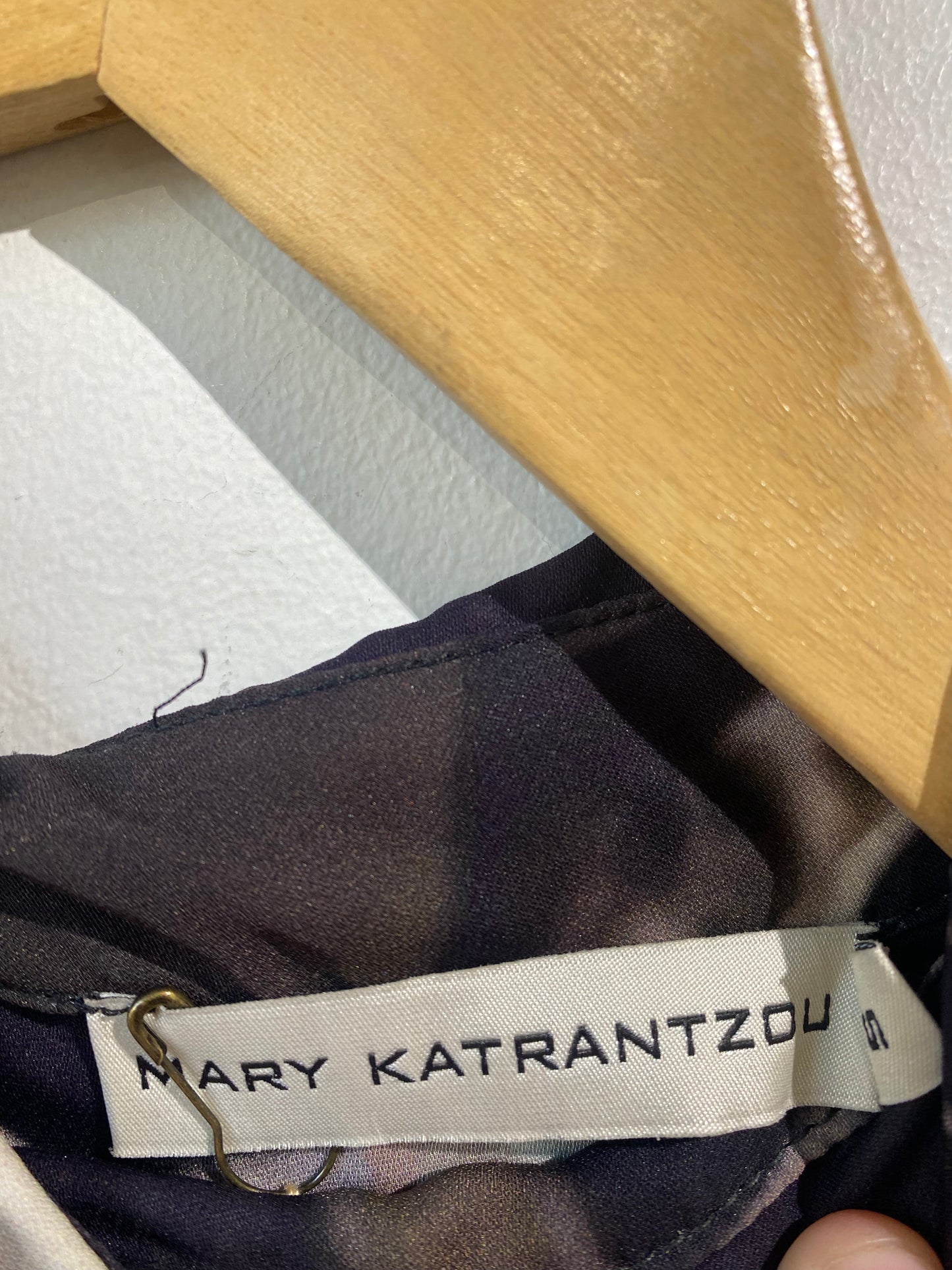 Mary Katrantzou Sheer Black with subtle Purple Orchid shirt dress with pointed collar. Marked size S. In excellent condition. Material is black, white, brown and a bit of purple. 100% silk.