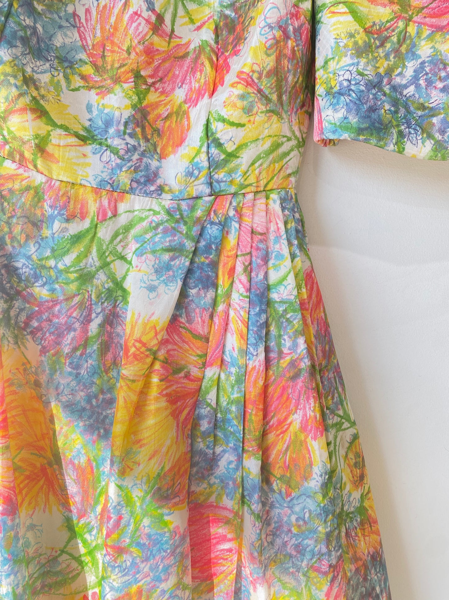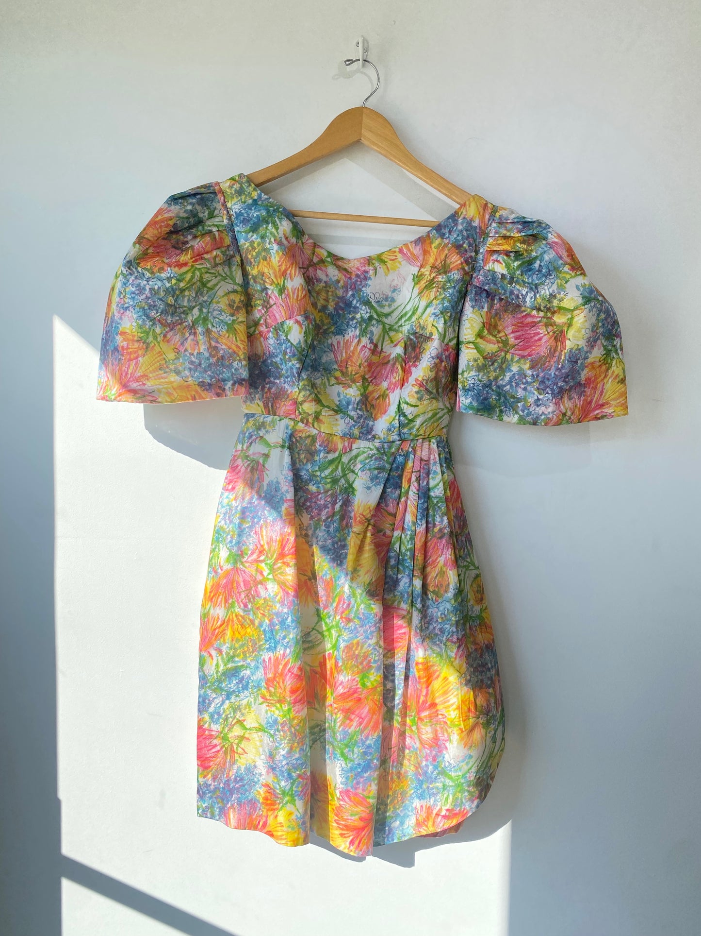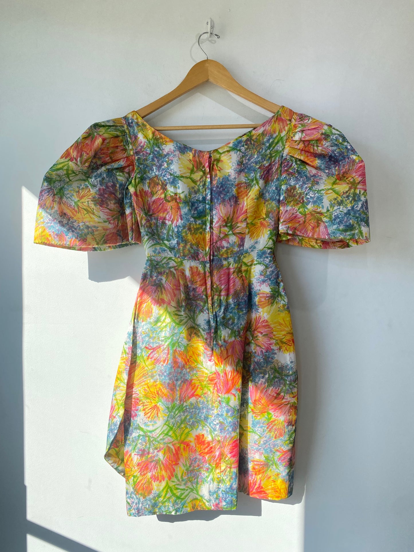 Multicolor Poly Dress. Hand sewn netted puff sleeves, unique pleated skirt and wide boat neck. Gorgeous vibrant floral. Fits size s/xs best. Sold as is.