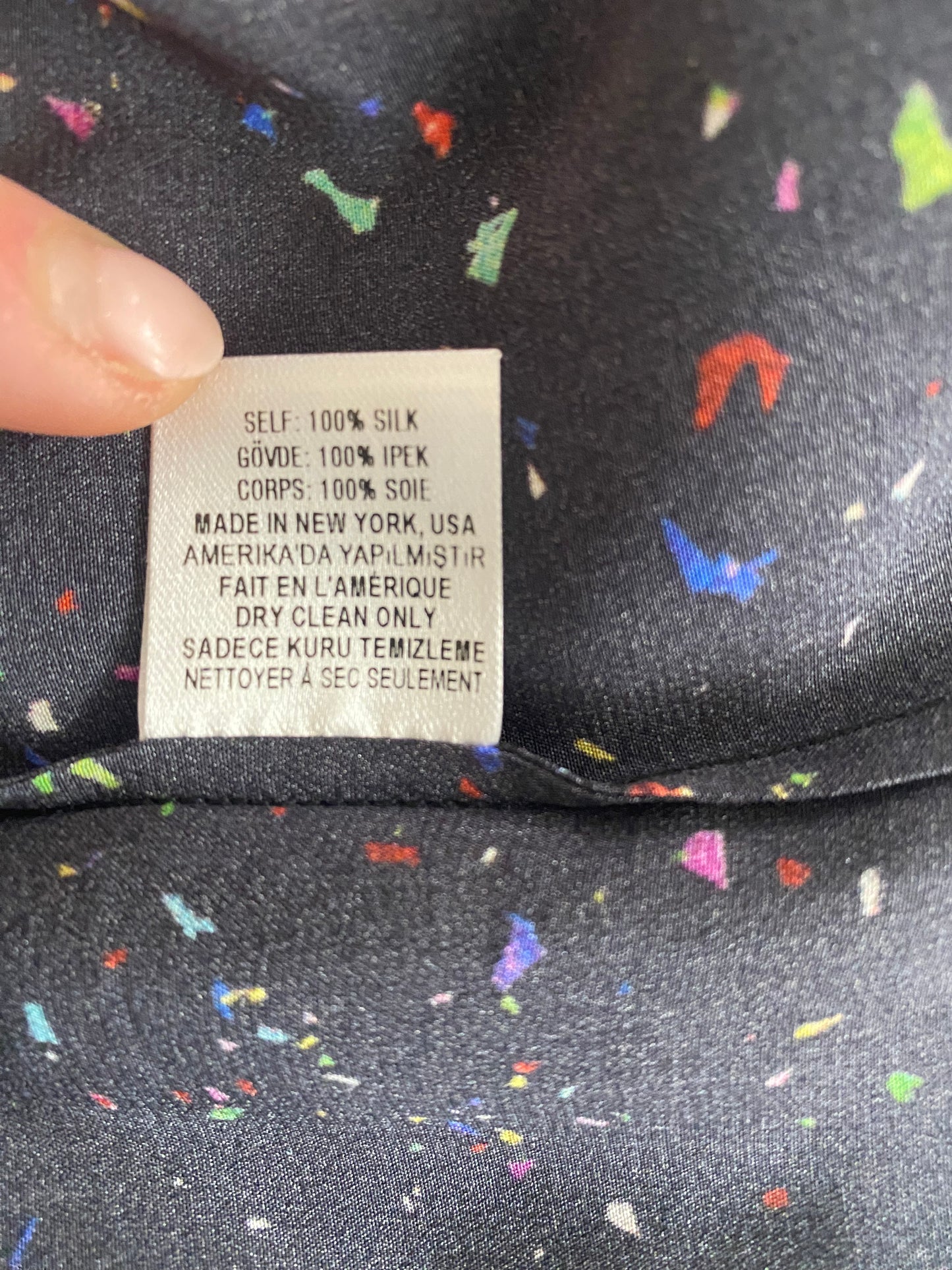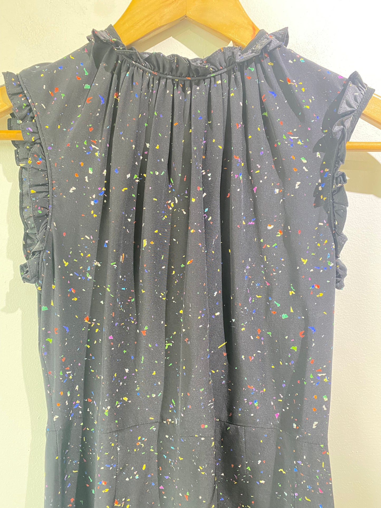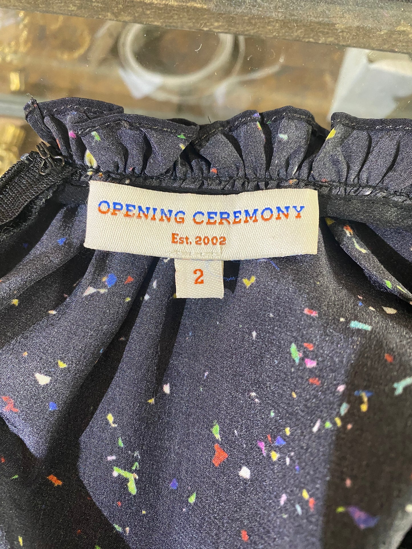 Opening Ceremony Confetti Silk Dress. The perfect party dress! Short and fitted with pops of colorful confetti on a black background. Ruffle at the sleeves and collar. Back zip. Excellent pre-owned condition. Made in New York of 100% silk. Marked size 2. Best fits XS or XXS.