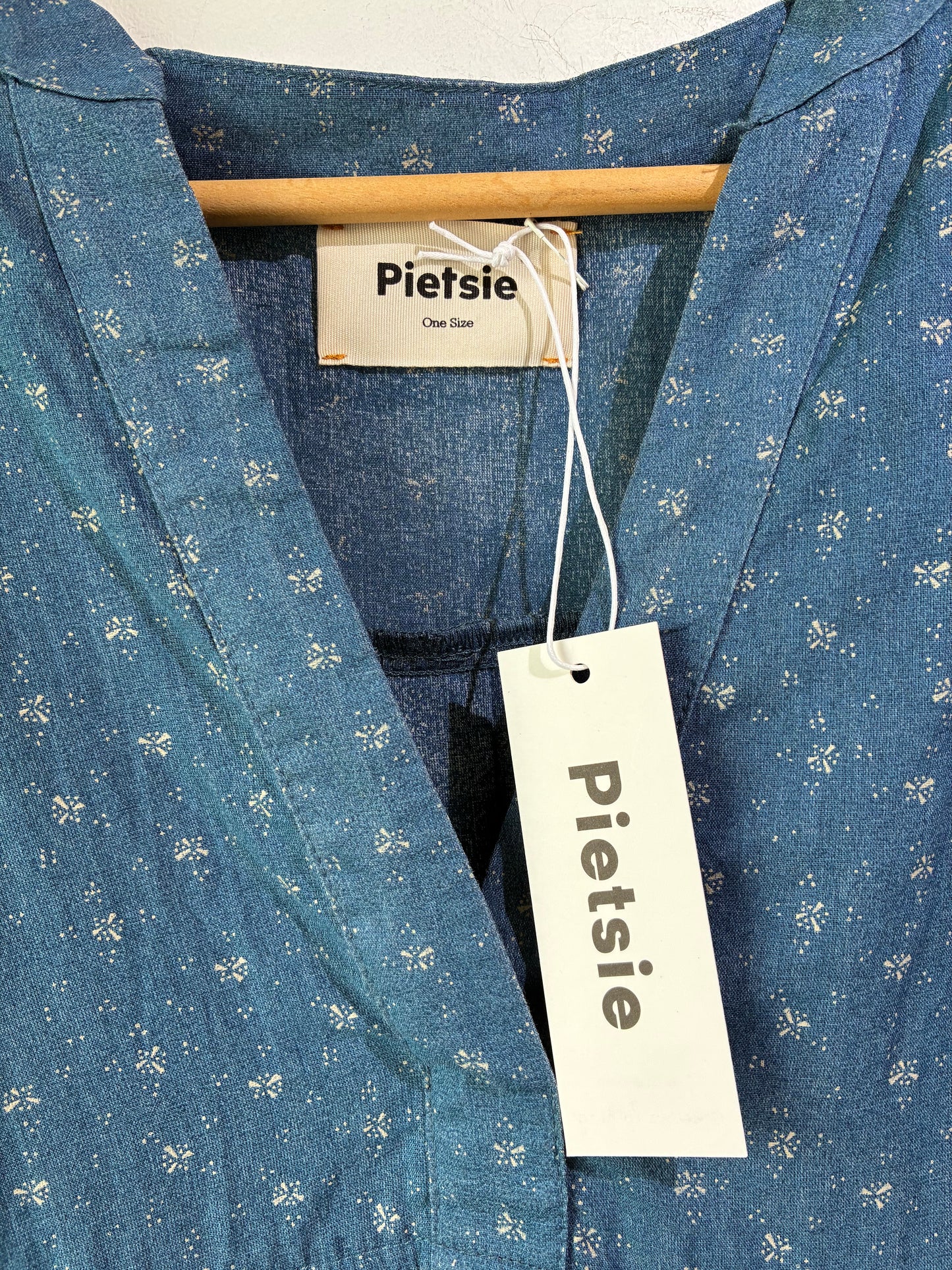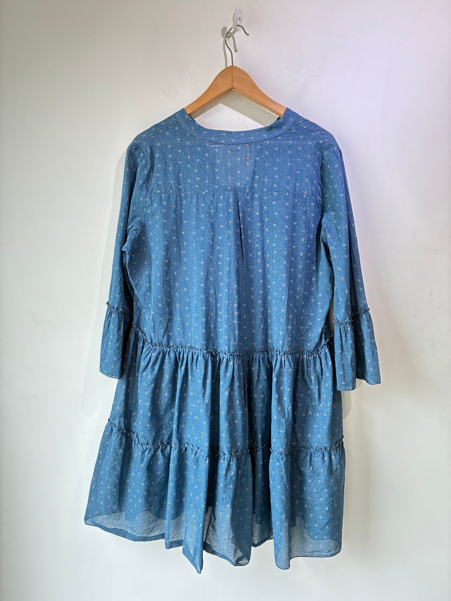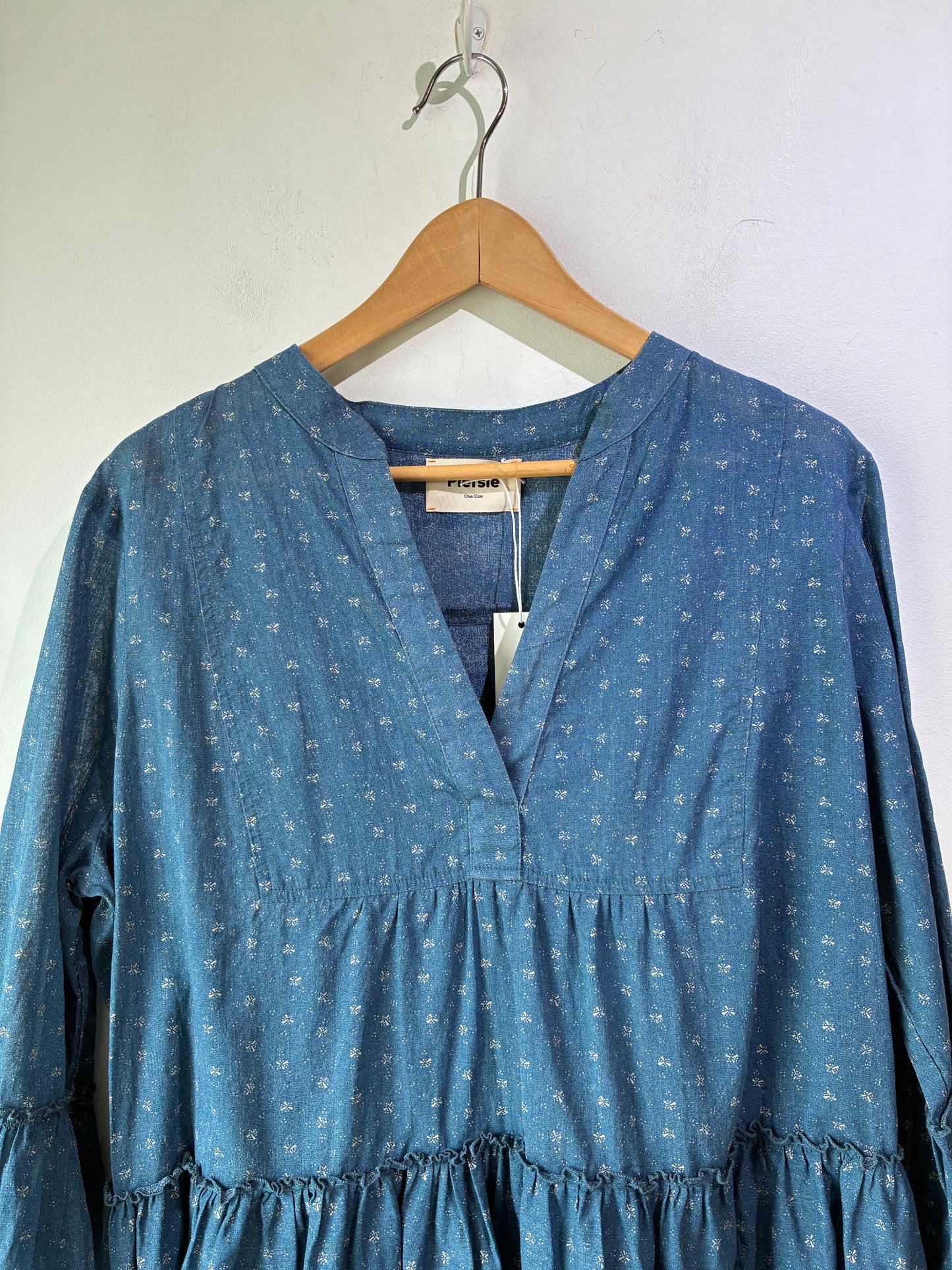 Pietsie Blue Calico Tiered Ruffle Dress. The sweetest little cotton dress that is ready to go anywhere! Featuring a yoked v-neck and short stand collar and tiered ruffle bell sleeve and skirt, this dress is an easy and versatile choice-super cute and casual with sneakers or dress it up with a sandal or heel. NWT, garment is in brand-new condition and free of stains, tears and defects.