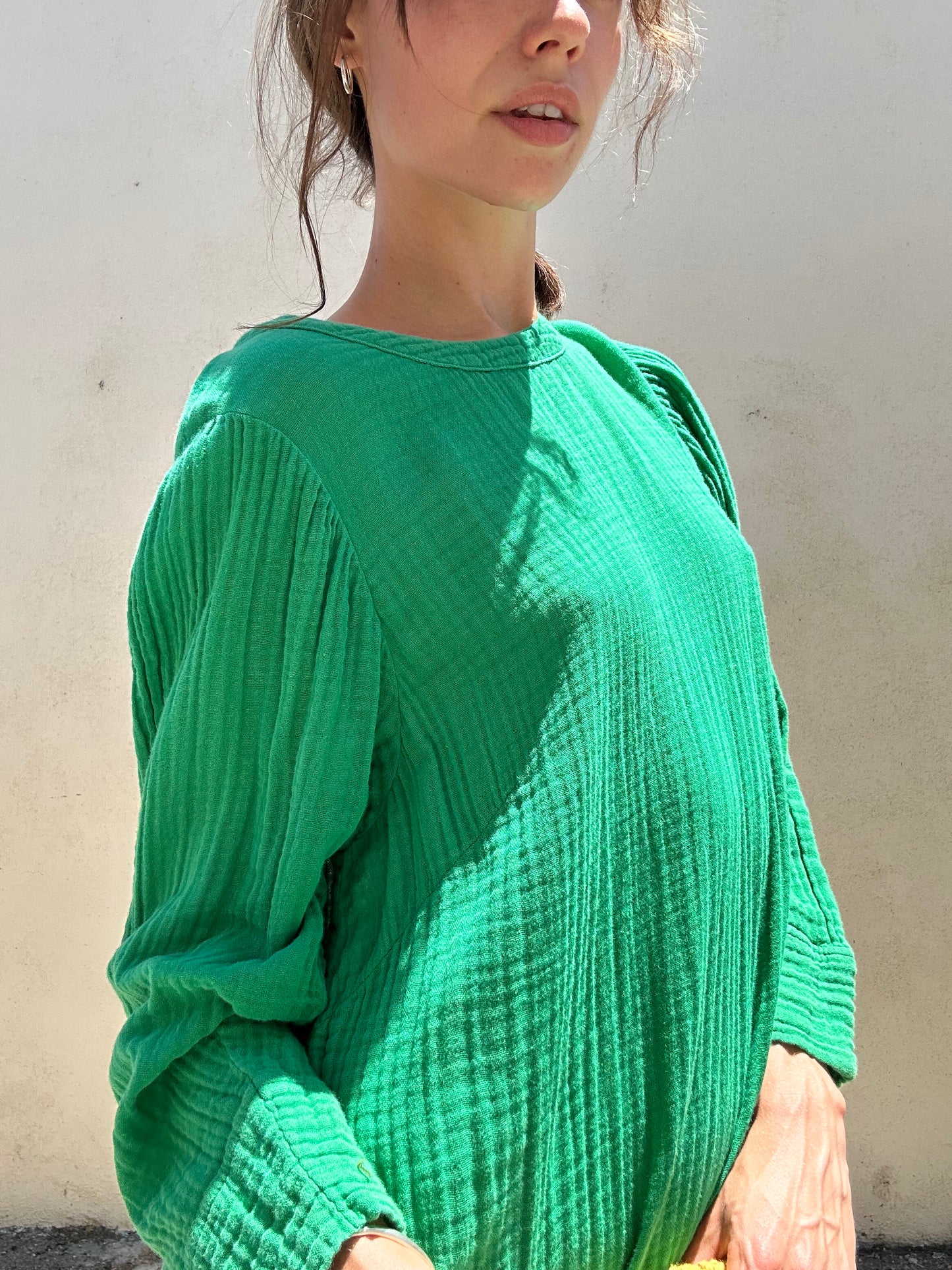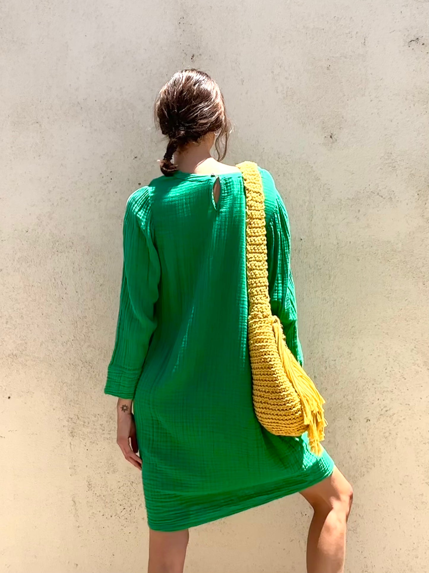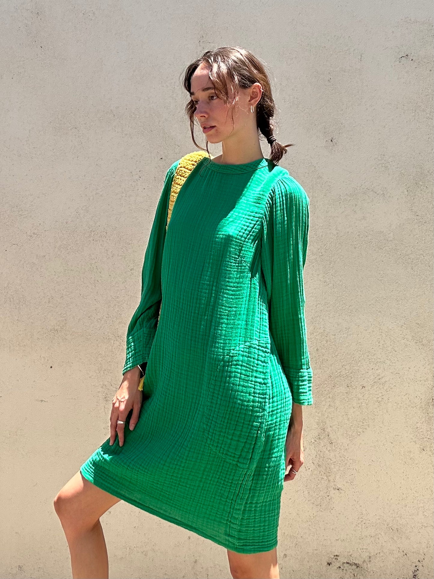 The kind of easy and flattering dress you'll be able to throw on, no matter the season. Minimalist yet unique with the vibrant green hue, the Raquel Allegra Hyperion Dress In Jade is made from cotton with a comfy waffle texture. It also has pockets for functionality and a button closure.