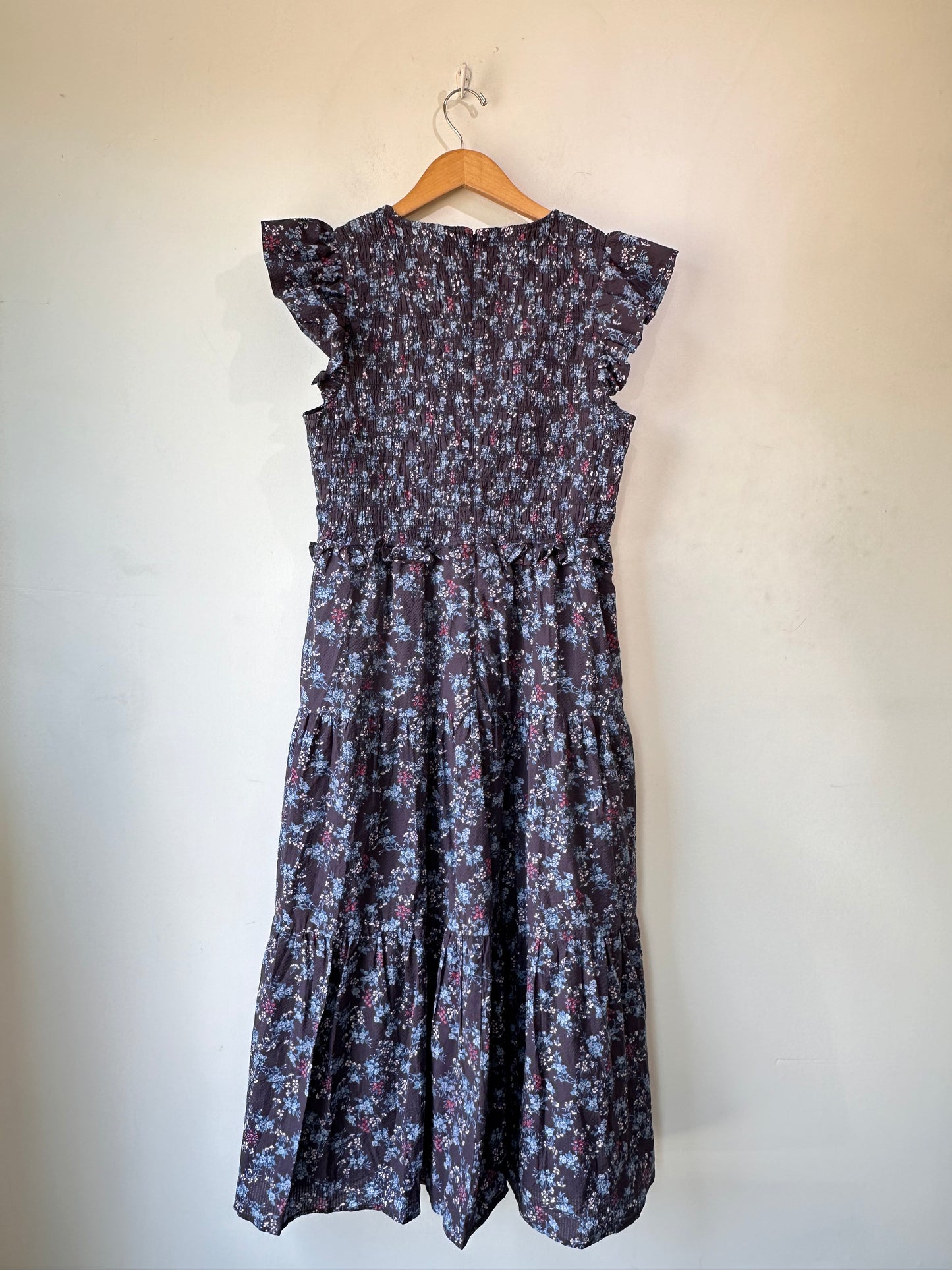 Sea New York Flutter Sleeve Dress. With a smocked v-neck top, this dress has a very flattering cut. Cute blue floral print perfect for summer and winter! Fits a size L/XL best.