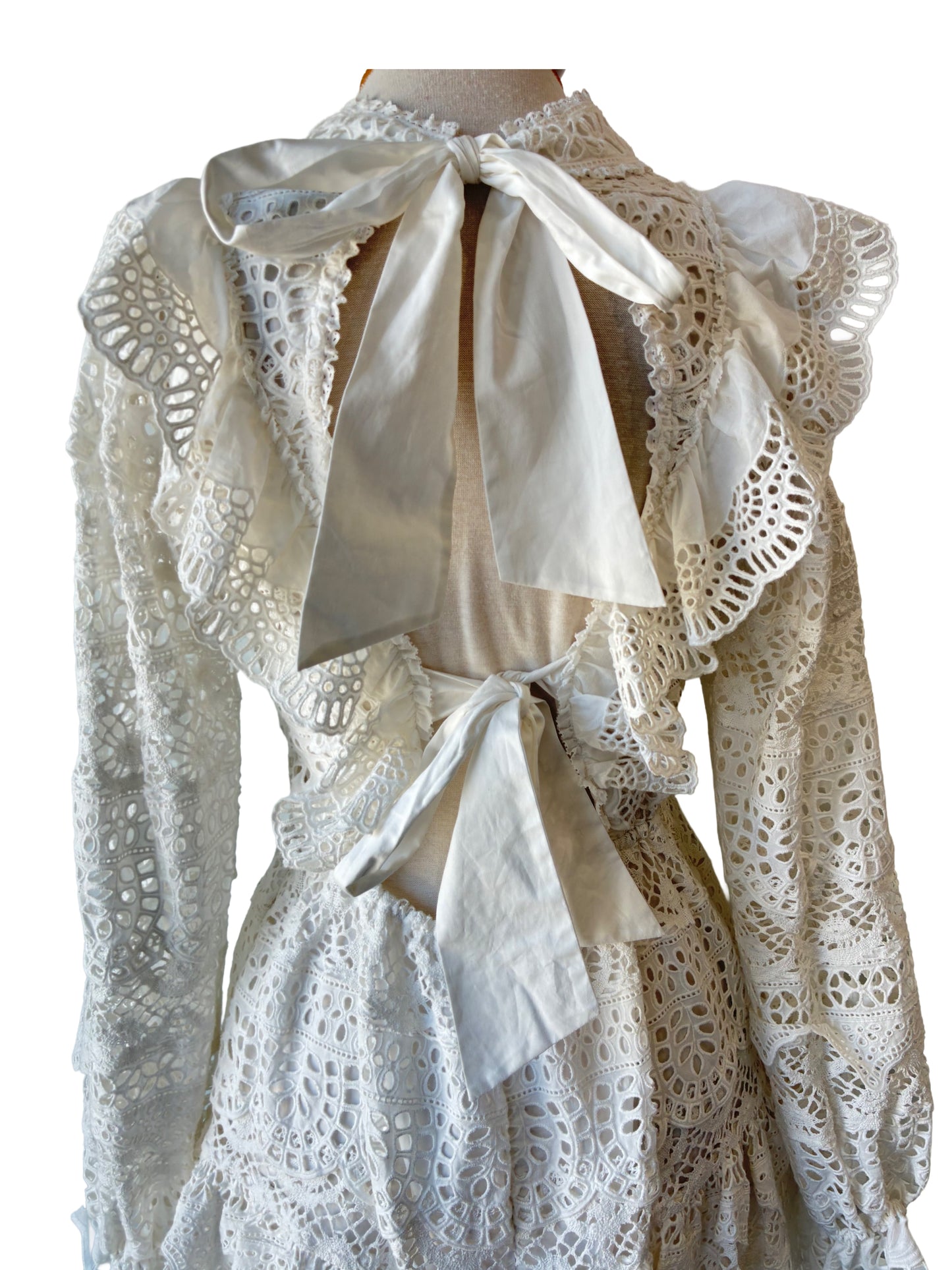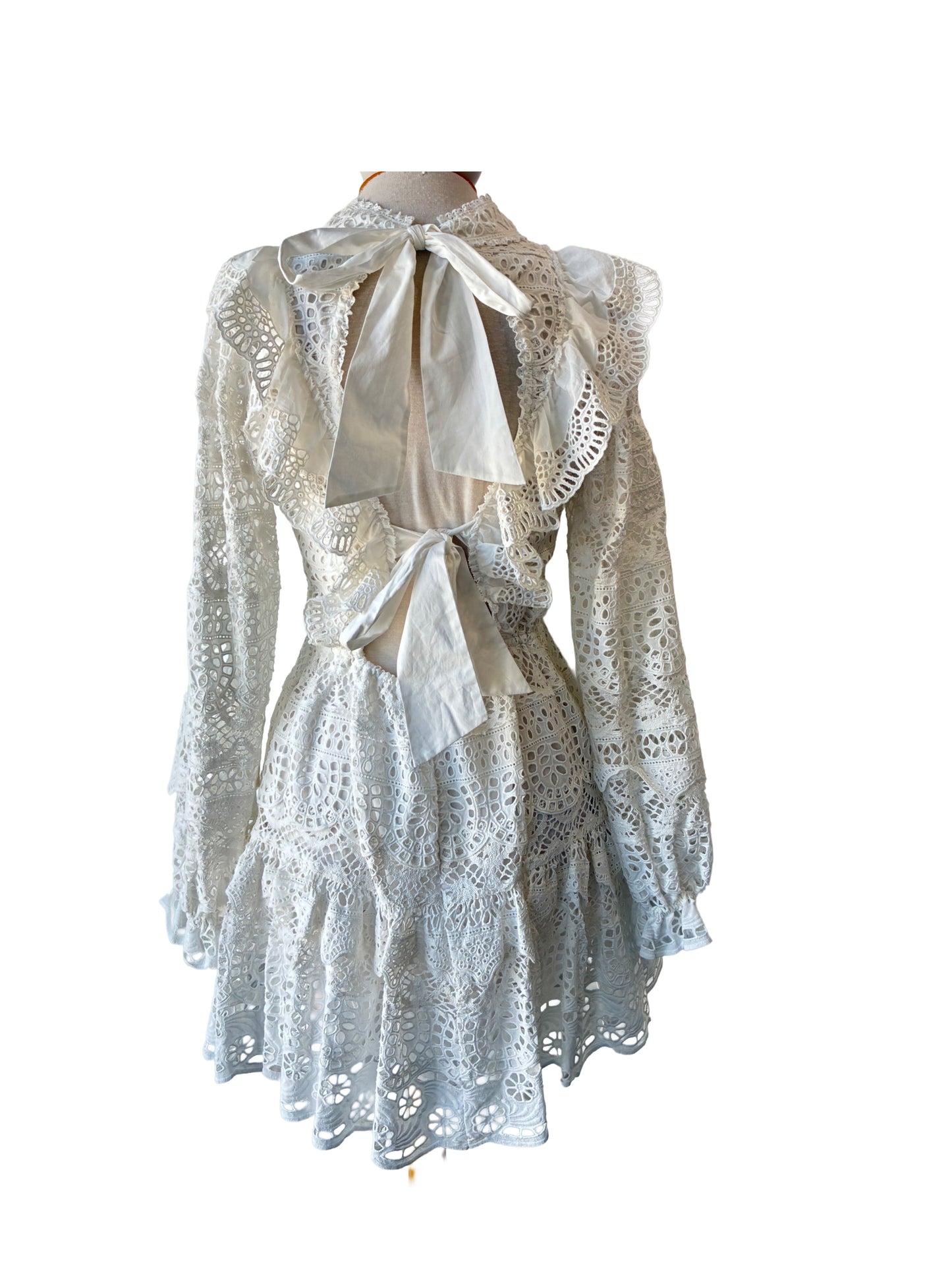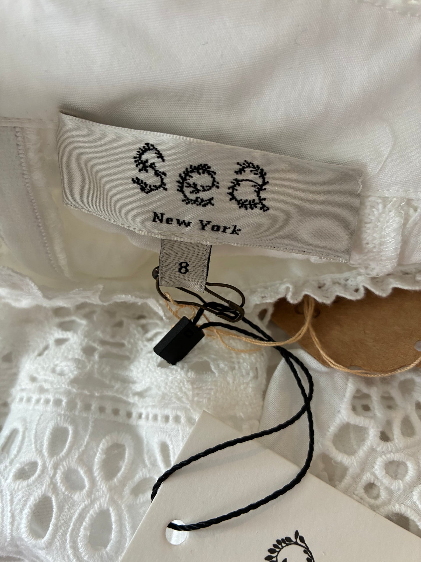 Sea New York White Eyelet Open Back Mini. Imagine a Victorian ingenue who discovered SPF and a social calendar. All ruffles and eyelet up front, but then bam, an open back with double ties that’s basically a wink you can wear. The flouncy skirt does the twirling, you do the trouble-making. It’s prim meets playful, with just enough scandal to keep things interesting. NWT.