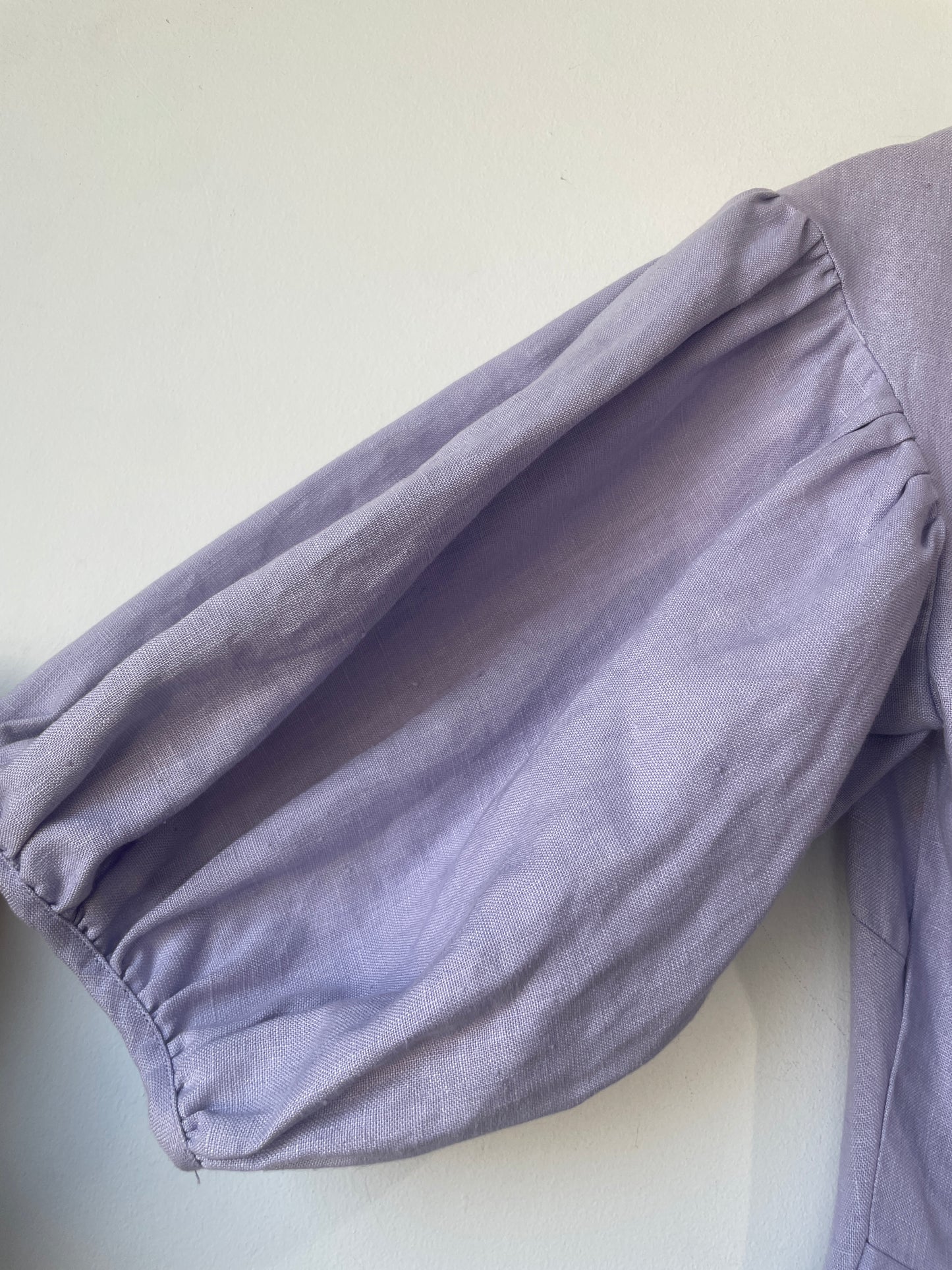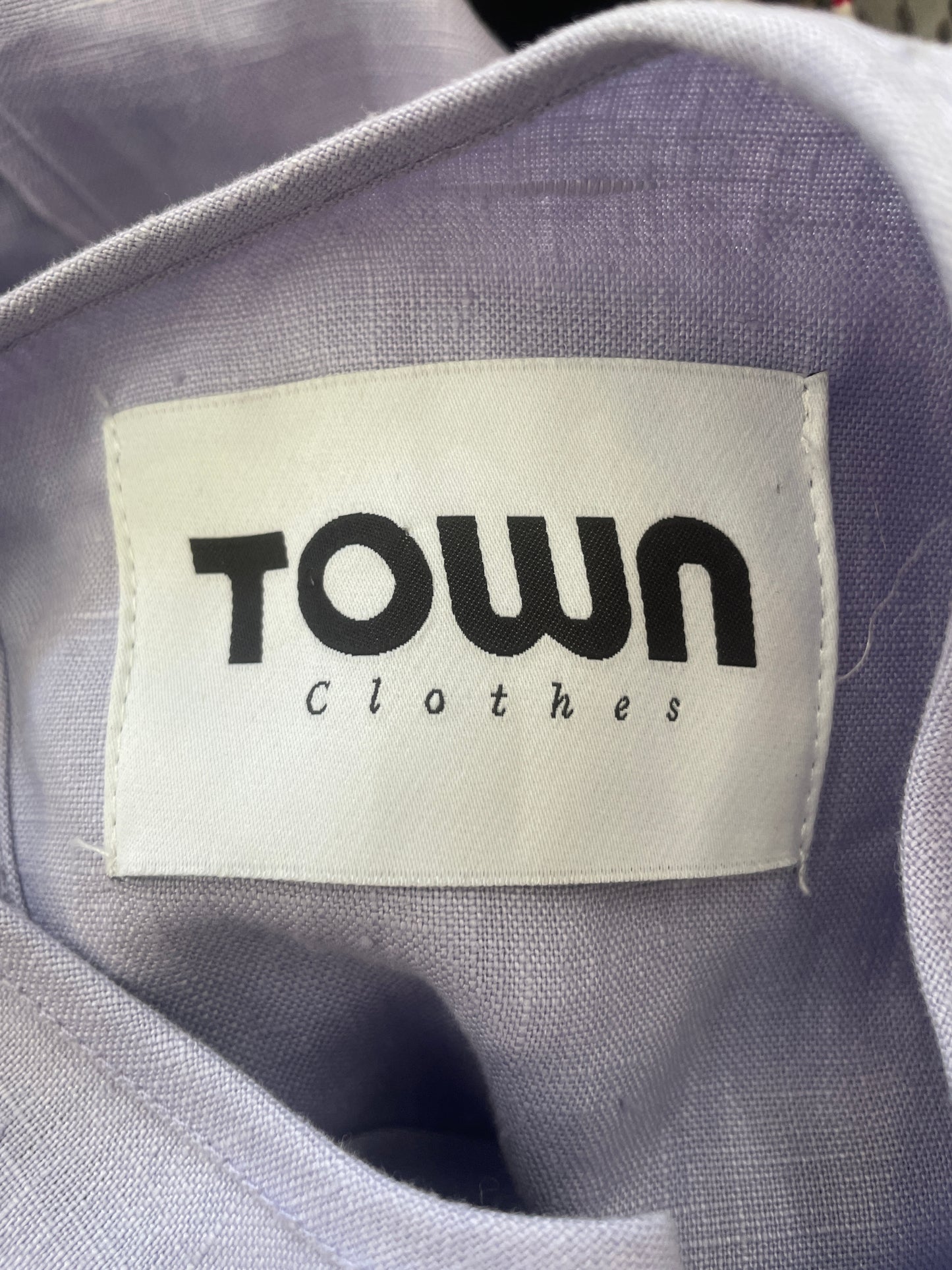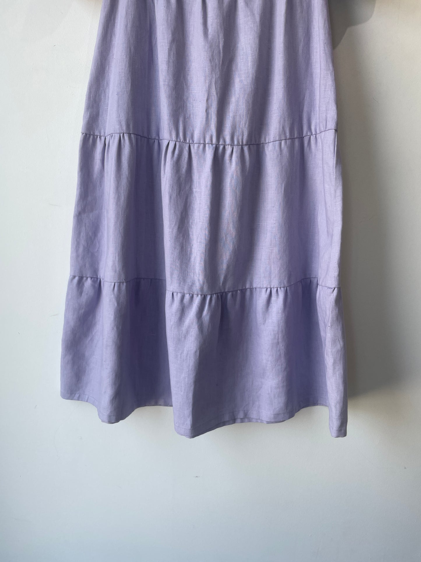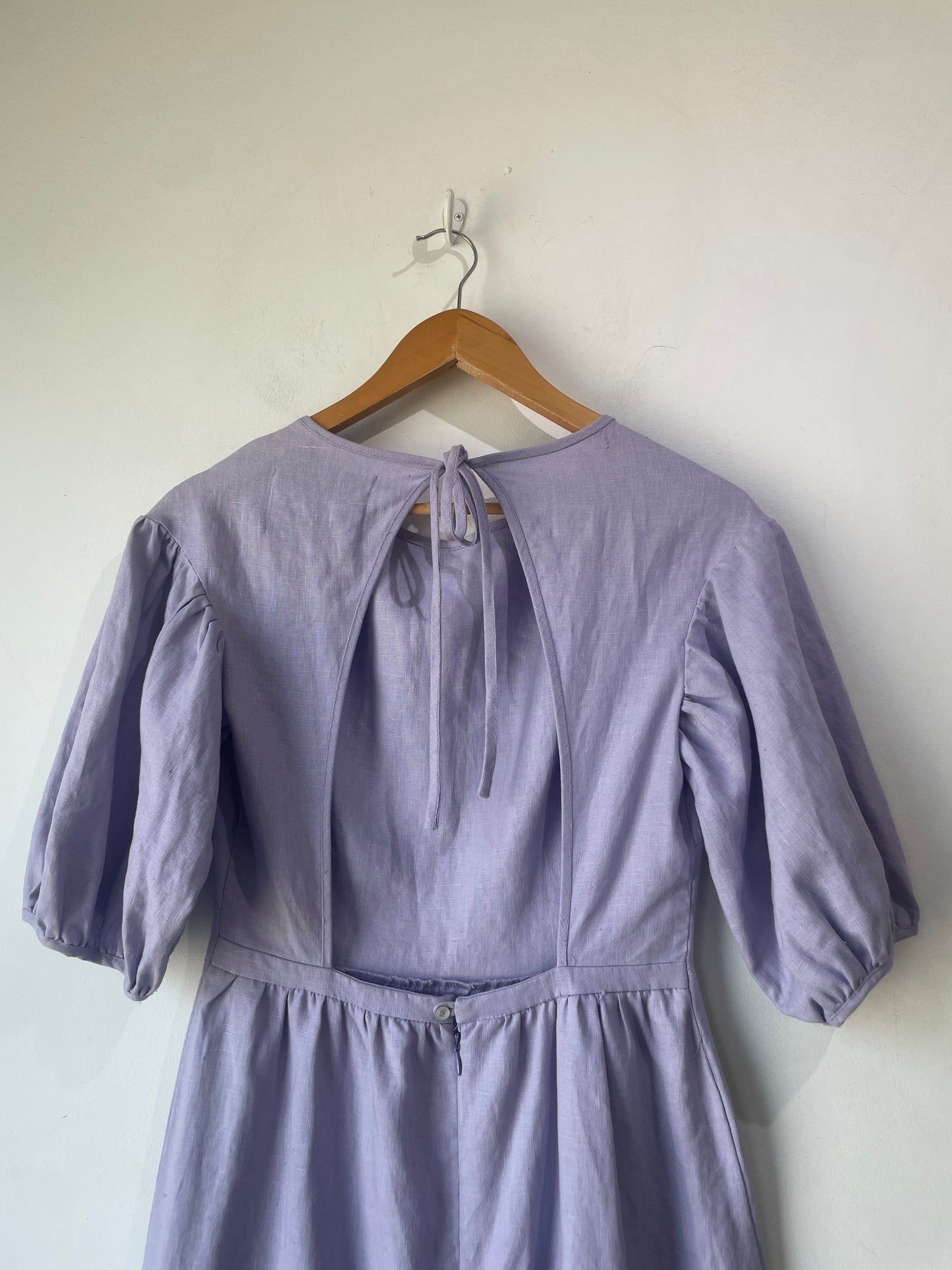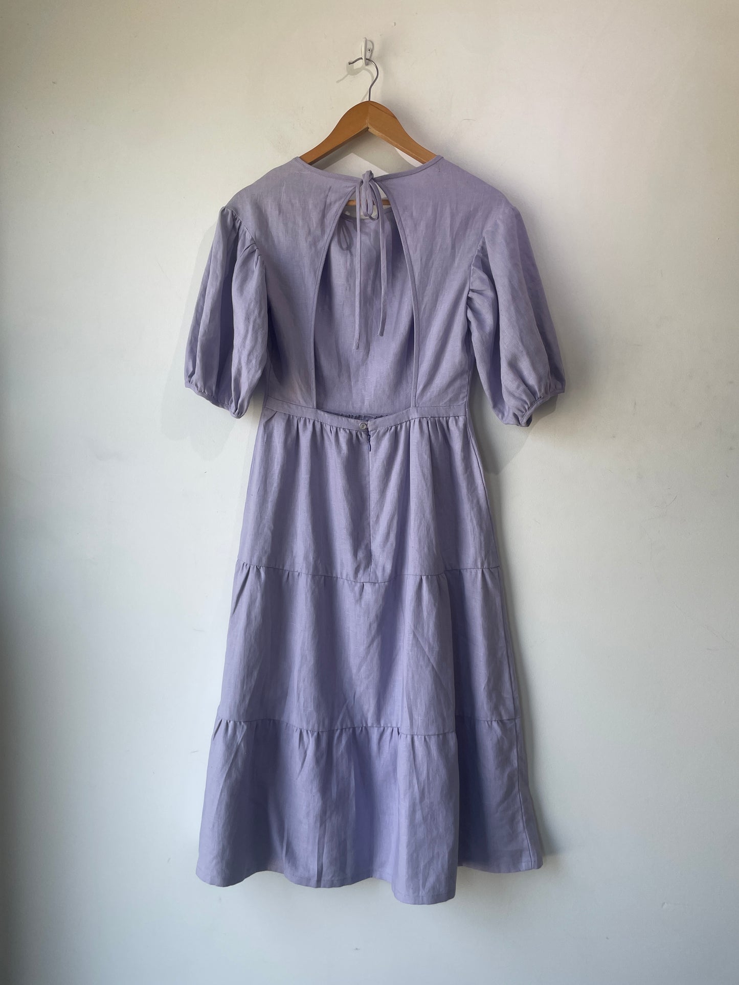 Town Clothes Lavender Backless Linen Dress. Beautiful and just the right amount of demure, this crisp linen dress features a flattering round neckline, slightly puffed sleeves, and a tiered skirt. Where it gets interesting is in the low, cutout back giving this sweet dress a little edge. Dress is in excellent condition and is free of stains, tears and defects.