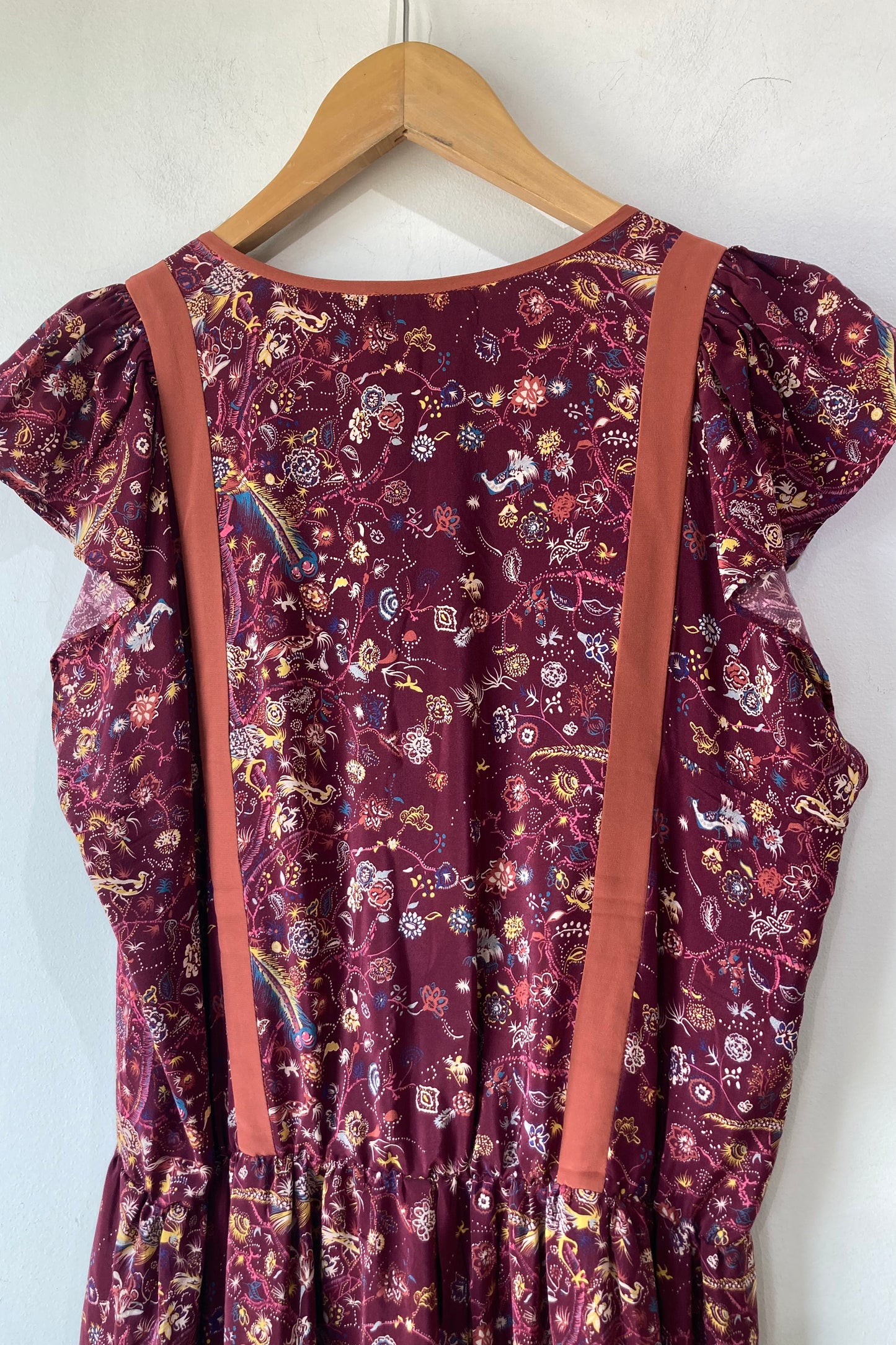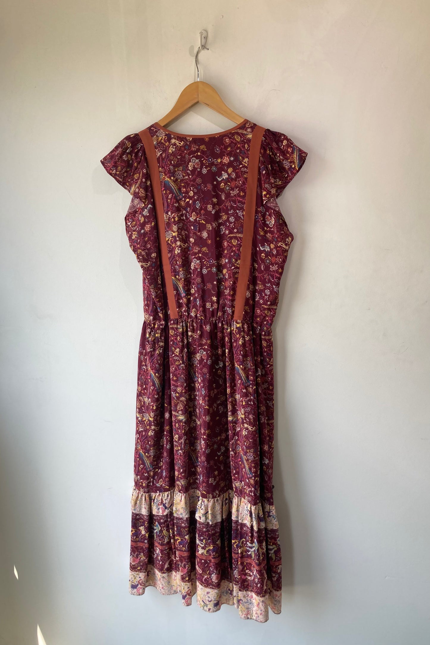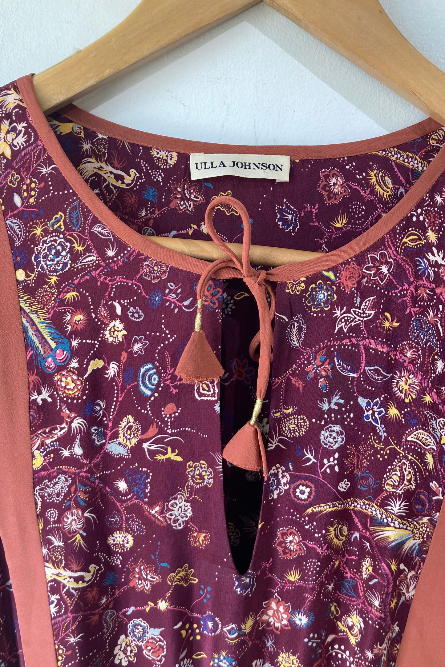 Ulla Johnson Maroon Floral Midi Dress in excellent condition. Size 10, fits M best. Ruffle drop waist detail. Eyelet tie closure at chest. Gorgeous rich print with peacocks and flowers. Has stretch available in waist. Made in China. 100% silk shell, with 100% viscose lining. Dry clean only.