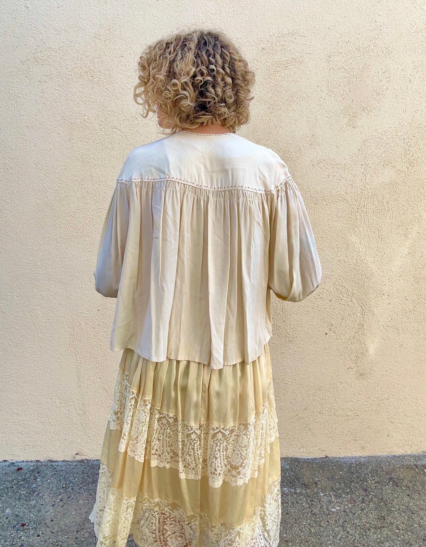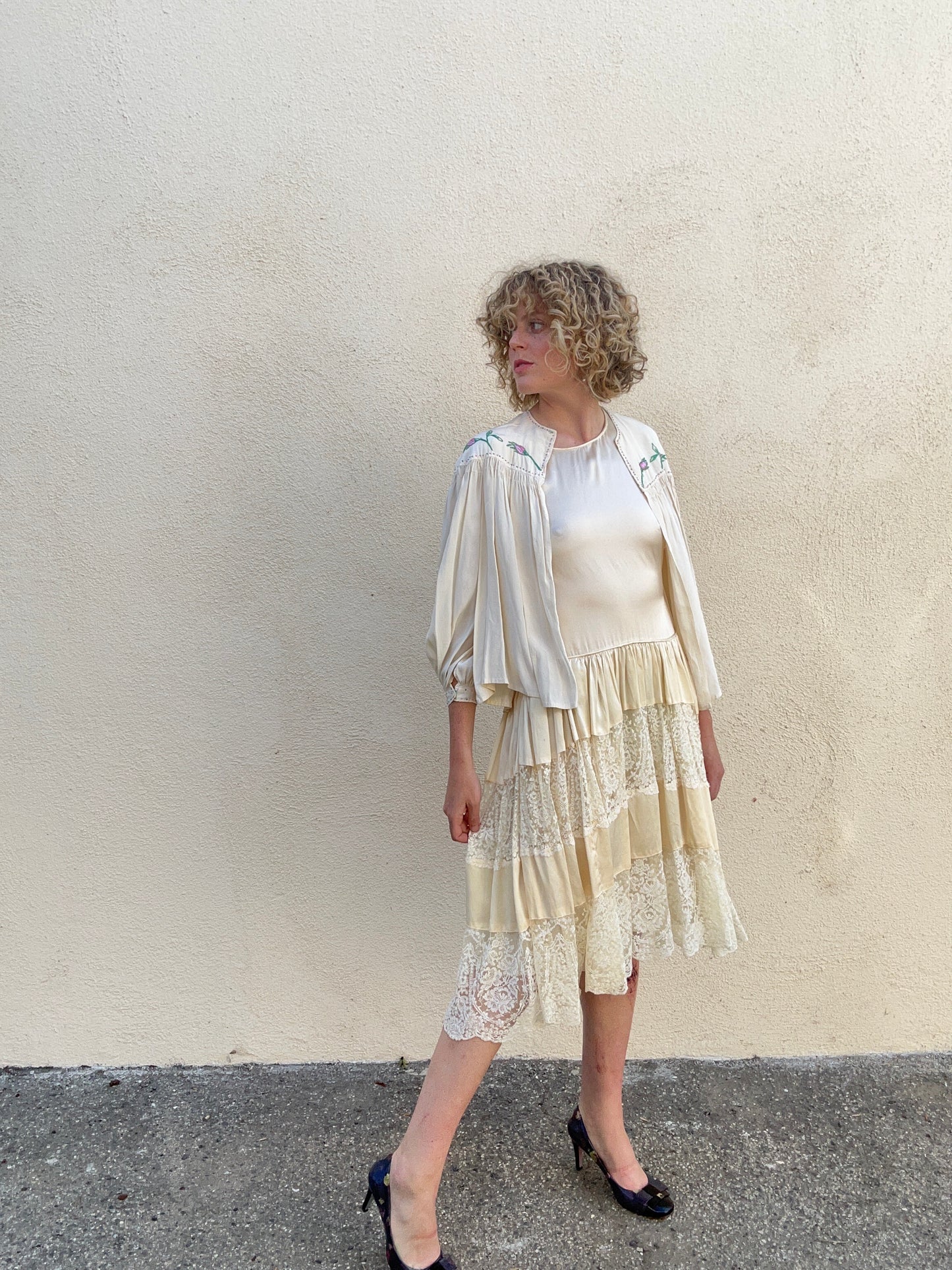 Victorian Cream Lace Dress. A gorgeous dress sourced from the New York Historical Society with a tiered lace skirt. Snap closure going up the side of the bodice. In great condition, especially for an antique garment. Sold as is. Unmarked size, best fits a Small.