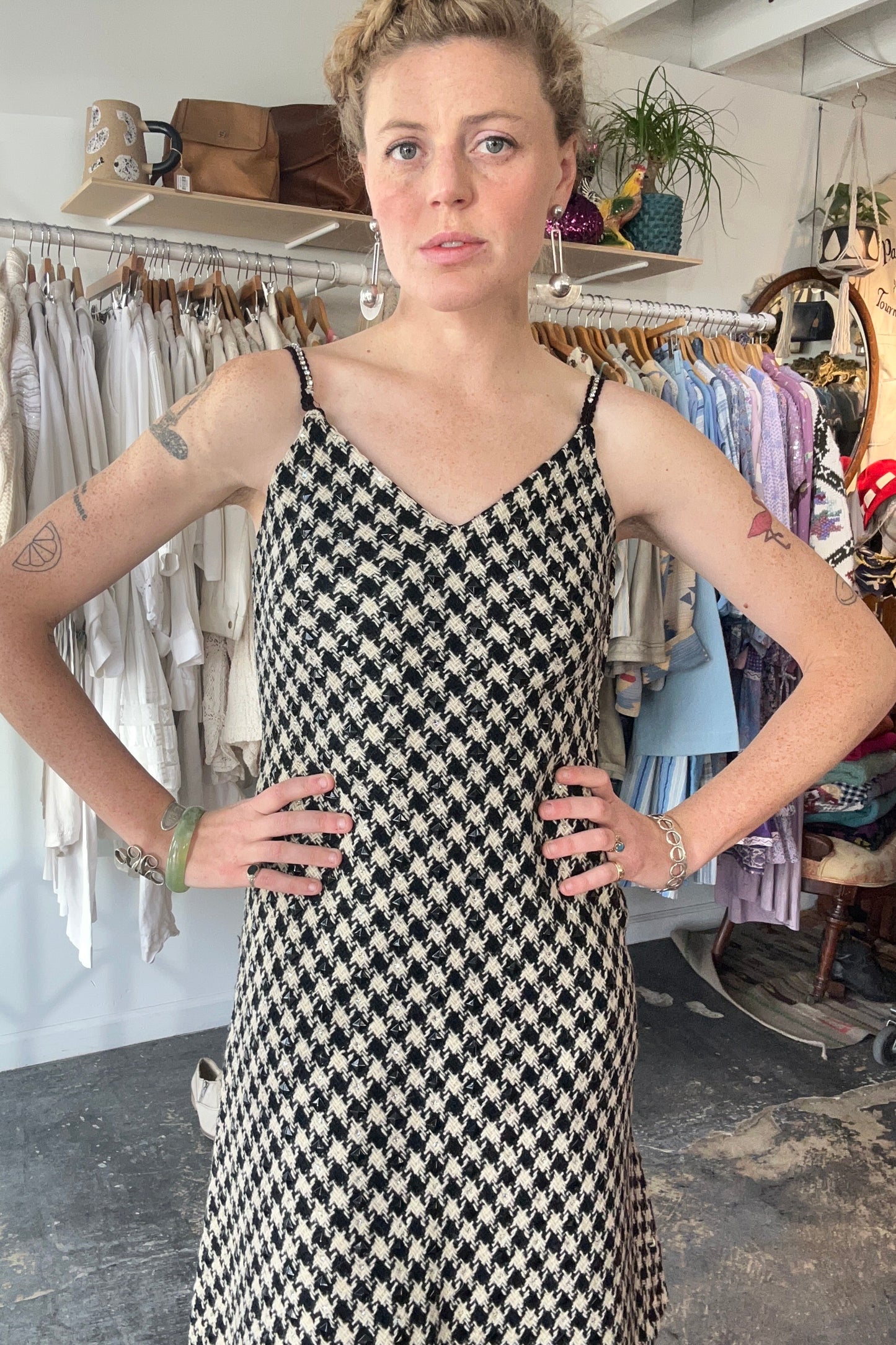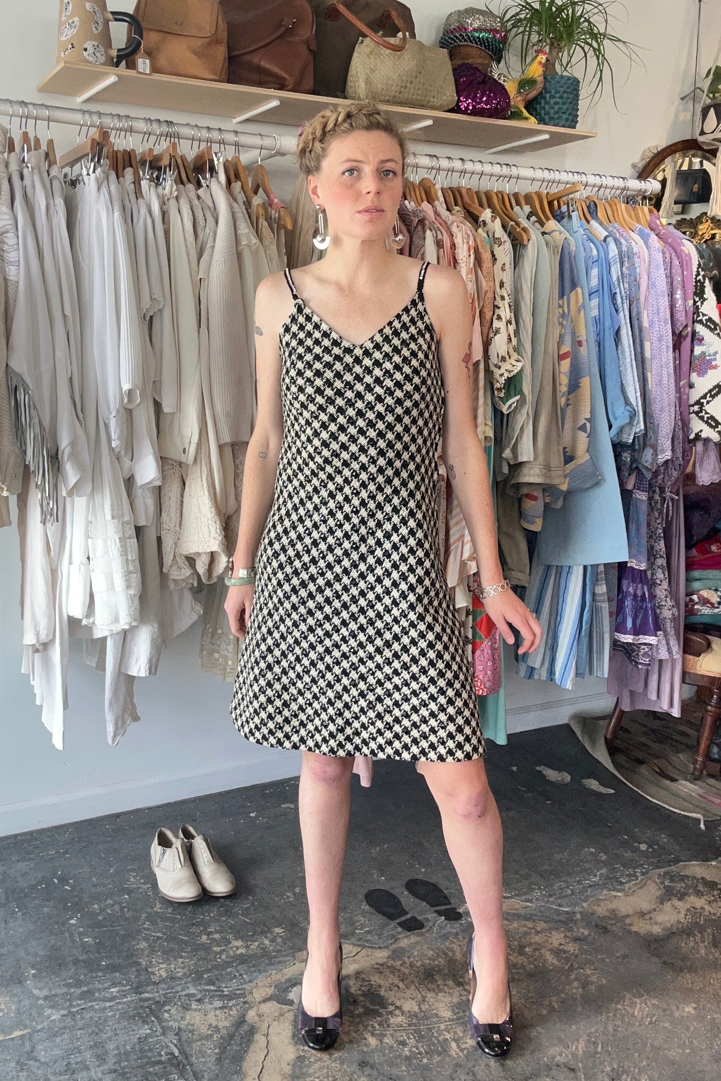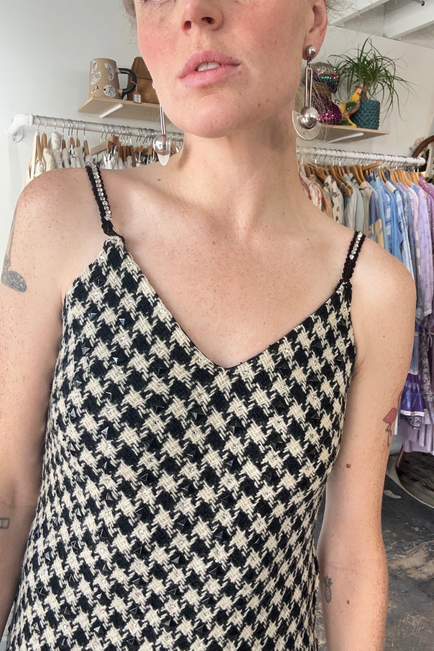 Vintage I. Magnin Woven Houndstooth Beaded Dress. A classic A-line dress with black and white houndstooth pattern throughout, subtly adorned with black square beads and rhinestones. Spaghetti traps are lined in rhinestones as well for added bling. Fun and easy to wear! In decent vintage condition, slight signs of wear including some missing rhinestones on the straps but nothing major. Lined in a thin black interior slip. Zipper closure going up the side. Unmarked materials, feels like wool. Unmarked size, best fits size small through medium.