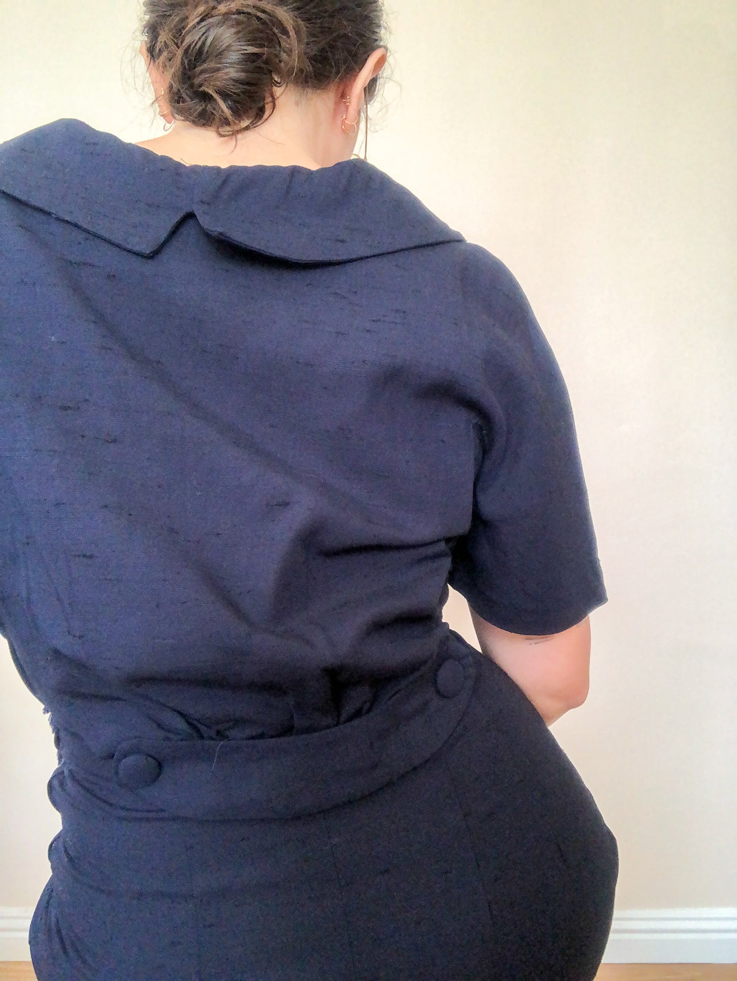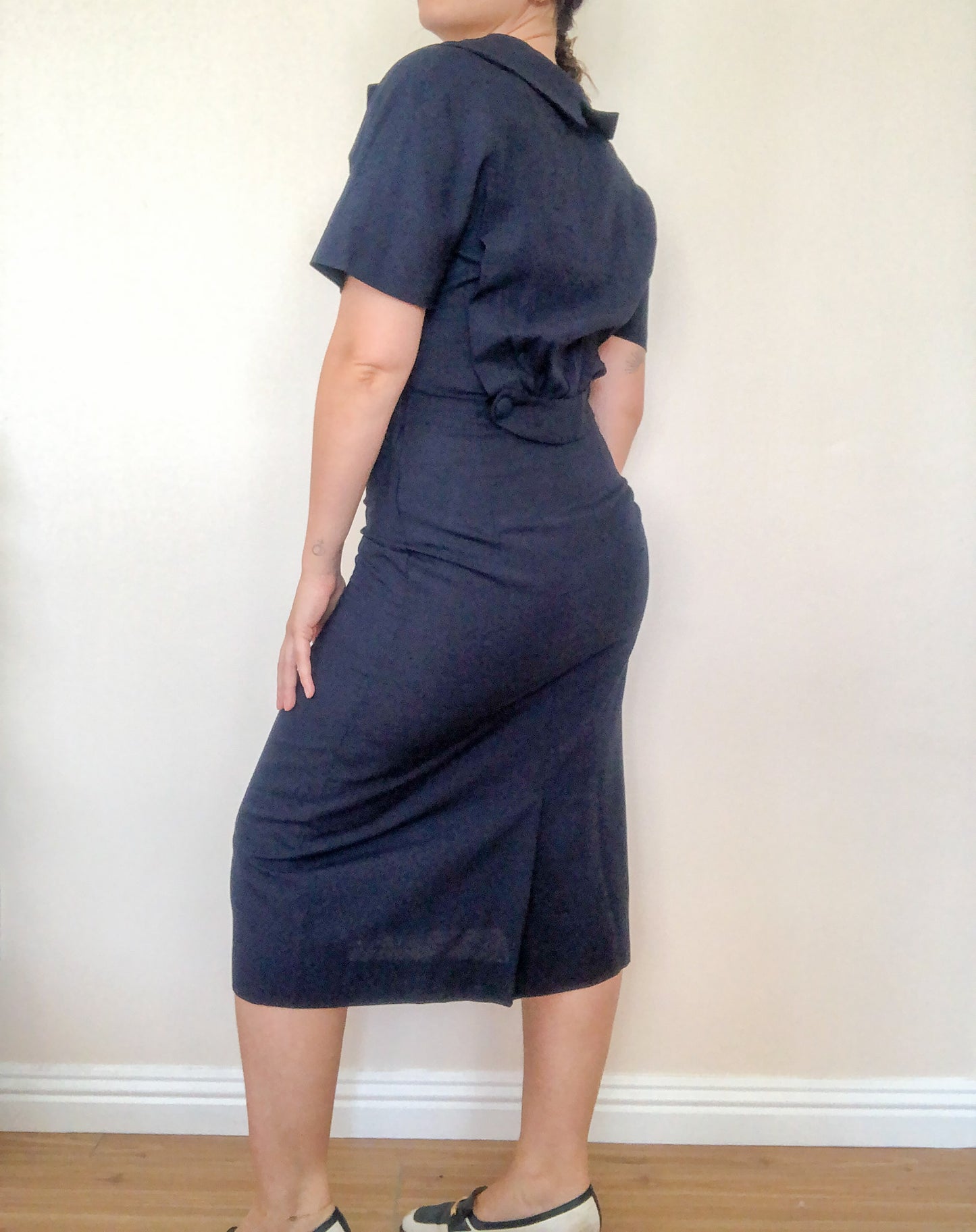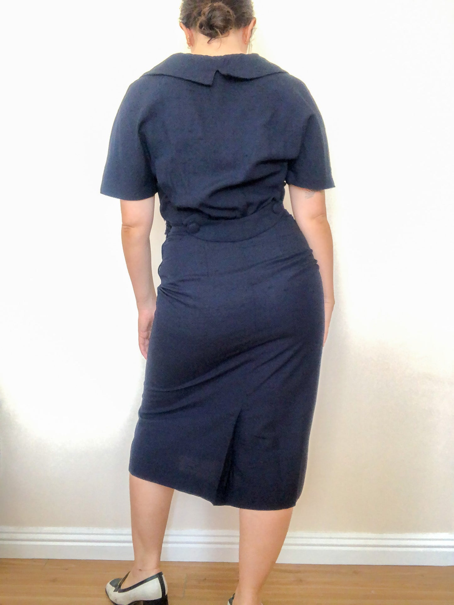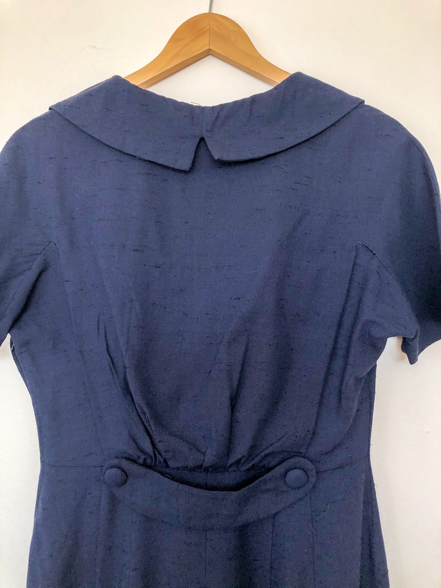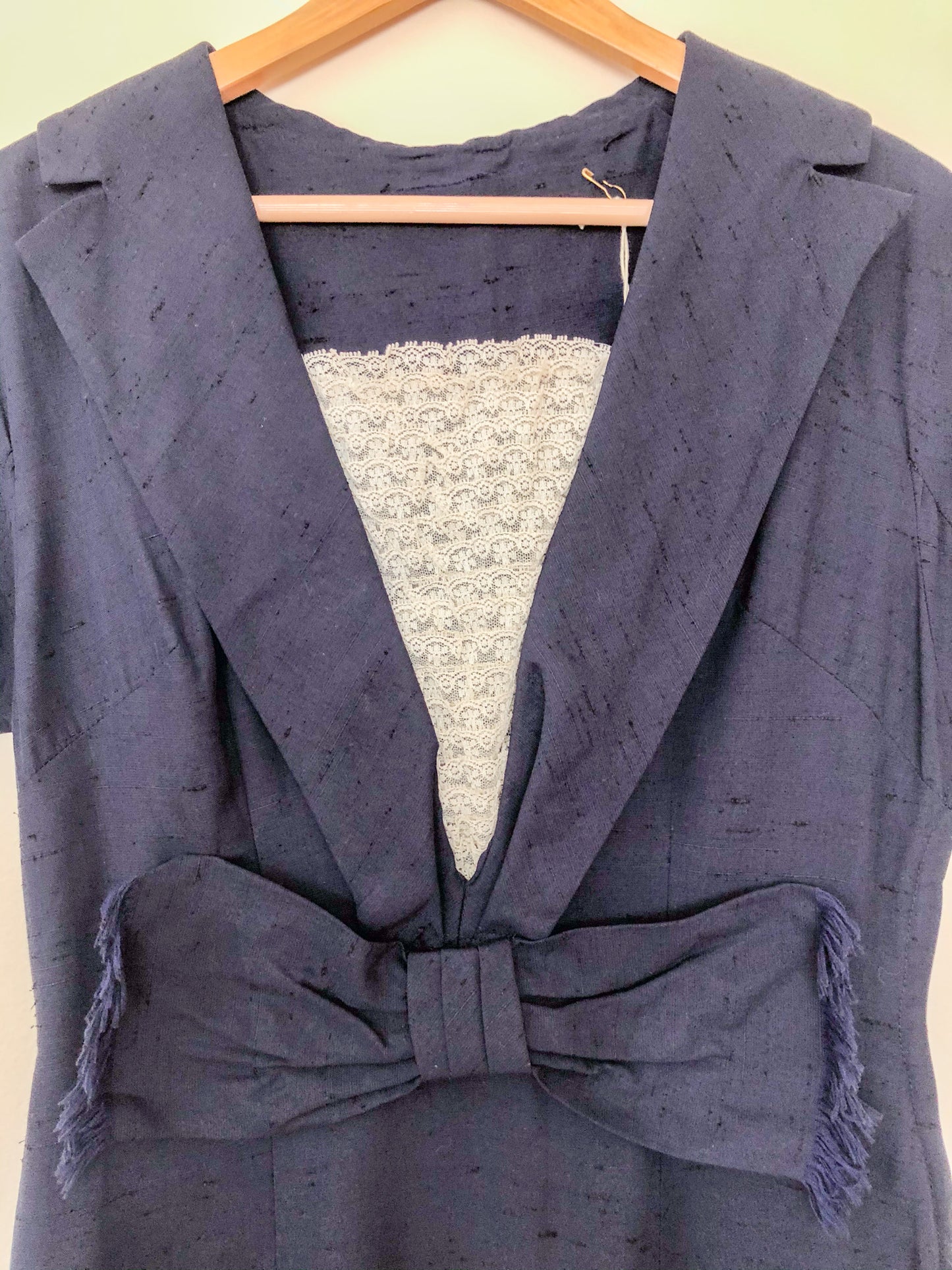 1940s Vintage Navy Collared Bow Dress with Lace Bib