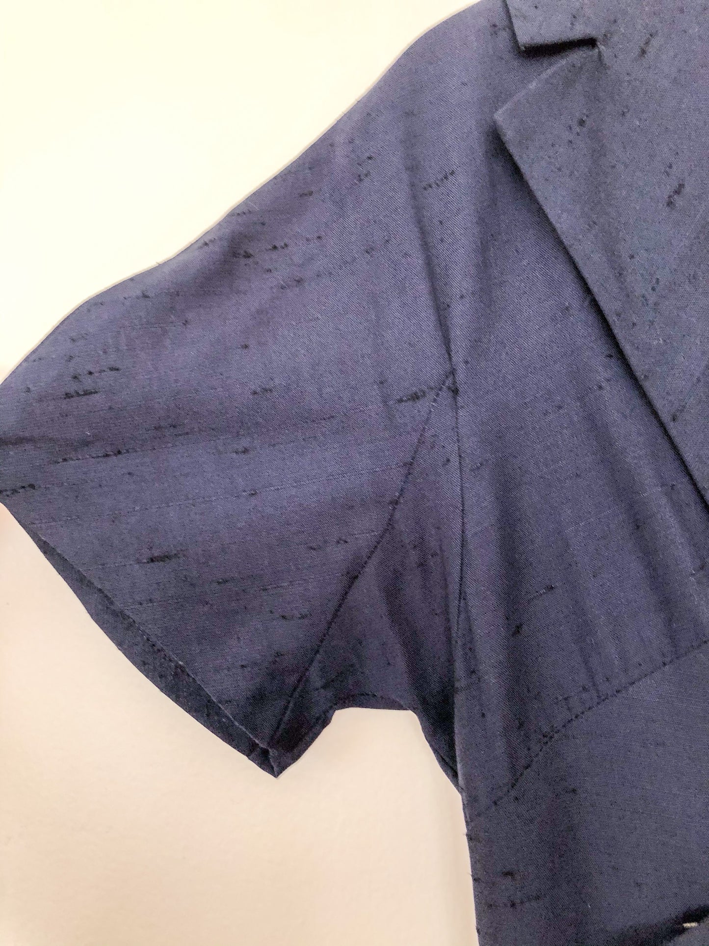 Vintage 1940s Navy Collared Bow Dress with Lace Bib. Short sleeve fitted skirt dress in textured rayon fabric. Has side zipper closure. Fits M-L best.