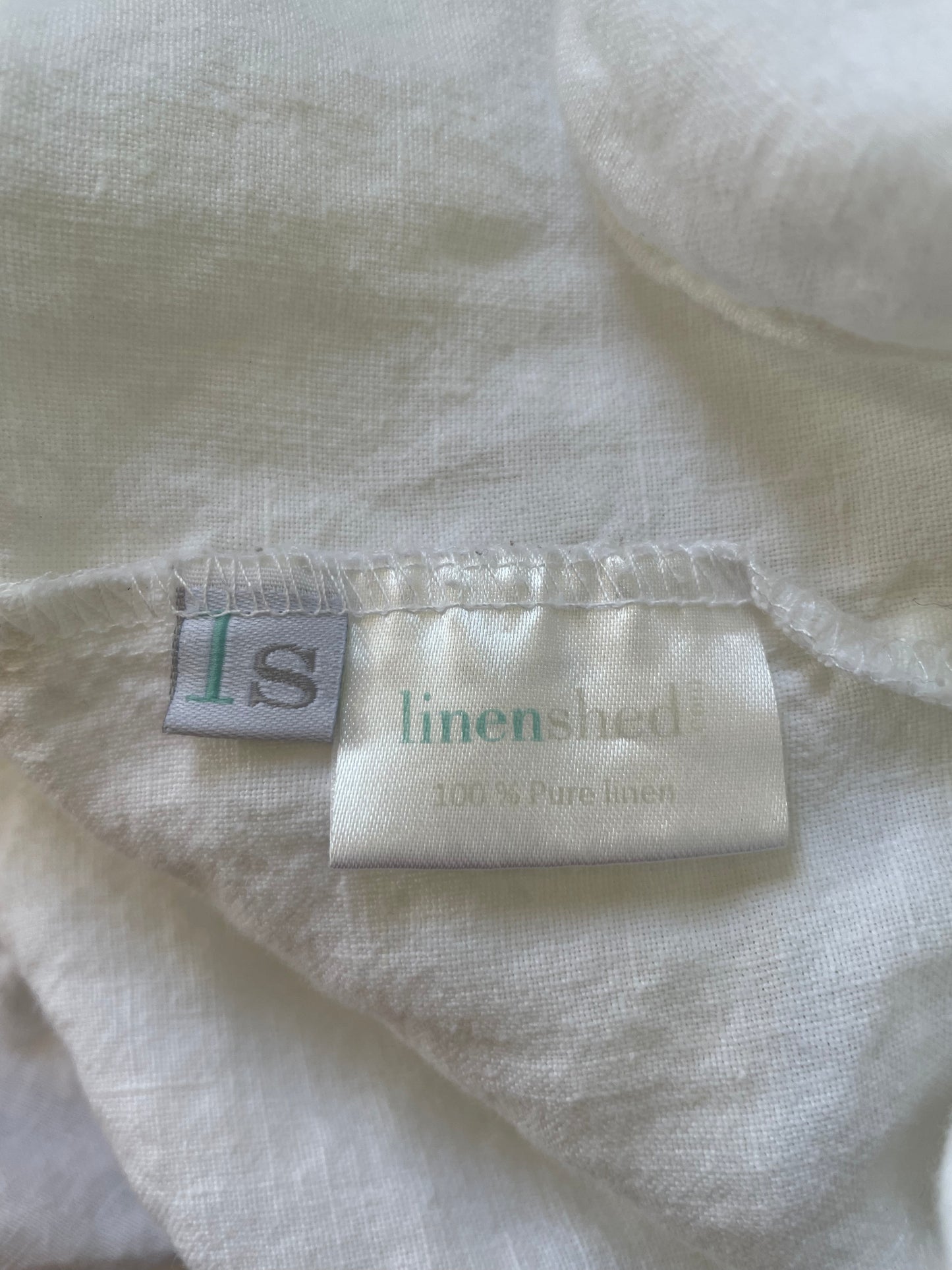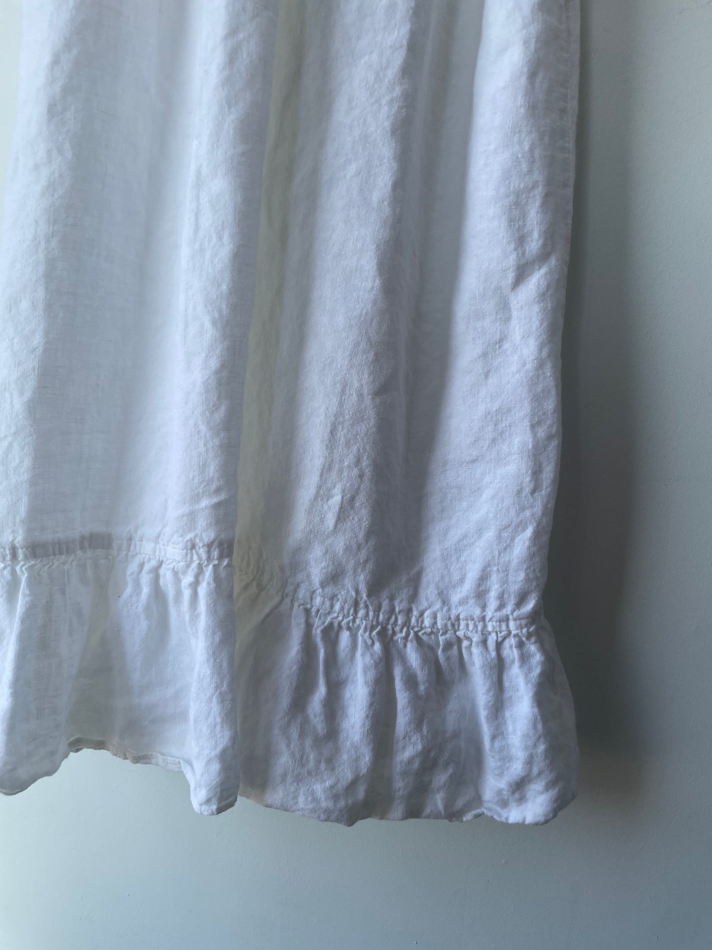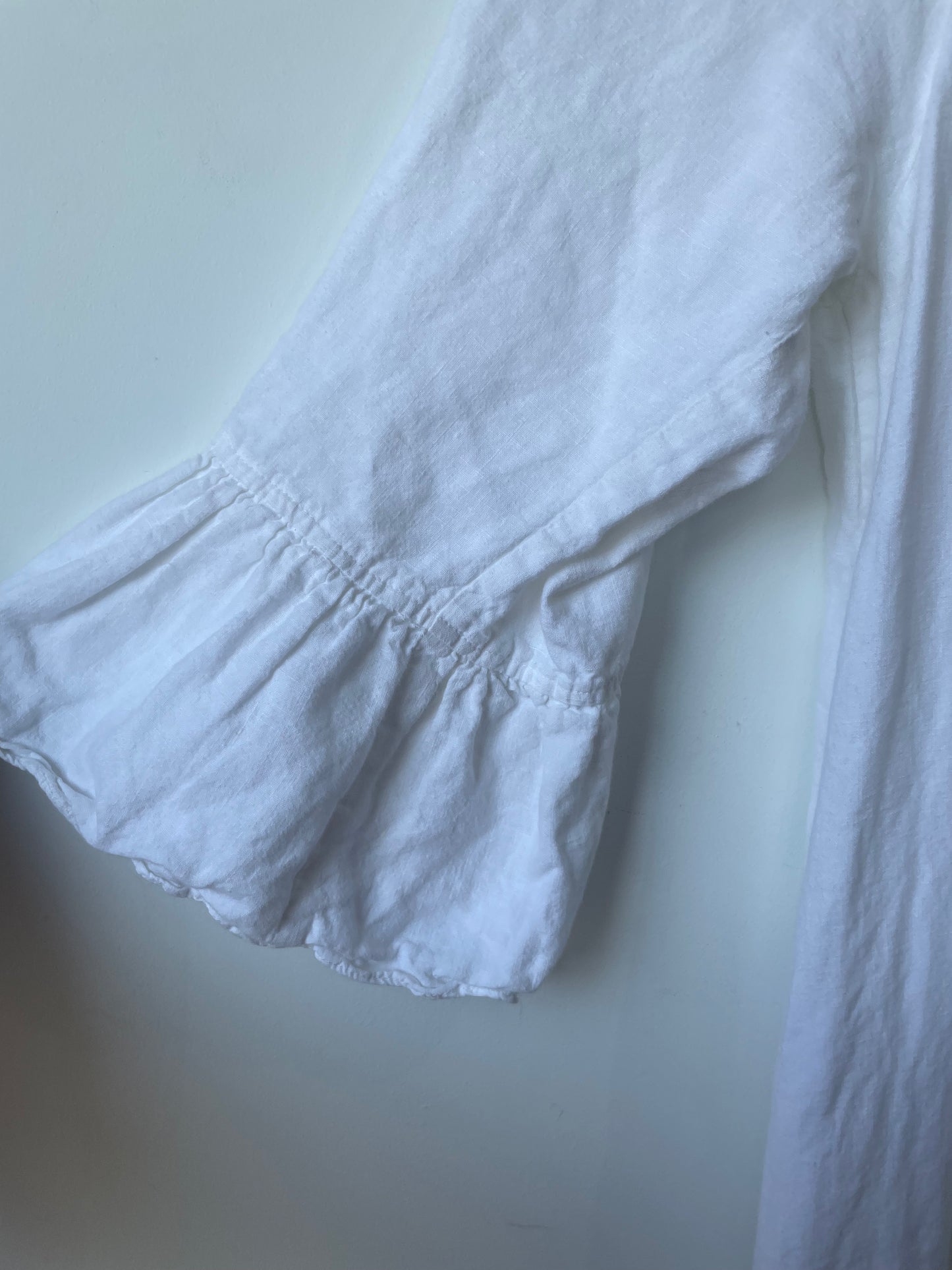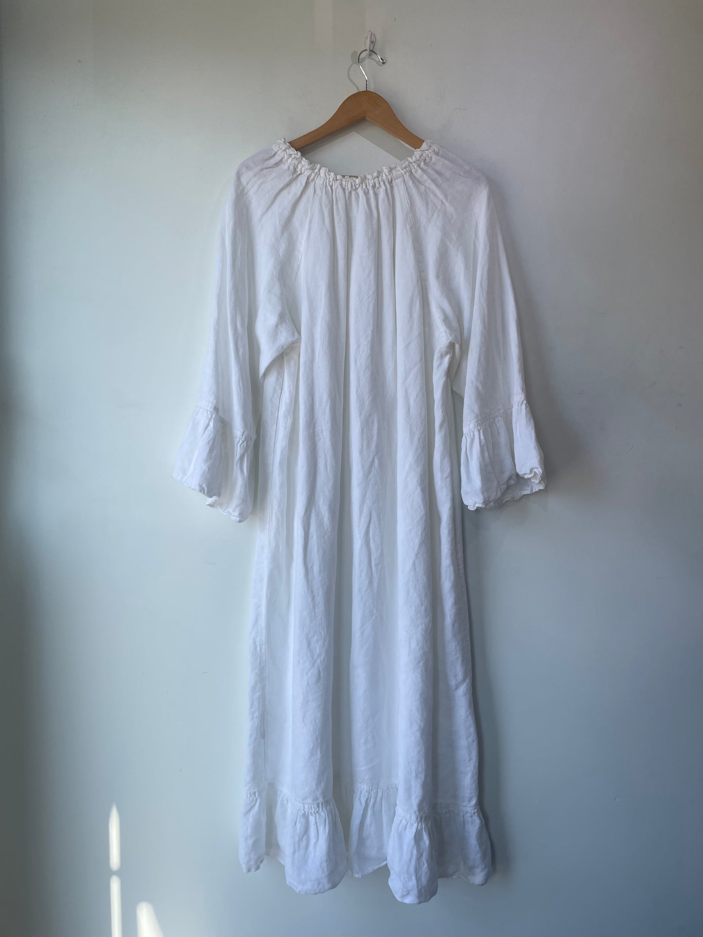 White Linen Ruffled Maxi Dress. A beautiful white linen dress with lovely ruffle details around hem, sleeves, and neckline. 100% linen. In very good condition. Tagged size S but runs large, please refer to measurements.