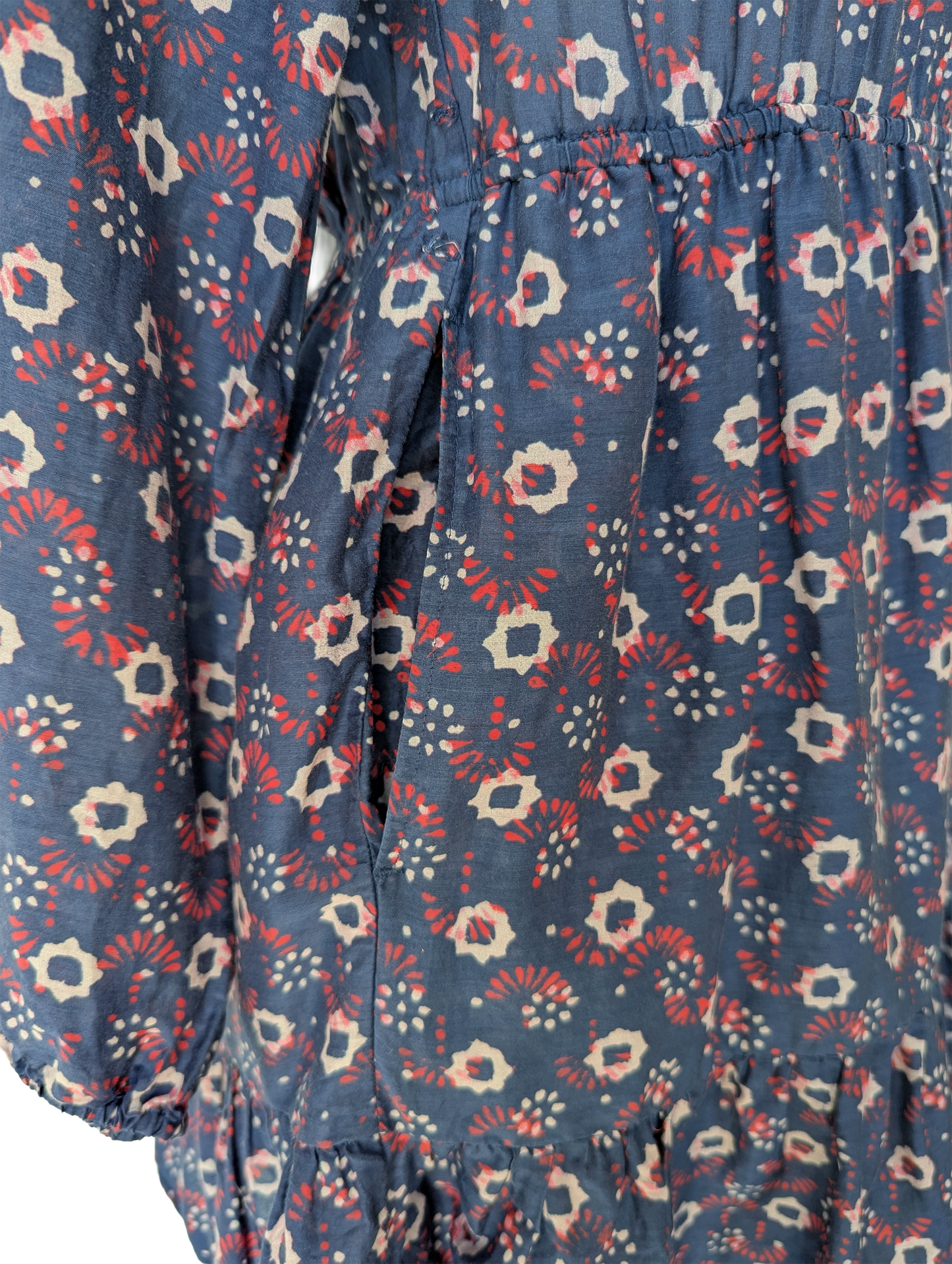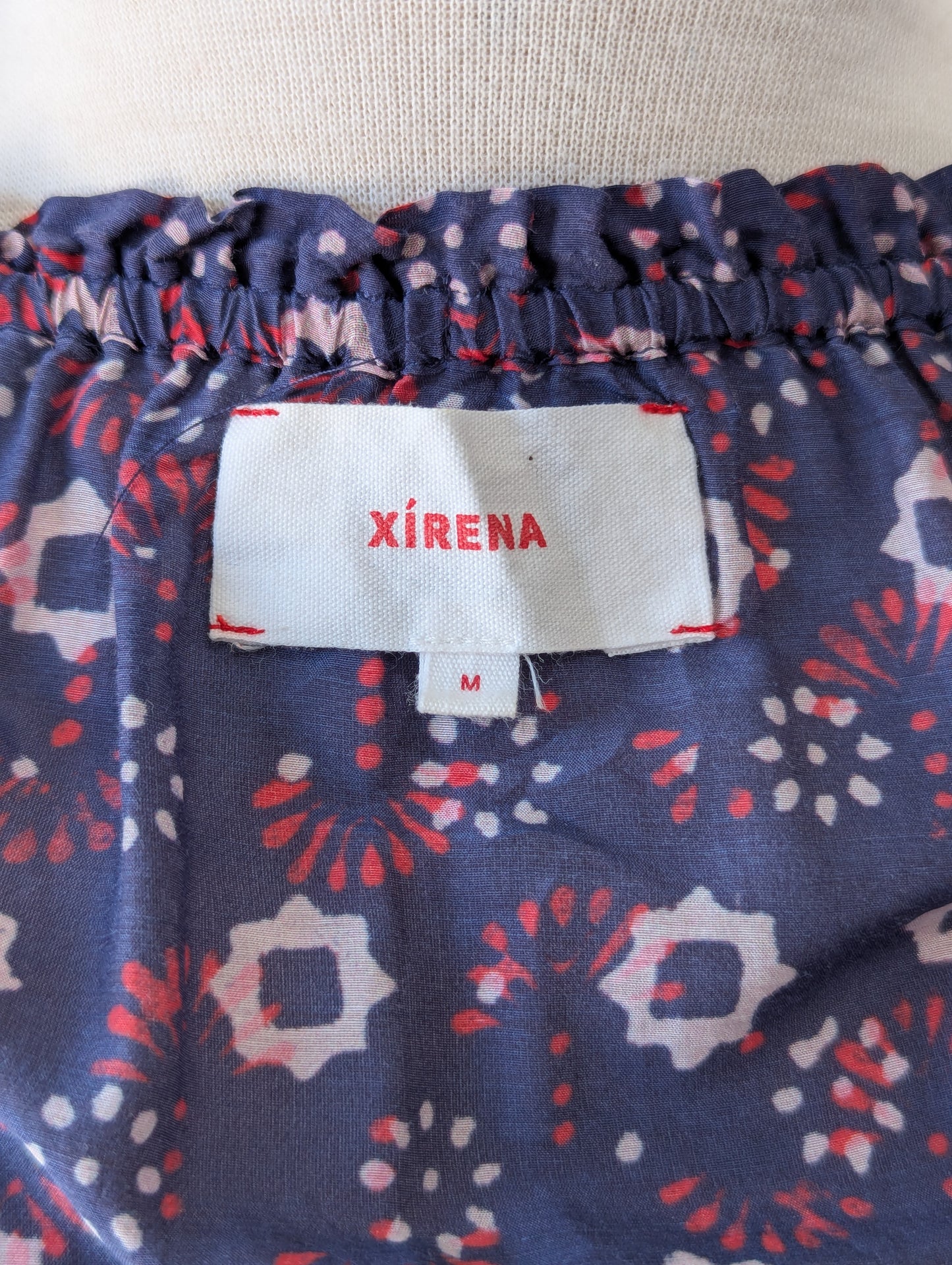 Breezy and effortless, this Xirena mini dress floats with every step. Its stamped-style print brings a hand-crafted charm that’s quietly striking. An elastic neckline and waist create soft shape, while a ruffled hem and full sleeves add a wink of movement. Oh, and it has pockets, because style this easy should also be practical. Consider it your go-anywhere, do-anything summer standby. Dress is in excellent condition and free of noticeable flaws.