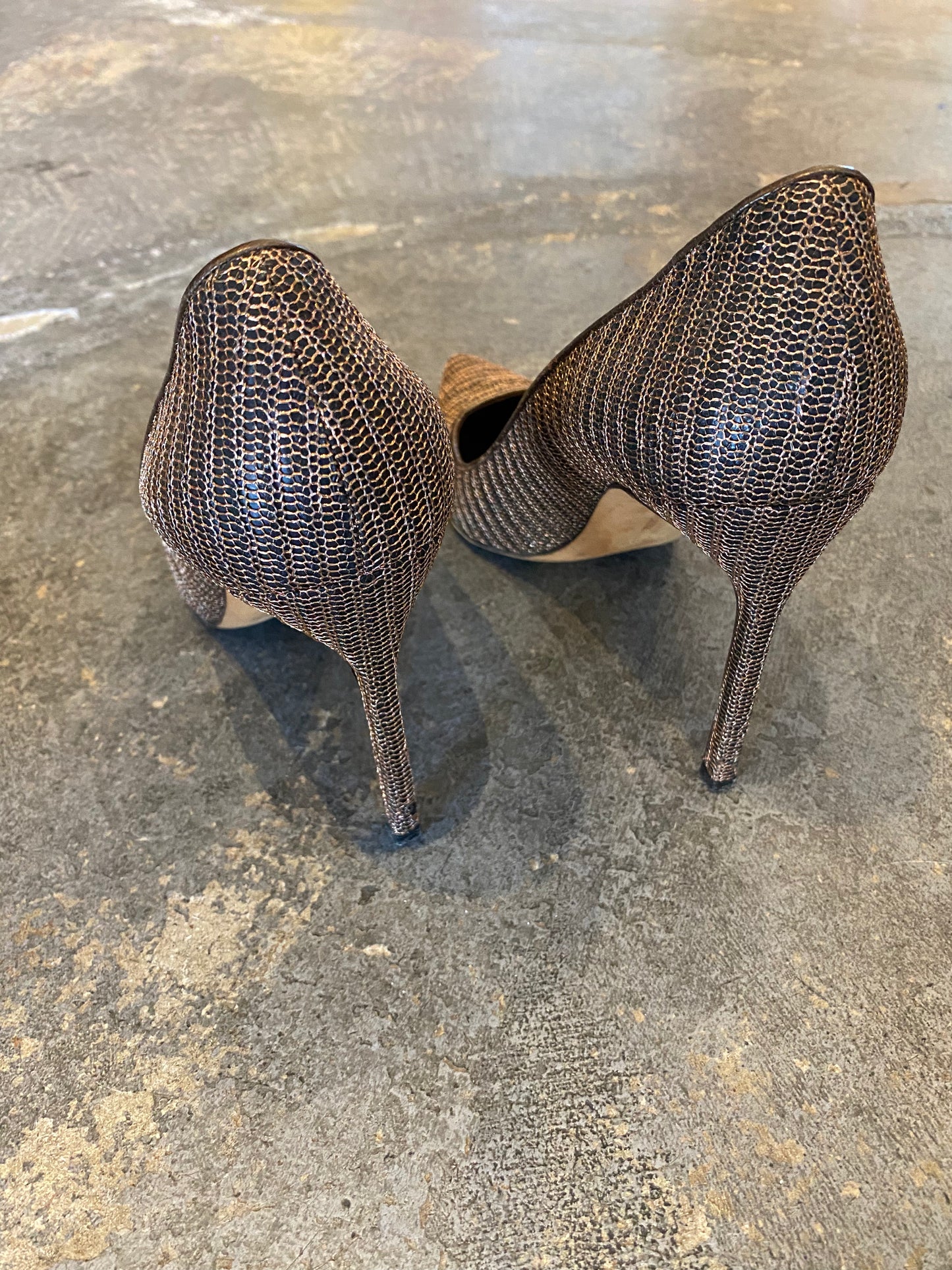 Chic copper textured leather pumps with Manolo’s signature sleek pointed toe and elegant silhouette. Versatile, polished, and perfect for day-to-night dressing.